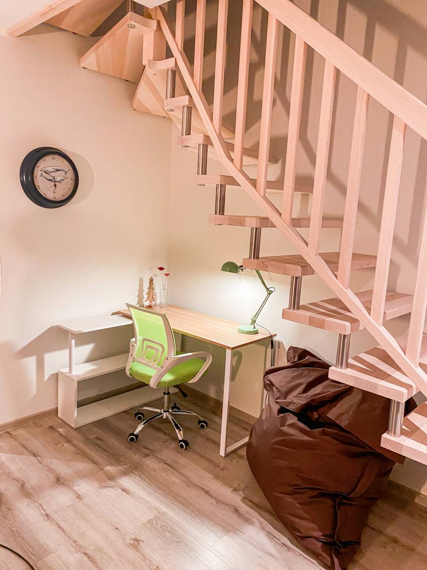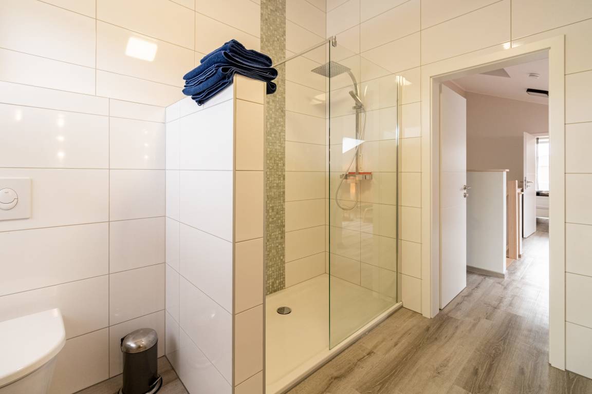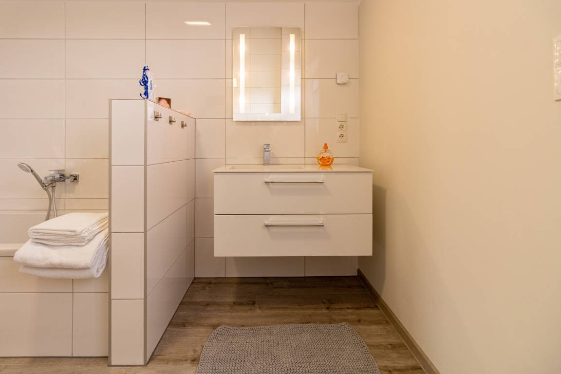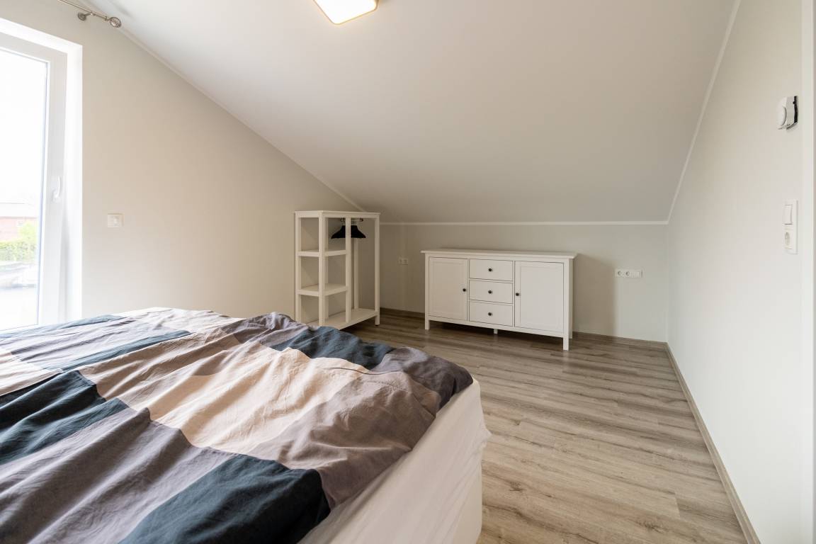 Auf der 2. Ebene befindet sich ein Schlafraum mit Komfortbetten, ein geräumiges Bad mit Fenster, Dusche u. Wanne, ein weiterer Schlafbereich mit Doppelbett, ein weiterer Wohnbereich, Hauswirtschaftsraum mit Waschmaschine und Trockner, Parkplatz am Haus und eine Strand-Fasssauna zur Nutzung nach Absprache auf dem Grundstück.