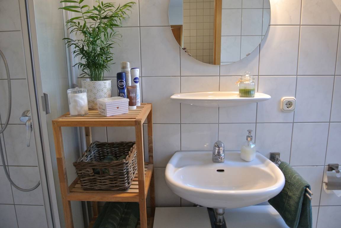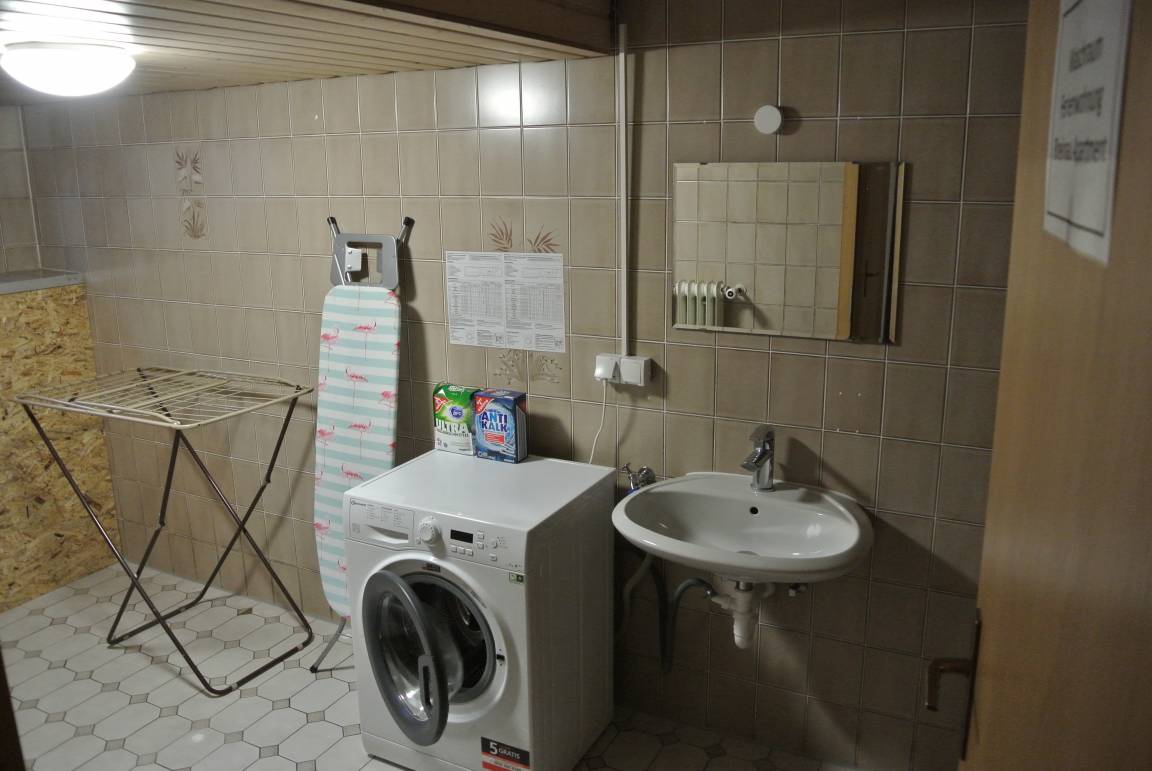 Im Keller steht ein Waschraum mit Waschmaschine, Wäscheständer, Bügelbrett und Bügeleisen zur kostenfreien Nutzung bereit.