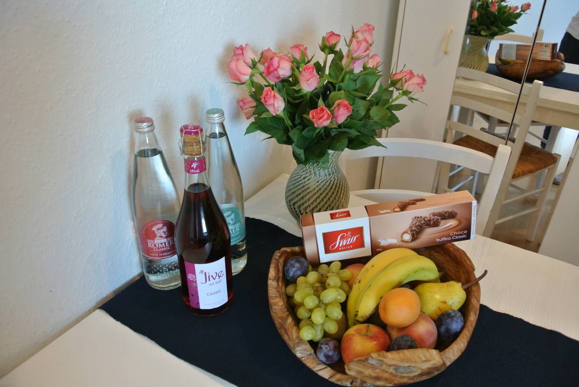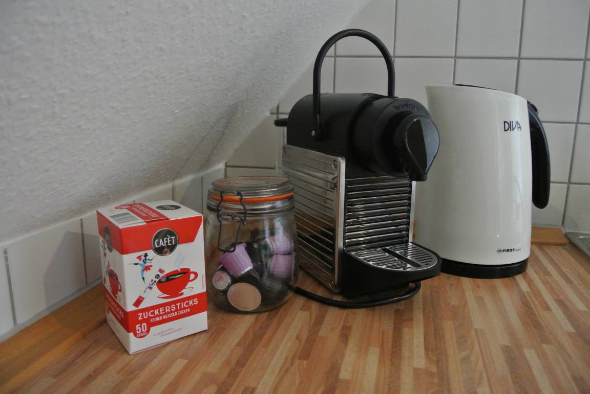 Zum Apartment gehören außerdem eine kleine Küchenzeile die an den Wohnbereich angrenzt, mit Nespresso Kaffeemaschine inkl. Pads, 2 Kochfelder, Mini-Backofen, Wasserkocher, Toaster und Kühlschrank sowie ein Bad mit Dusche, Toilette und Waschbecken.