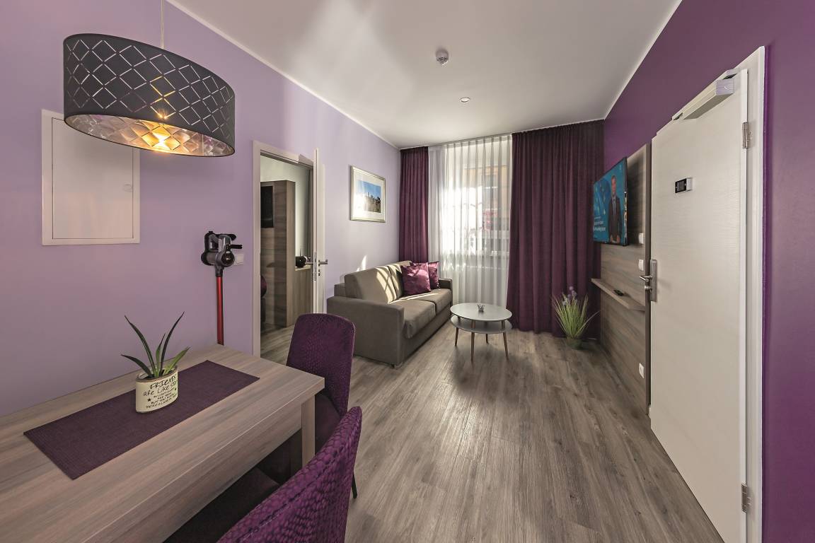 Im Haus Burgenheimat befinden sich 8 Apartments: 2 Princesize-Apartments F**** (20 - 30 m²), 1 Queensize-Apartment F*** (25 m²), 2 Queensize-Apartments F**** (30 - 40 m²) und 3 Kingsize-Apartments F**** (40 - 50 m²). Schlafen Sie wie ein König in den komfortablen überlangen Boxspringbetten (2,20 m) der Premium-Marke Royal Bedding®. Die Bettbreite beträgt in den Princesize-Apartments 1,00 m, in den Queensize-Apartments 1,60 m und in den Kingsize-Apartments 2,00 m. Alle Betten haben eine durchgängige extrahohe Matratze für besonderen Schlafkomfort. Im „Thronsaal", dem modernen Badezimmer, erwartet Sie ein WC mit integrierter Lüftung, ein stilvolles Waschbecken und eine bodengleiche Dusche mit Regenbrause und Handbrause. Die Küche ist mit allem, was man braucht, ausgestattet. Bereiten Sie sich z.B. ein leckeres Frühstück mit dem Tefal Toast'n'Egg und brühen sich Ihren Kaffee mit der Senseo Switch entweder mit Filter oder mit Kaffeepad. Auf dem 4-Platten-Cerankochfeld lassen sich auch komplette Menüs zubereiten. Eine Mikrowelle mit Grillfunktion sorgt für Essen in Minutenschnelle. Und damit der Abwasch nicht lästig wird, steht eine kompakte Geschirrspülmaschine bereit. Durchdachte Annehmlichkeiten erwarten Sie in jedem Raum der Apartments: ein digitaler Türspion, USB-Anschlüsse an den Leuchten am Bett sowie am Schreibtisch, eine integrierte Toilettenlüftung, eine bodengleiche Dusche mit Regenbrause, ein Laptop-Safe, überlange Betten, extrahohe Matratzen, große UHD-Smart-TVs, vollausgestattete Küche inkl. kompaktem Geschirrspüler. Neben der Selbstverpflegung besteht die Möglichkeit am Frühstücksbuffet des Hotels teilzunehmen. Als Gast erhalten Sie außerdem für die Dauer Ihres Aufenthalts ein kostenfreies Gästeticket für die Nutzung des ÖPNV im Gebiet des VRM.