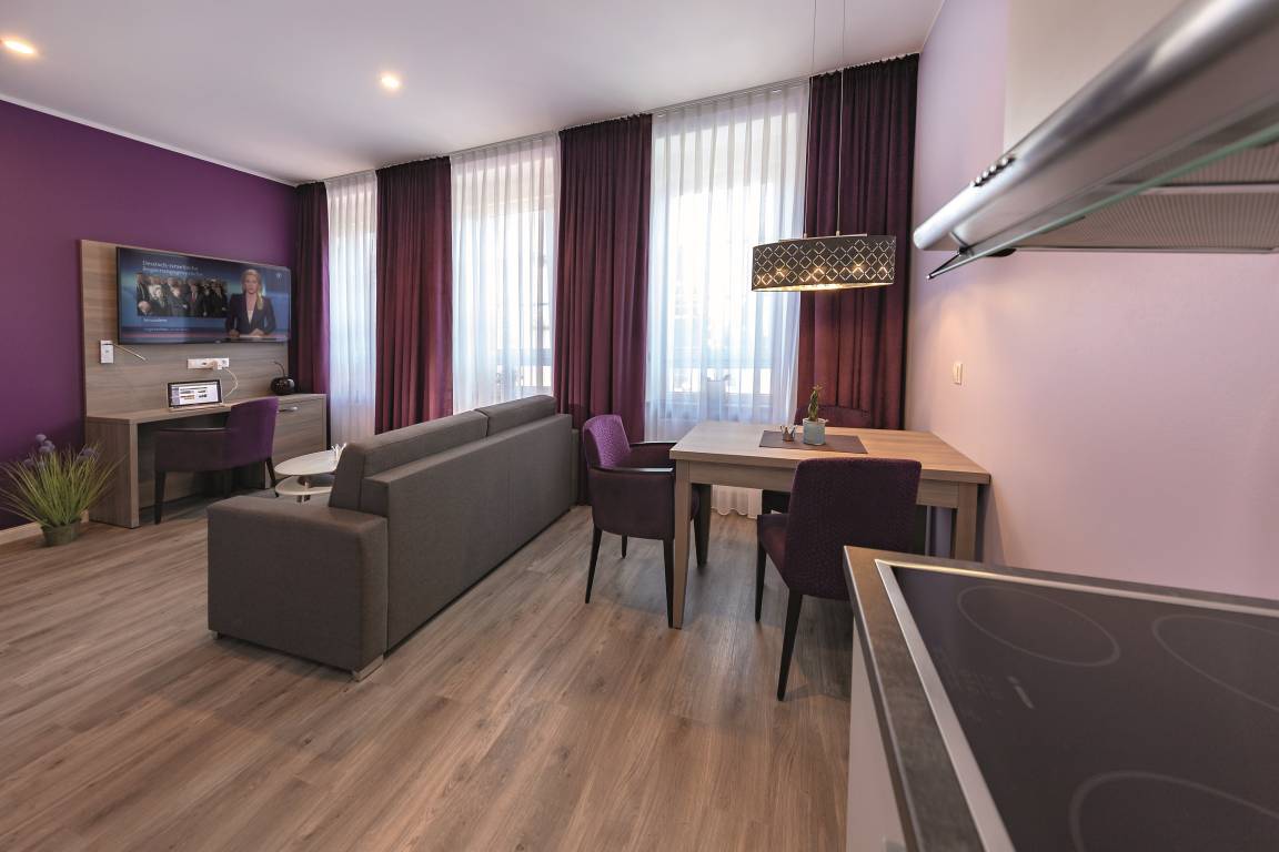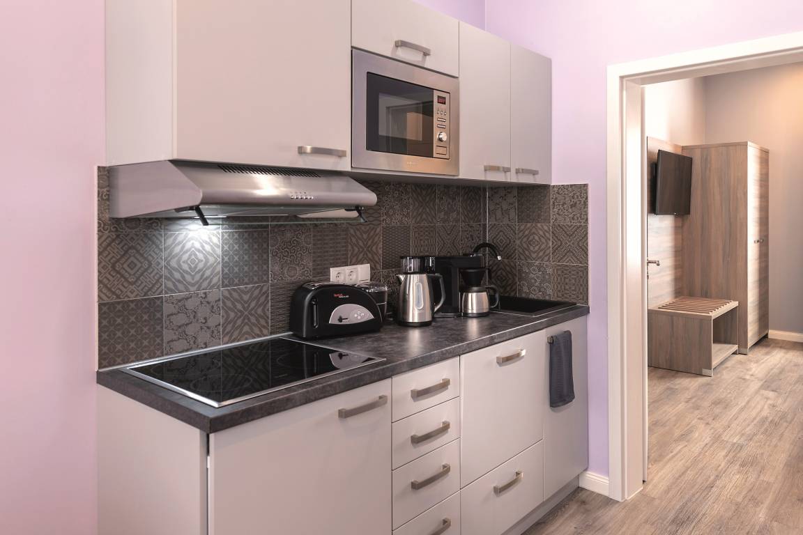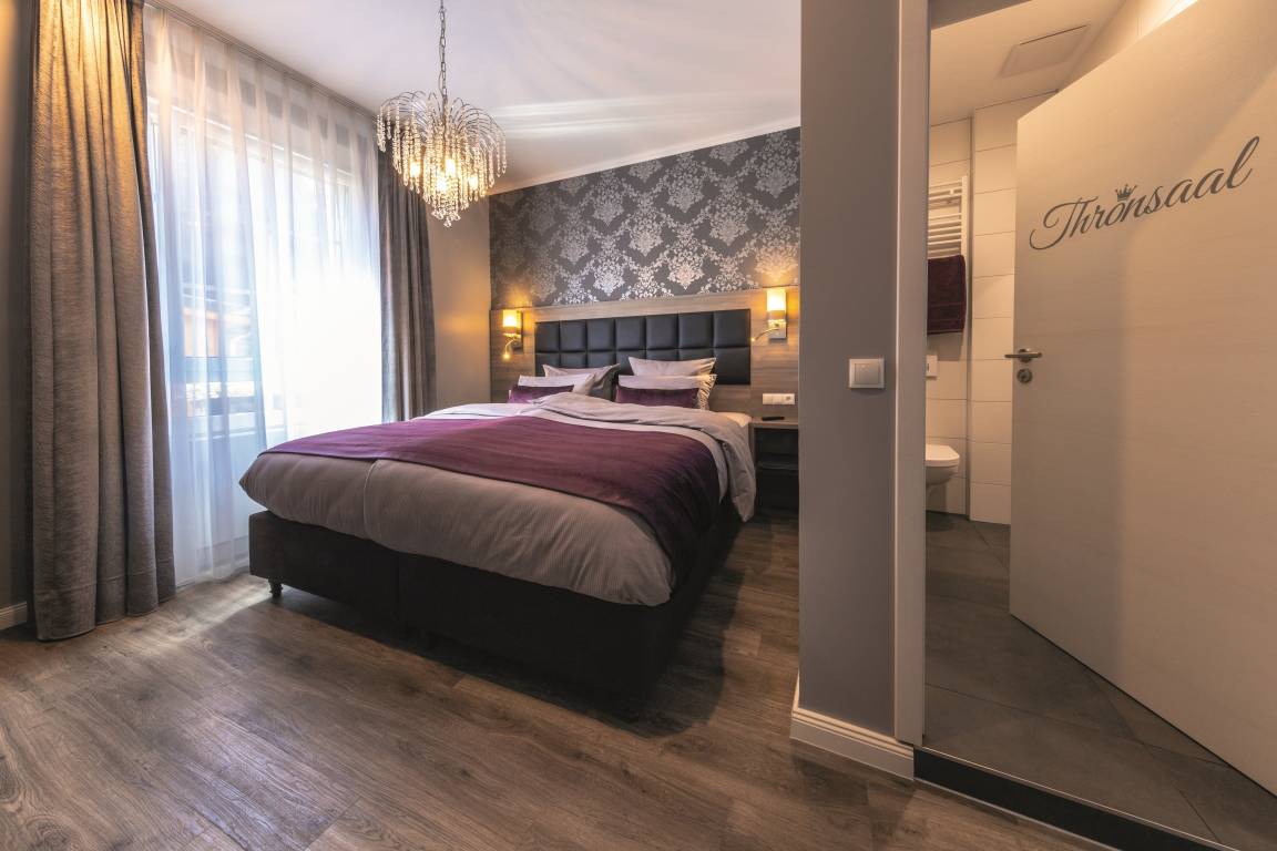 Im Haus Burgenheimat befinden sich 8 Apartments: 2 Princesize-Apartments F**** (20 - 30 m²), 1 Queensize-Apartment F*** (25 m²), 2 Queensize-Apartments F**** (30 - 40 m²) und 3 Kingsize-Apartments F**** (40 - 50 m²). Schlafen Sie wie ein König in den komfortablen überlangen Boxspringbetten (2,20 m) der Premium-Marke Royal Bedding®. Die Bettbreite beträgt in den Princesize-Apartments 1,00 m, in den Queensize-Apartments 1,60 m und in den Kingsize-Apartments 2,00 m. Alle Betten haben eine durchgängige extrahohe Matratze für besonderen Schlafkomfort. Im „Thronsaal", dem modernen Badezimmer, erwartet Sie ein WC mit integrierter Lüftung, ein stilvolles Waschbecken und eine bodengleiche Dusche mit Regenbrause und Handbrause. Die Küche ist mit allem, was man braucht, ausgestattet. Bereiten Sie sich z.B. ein leckeres Frühstück mit dem Tefal Toast'n'Egg und brühen sich Ihren Kaffee mit der Senseo Switch entweder mit Filter oder mit Kaffeepad. Auf dem 4-Platten-Cerankochfeld lassen sich auch komplette Menüs zubereiten. Eine Mikrowelle mit Grillfunktion sorgt für Essen in Minutenschnelle. Und damit der Abwasch nicht lästig wird, steht eine kompakte Geschirrspülmaschine bereit. Durchdachte Annehmlichkeiten erwarten Sie in jedem Raum der Apartments: ein digitaler Türspion, USB-Anschlüsse an den Leuchten am Bett sowie am Schreibtisch, eine integrierte Toilettenlüftung, eine bodengleiche Dusche mit Regenbrause, ein Laptop-Safe, überlange Betten, extrahohe Matratzen, große UHD-Smart-TVs, vollausgestattete Küche inkl. kompaktem Geschirrspüler. Neben der Selbstverpflegung besteht die Möglichkeit am Frühstücksbuffet des Hotels teilzunehmen. Als Gast erhalten Sie außerdem für die Dauer Ihres Aufenthalts ein kostenfreies Gästeticket für die Nutzung des ÖPNV im Gebiet des VRM.