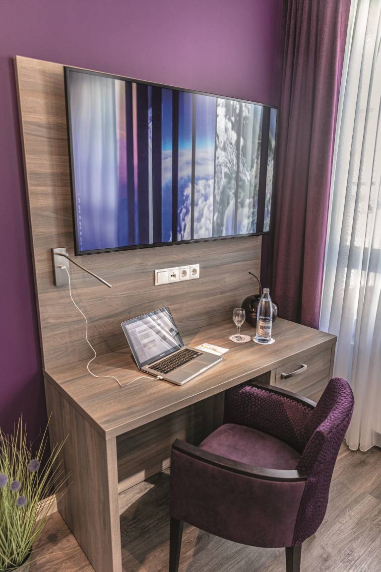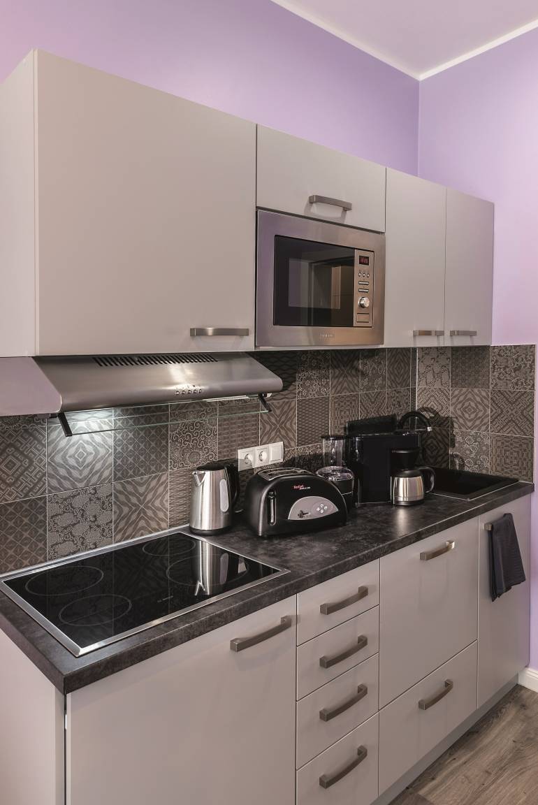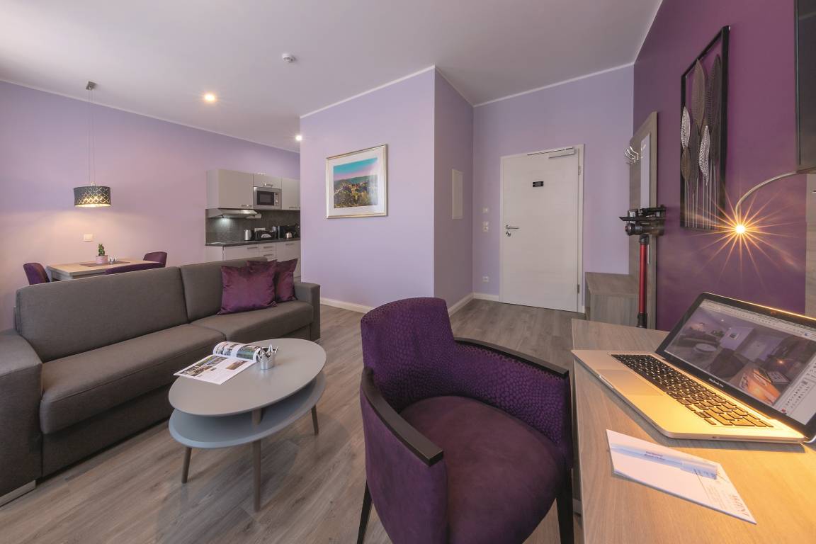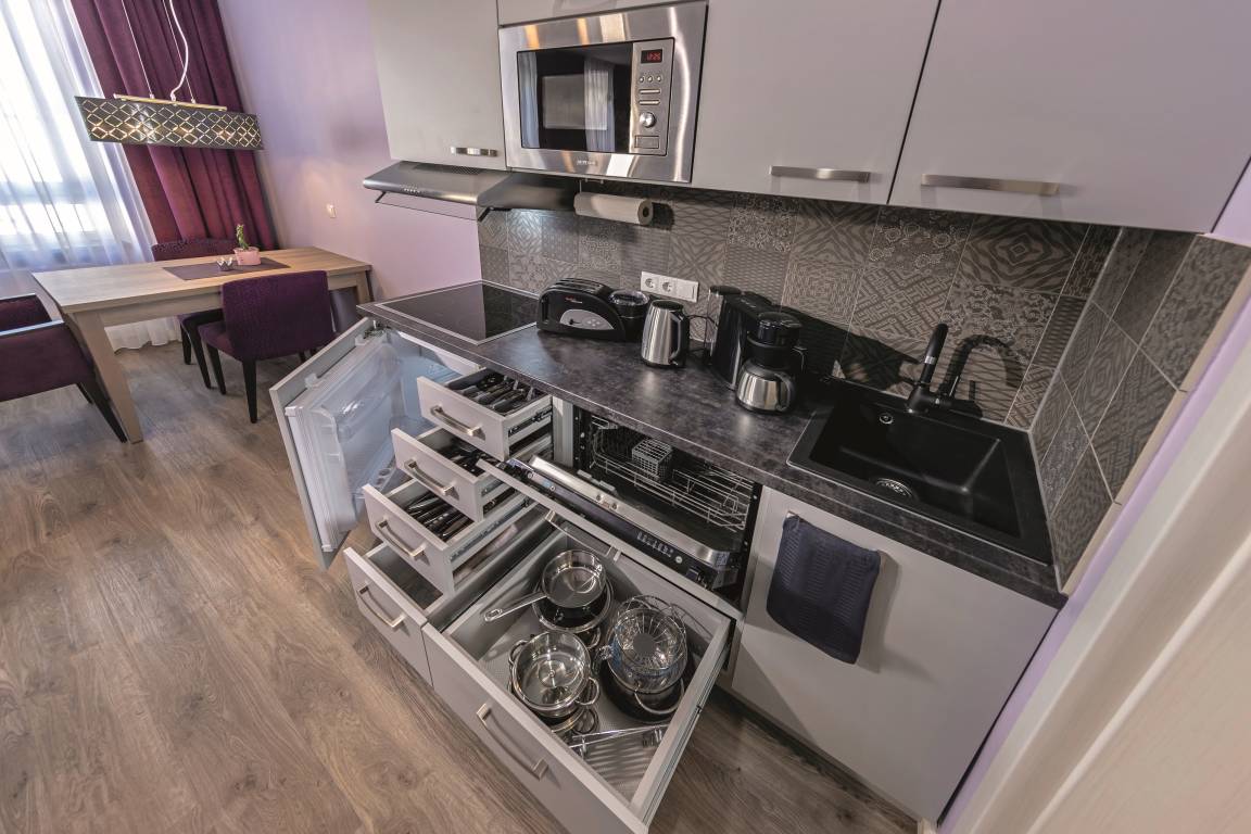 Im Haus Burgenheimat befinden sich 8 Apartments: 2 Princesize-Apartments F**** (20 - 30 m²), 1 Queensize-Apartment F*** (25 m²), 2 Queensize-Apartments F**** (30 - 40 m²) und 3 Kingsize-Apartments F**** (40 - 50 m²). Schlafen Sie wie ein König in den komfortablen überlangen Boxspringbetten (2,20 m) der Premium-Marke Royal Bedding®. Die Bettbreite beträgt in den Princesize-Apartments 1,00 m, in den Queensize-Apartments 1,60 m und in den Kingsize-Apartments 2,00 m. Alle Betten haben eine durchgängige extrahohe Matratze für besonderen Schlafkomfort. Im „Thronsaal", dem modernen Badezimmer, erwartet Sie ein WC mit integrierter Lüftung, ein stilvolles Waschbecken und eine bodengleiche Dusche mit Regenbrause und Handbrause. Die Küche ist mit allem, was man braucht, ausgestattet. Bereiten Sie sich z.B. ein leckeres Frühstück mit dem Tefal Toast'n'Egg und brühen sich Ihren Kaffee mit der Senseo Switch entweder mit Filter oder mit Kaffeepad. Auf dem 4-Platten-Cerankochfeld lassen sich auch komplette Menüs zubereiten. Eine Mikrowelle mit Grillfunktion sorgt für Essen in Minutenschnelle. Und damit der Abwasch nicht lästig wird, steht eine kompakte Geschirrspülmaschine bereit. Durchdachte Annehmlichkeiten erwarten Sie in jedem Raum der Apartments: ein digitaler Türspion, USB-Anschlüsse an den Leuchten am Bett sowie am Schreibtisch, eine integrierte Toilettenlüftung, eine bodengleiche Dusche mit Regenbrause, ein Laptop-Safe, überlange Betten, extrahohe Matratzen, große UHD-Smart-TVs, vollausgestattete Küche inkl. kompaktem Geschirrspüler. Neben der Selbstverpflegung besteht die Möglichkeit am Frühstücksbuffet des Hotels teilzunehmen. Als Gast erhalten Sie außerdem für die Dauer Ihres Aufenthalts ein kostenfreies Gästeticket für die Nutzung des ÖPNV im Gebiet des VRM.