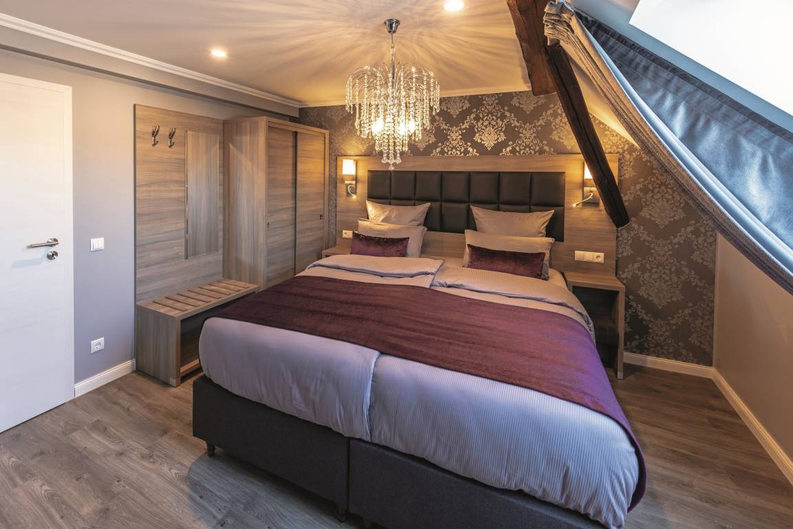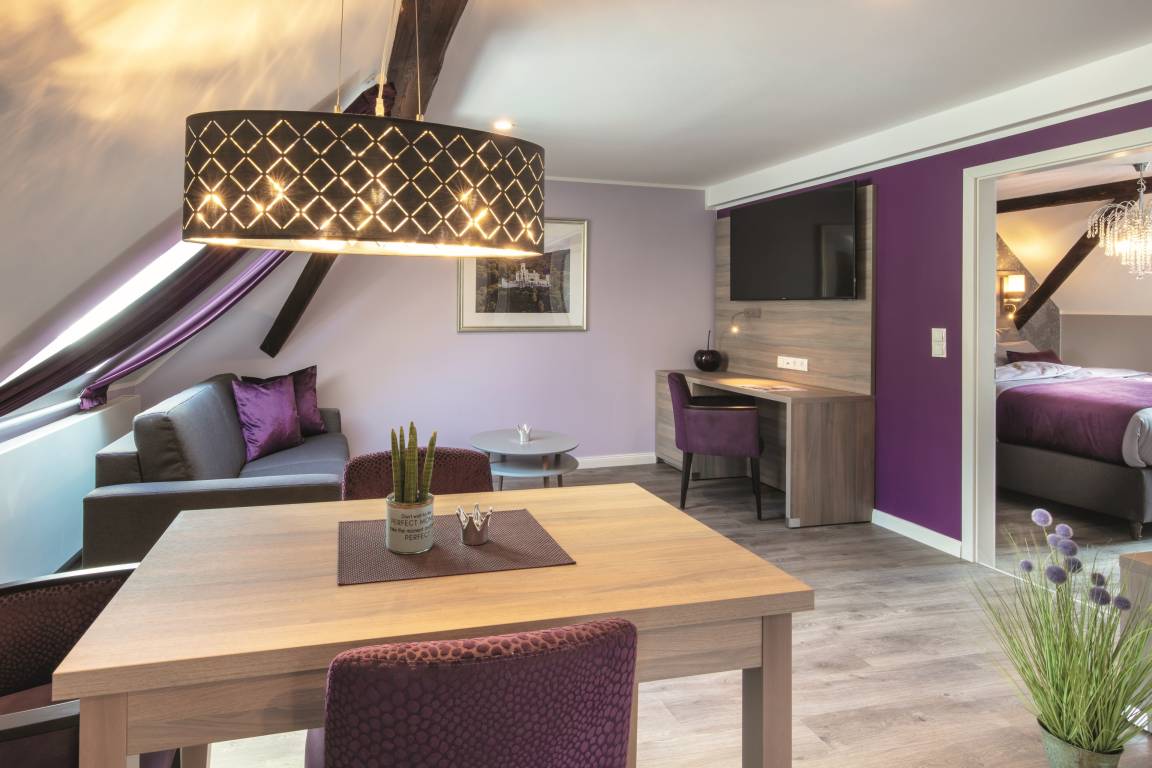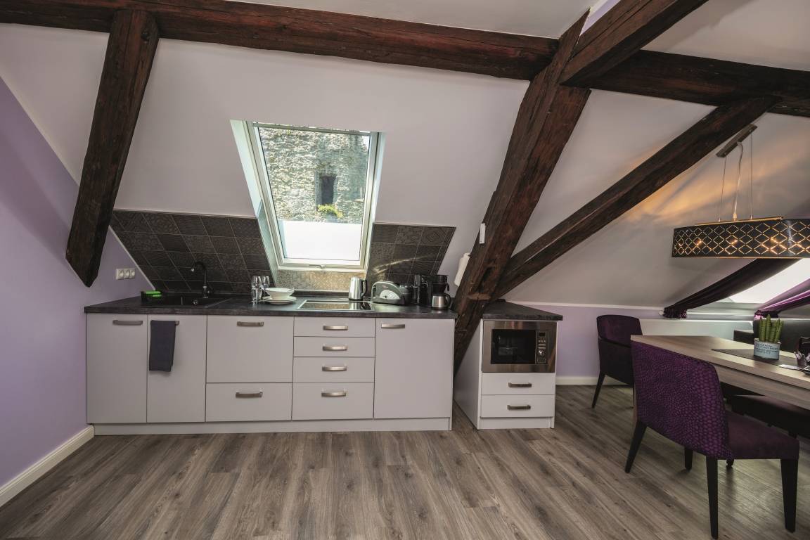 Im Haus Burgenheimat befinden sich 8 Apartments: 2 Princesize-Apartments F**** (20 - 30 m²), 1 Queensize-Apartment F*** (25 m²), 2 Queensize-Apartments F**** (30 - 40 m²) und 3 Kingsize-Apartments F**** (40 - 50 m²). Schlafen Sie wie ein König in den komfortablen überlangen Boxspringbetten (2,20 m) der Premium-Marke Royal Bedding®. Die Bettbreite beträgt in den Princesize-Apartments 1,00 m, in den Queensize-Apartments 1,60 m und in den Kingsize-Apartments 2,00 m. Alle Betten haben eine durchgängige extrahohe Matratze für besonderen Schlafkomfort. Im "Thronsaal", dem modernen Badezimmer, erwartet Sie ein WC mit integrierter Lüftung, ein stilvolles Waschbecken und eine bodengleiche Dusche mit Regenbrause und Handbrause. Die Küche ist mit allem, was man braucht, ausgestattet. Bereiten Sie sich z.B. ein leckeres Frühstück mit dem Tefal Toast'n'Egg und brühen sich Ihren Kaffee mit der Senseo Switch entweder mit Filter oder mit Kaffeepad. Auf dem 4-Platten-Cerankochfeld lassen sich auch komplette Menüs zubereiten. Eine Mikrowelle mit Grillfunktion sorgt für Essen in Minutenschnelle. Und damit der Abwasch nicht lästig wird, steht eine kompakte Geschirrspülmaschine bereit. Durchdachte Annehmlichkeiten erwarten Sie in jedem Raum der Apartments: ein digitaler Türspion, USB-Anschlüsse an den Leuchten am Bett sowie am Schreibtisch, eine integrierte Toilettenlüftung, eine bodengleiche Dusche mit Regenbrause, ein Laptop-Safe, überlange Betten, extrahohe Matratzen, große UHD-Smart-TVs, vollausgestattete Küche inkl. kompaktem Geschirrspüler. Neben der Selbstverpflegung besteht die Möglichkeit am Frühstücksbuffet des Hotels teilzunehmen. Als Gast erhalten Sie außerdem für die Dauer Ihres Aufenthalts ein kostenfreies Gästeticket für die Nutzung des ÖPNV im Gebiet des VRM.