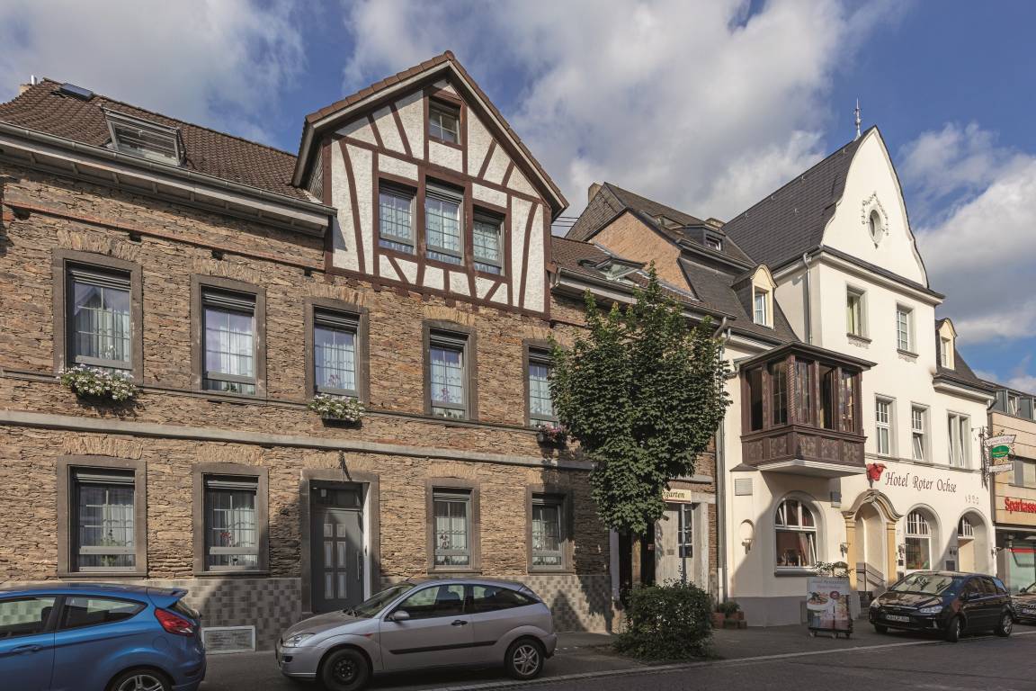 Das Haus Burgenheimat befindet sich im malerischen Ortskern von Rhens, einem historischen Städtchen zwischen Koblenz und Boppard. Die 8 liebevoll eingerichteten Apartments im Haus gehören zum AKZENT Hotel "Roter Ochse" direkt nebenan und haben ein komfortables Schlafzimmer mit überlangem Bett, ein modernes Badezimmer und einen gemütlichen Wohnbereich mit integrierter Küche und Essbereich.