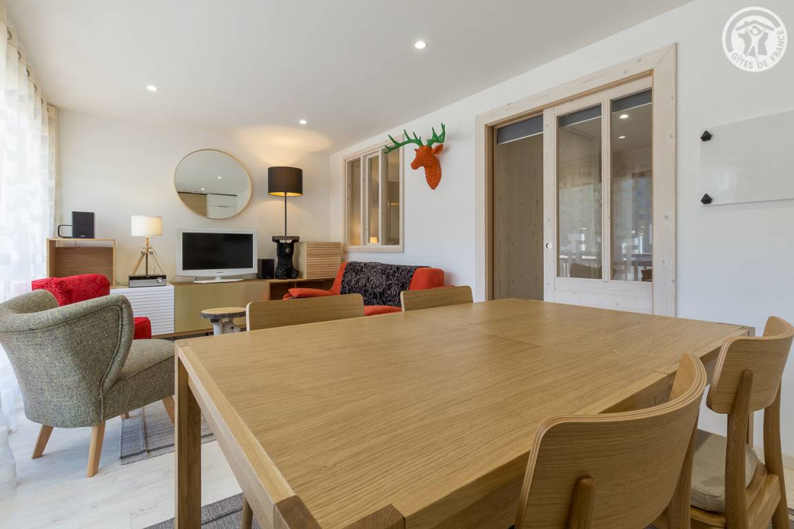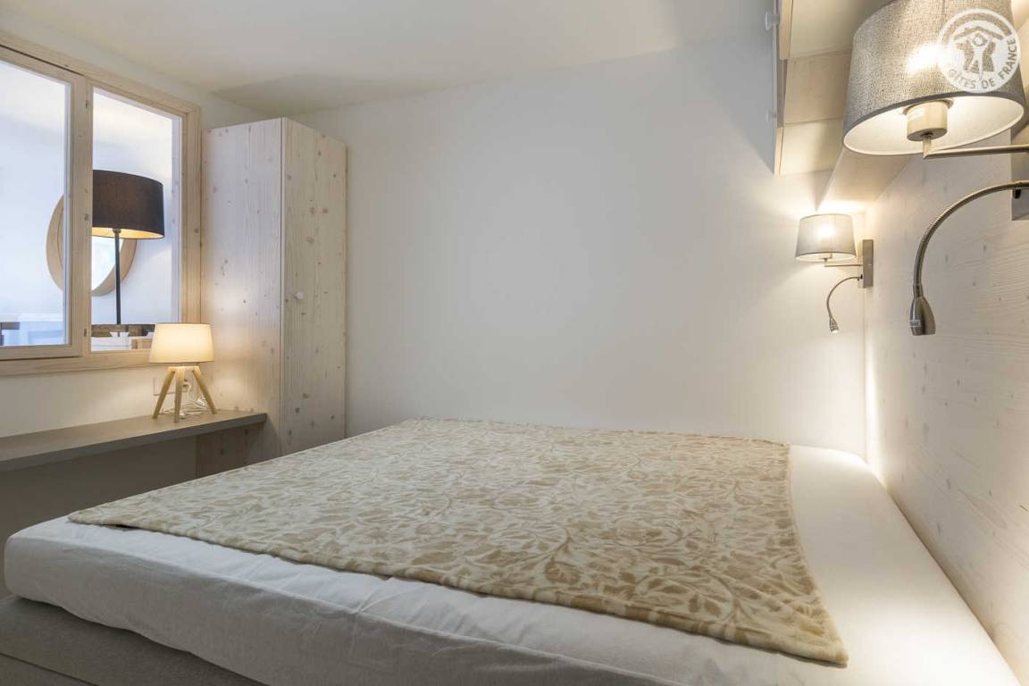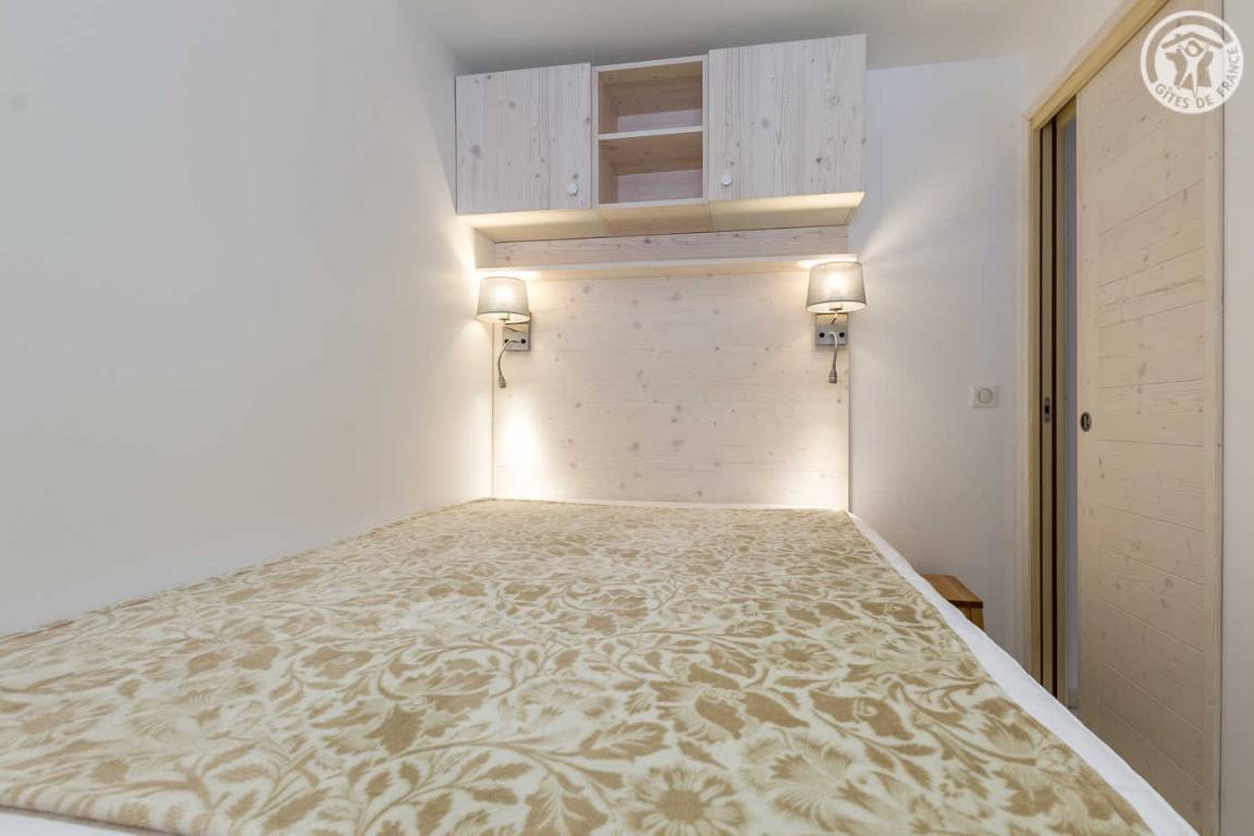 Residenz aus dem Jahr 1963, 2019 renoviert. Eingeschossige, 2019 komplett renovierte Wohnung im 3. Stock (Aufzug): Wohnküche (1 Schlafsofa 140x190 cm), 1 Schlafzimmer mit Fenster am zweiten Tag (1 Doppelbett 140x190 cm). cm) und 1 Schlafbereich (2 einzelne Klapp-Etagenbetten in 80x190 cm), Badezimmer (Dusche), separates WC. Balkon-Terrasse von 10 m². Skiraum. Bettwäsche + Badezimmerwäsche-Set für 20 €/Person.