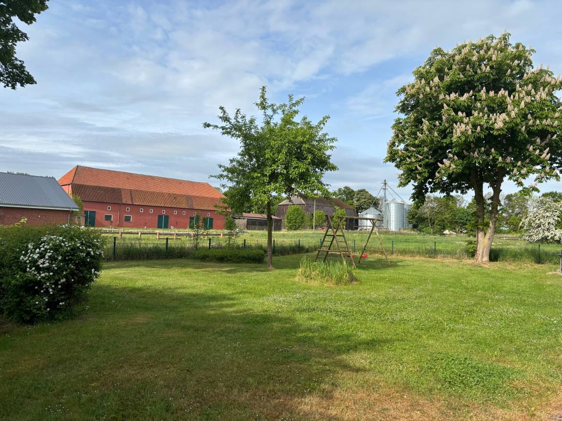 Auf der direkt am Haus gelegenen Terrasse mit Sicht auf Wiesen und Gutsanlage laden Gartenmöbel und Holzkohlegrill zum Verweilen ein und der großzügig angelegte, eingezäunte Garten bietet ausreichend Platz für Zwei- und Vierbeiner. Ein Kamin sorgt auch in kälterer Jahreszeit für wohlig warme Atmosphäre.