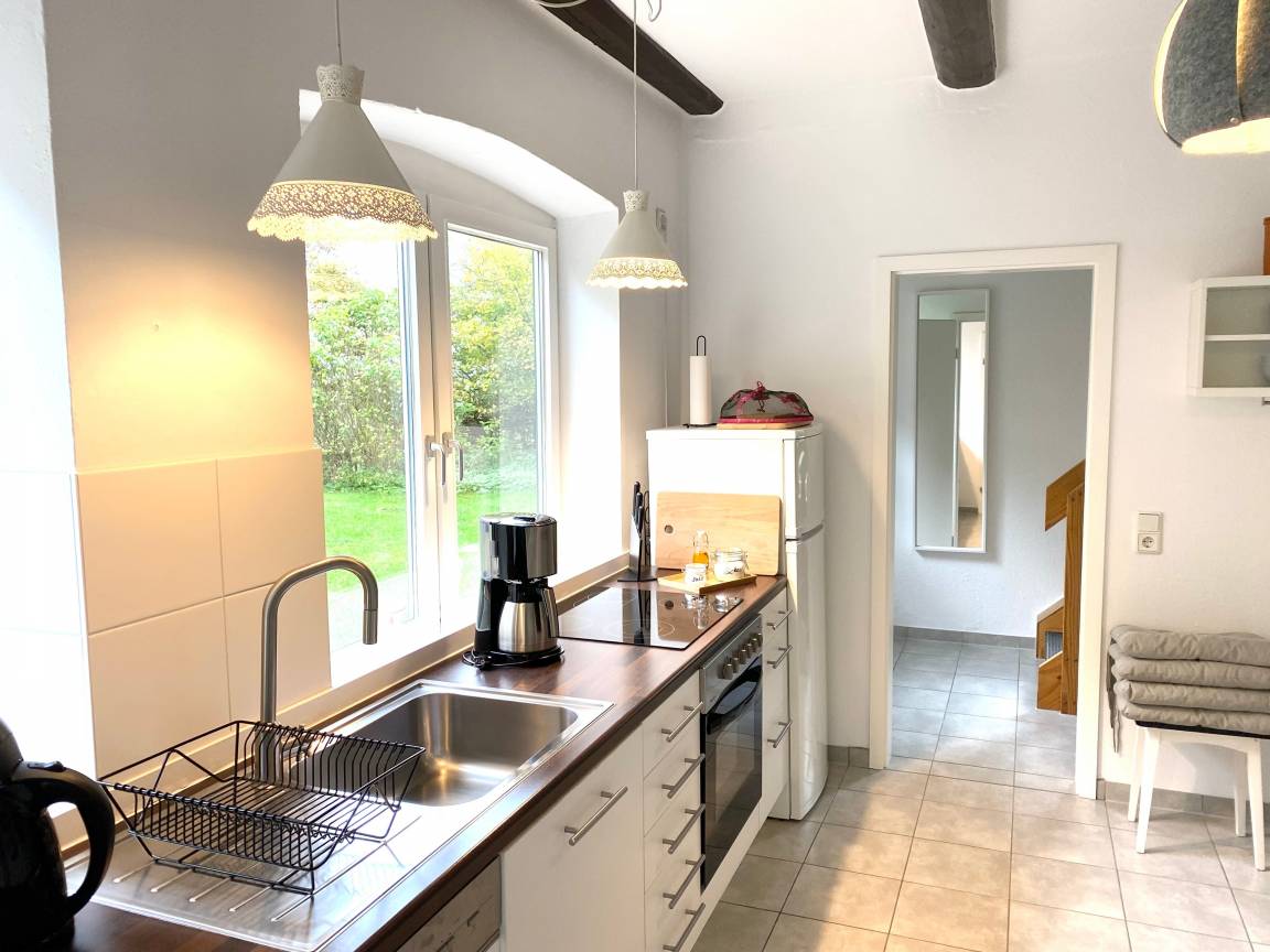Auf der direkt am Haus gelegenen Terrasse mit Sicht auf Wiesen und Gutsanlage laden Gartenmöbel und Holzkohlegrill zum Verweilen ein und der großzügig angelegte Garten bietet ausreichend Platz für Zwei- und Vierbeiner. Ein Kamin sorgt auch in kälterer Jahreszeit für wohlig warme Atmosphäre.