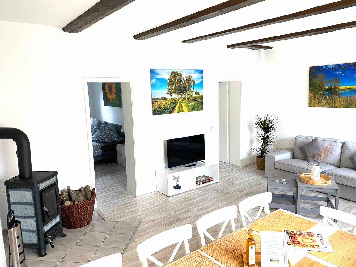 Das Gebäude verfügt auf 125 qm über einen Wohn/Esszimmerbereich mit angrenzender Küche, zwei Schlafzimmern mit Doppelbetten, einem Kinderzimmer mit ausziehbaren Tagesbett für zwei Personen und einem Raum mit Schlafsofa, sowie einem Duschbad und einem Wannenbad.
