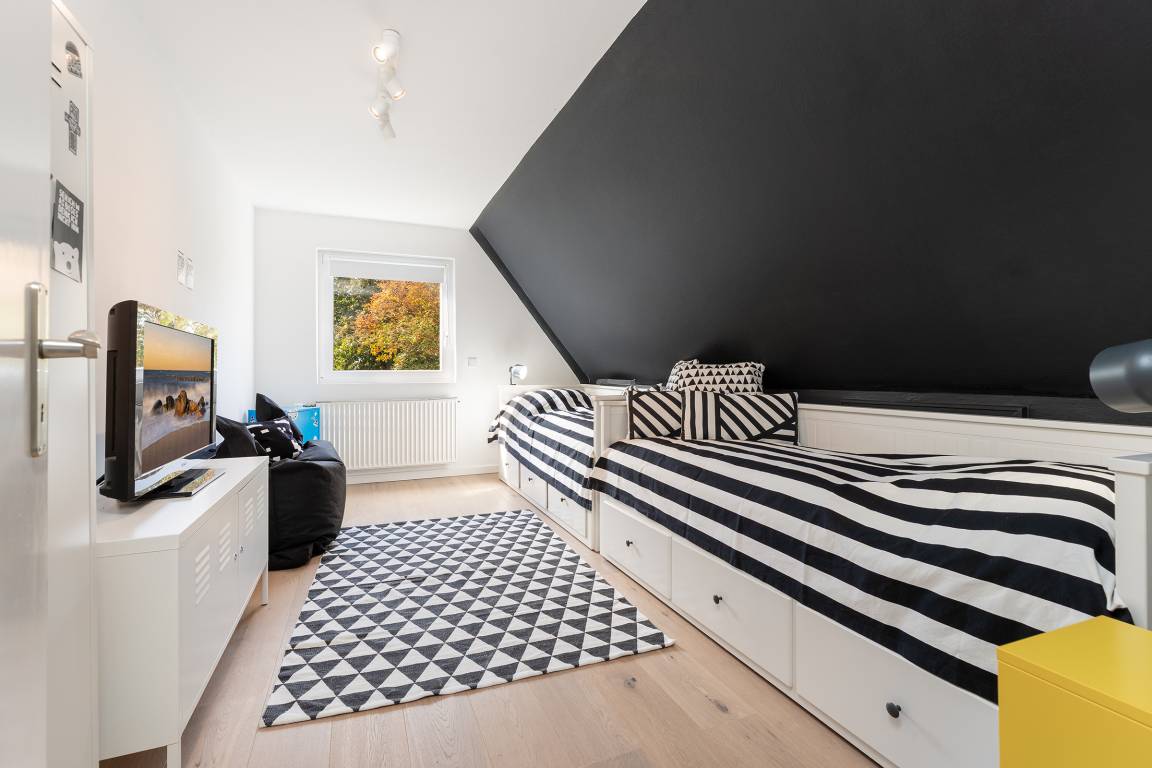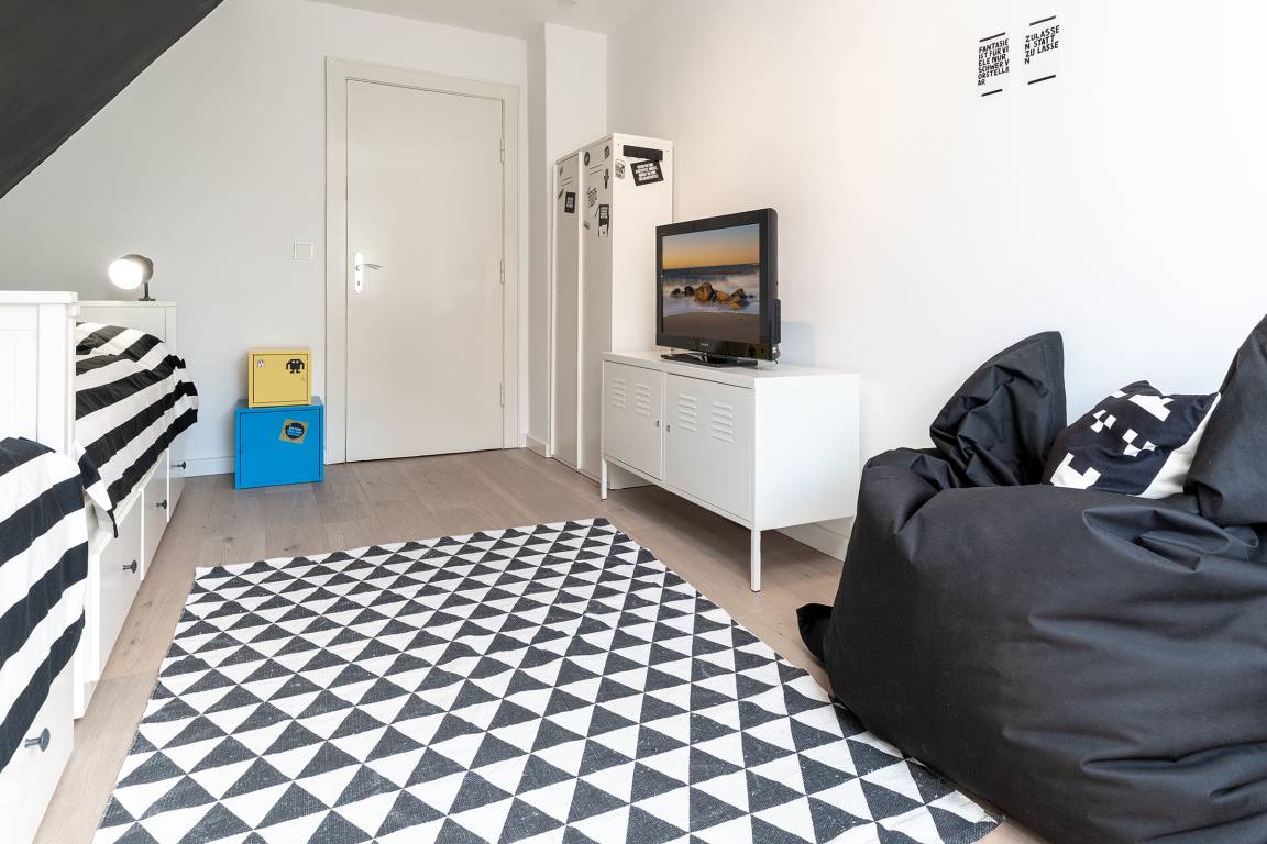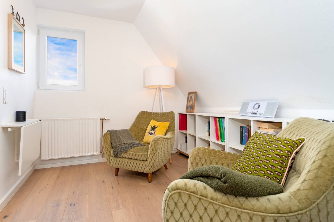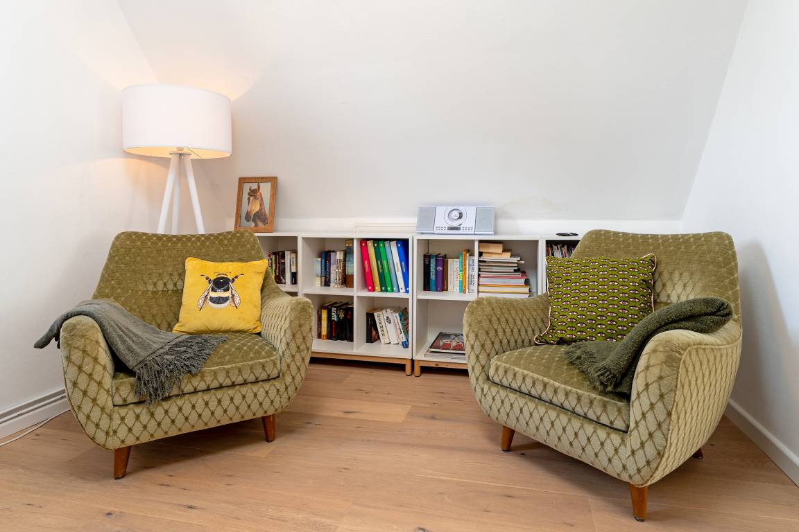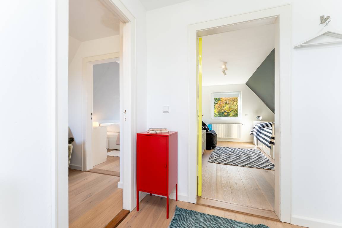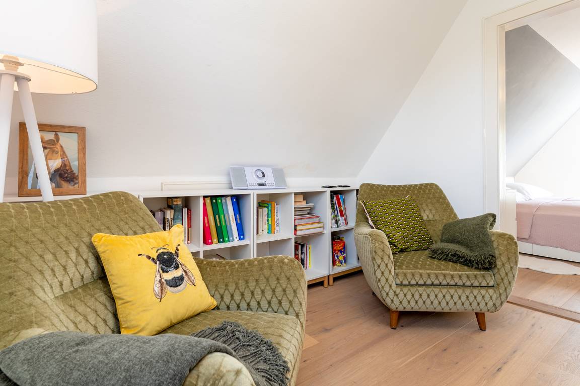 Das tageslichthelle und stilsichere Designbad begeistert mit bodentiefer Dusche, Fußbodenheizung, Waschmaschine, Trockner, beleuchtetem Spiegel und rundum gelungenem Ambiente. Im 1. Obergeschoss befinden sich beide Schlafzimmer: Eines der Schlafzimmer ist mit einem Doppelbett (2x 90x200 cm), Kommode und zwei Nachttischen möbliert, das zweite Schlafzimmer ist mit zwei Einzelbetten (je 80x200 cm), Kommode und TV ausgestattet. Gemütliche Sitzsäcke und eine Sitzecke mit zwei Cocktailsesseln laden im Obergeschoss zum Lümmeln und Entspannen ein. An grauen Tagen vertreiben Sie sich die Zeit mit der großen Spielesammlung oder schmökern in den vorhandenen Büchern und Zeitschriften.