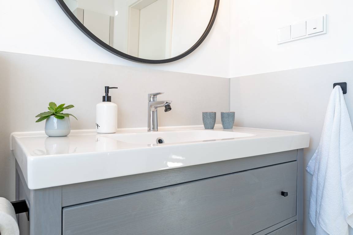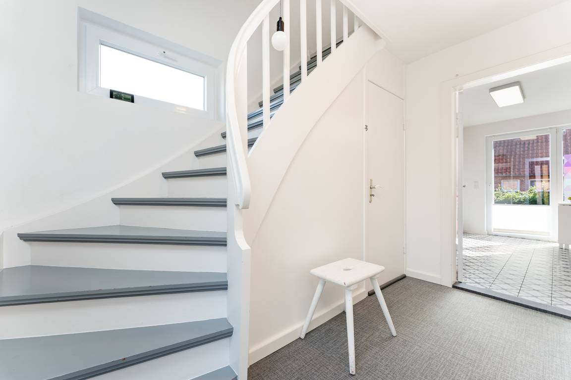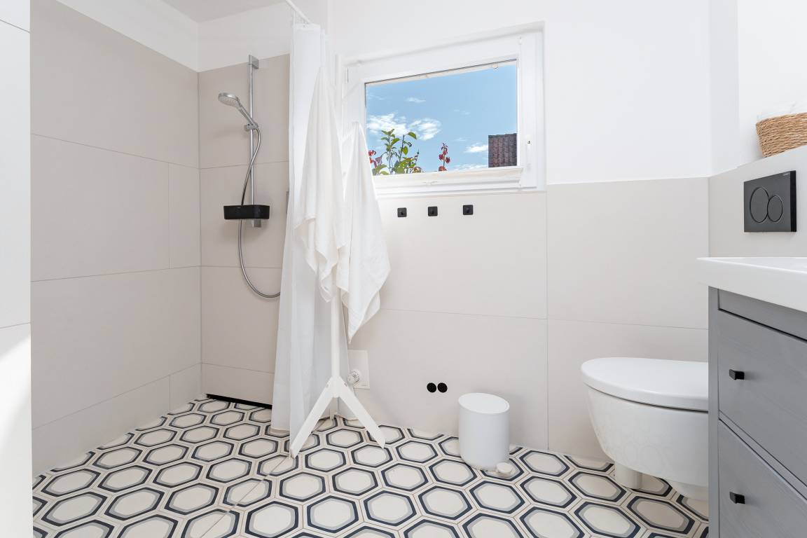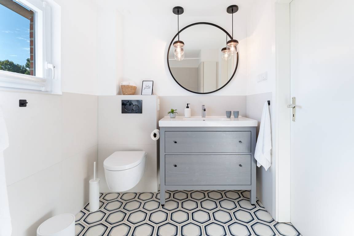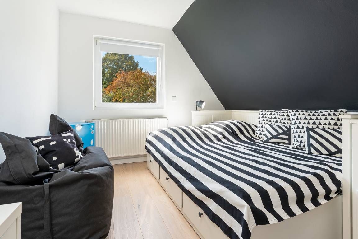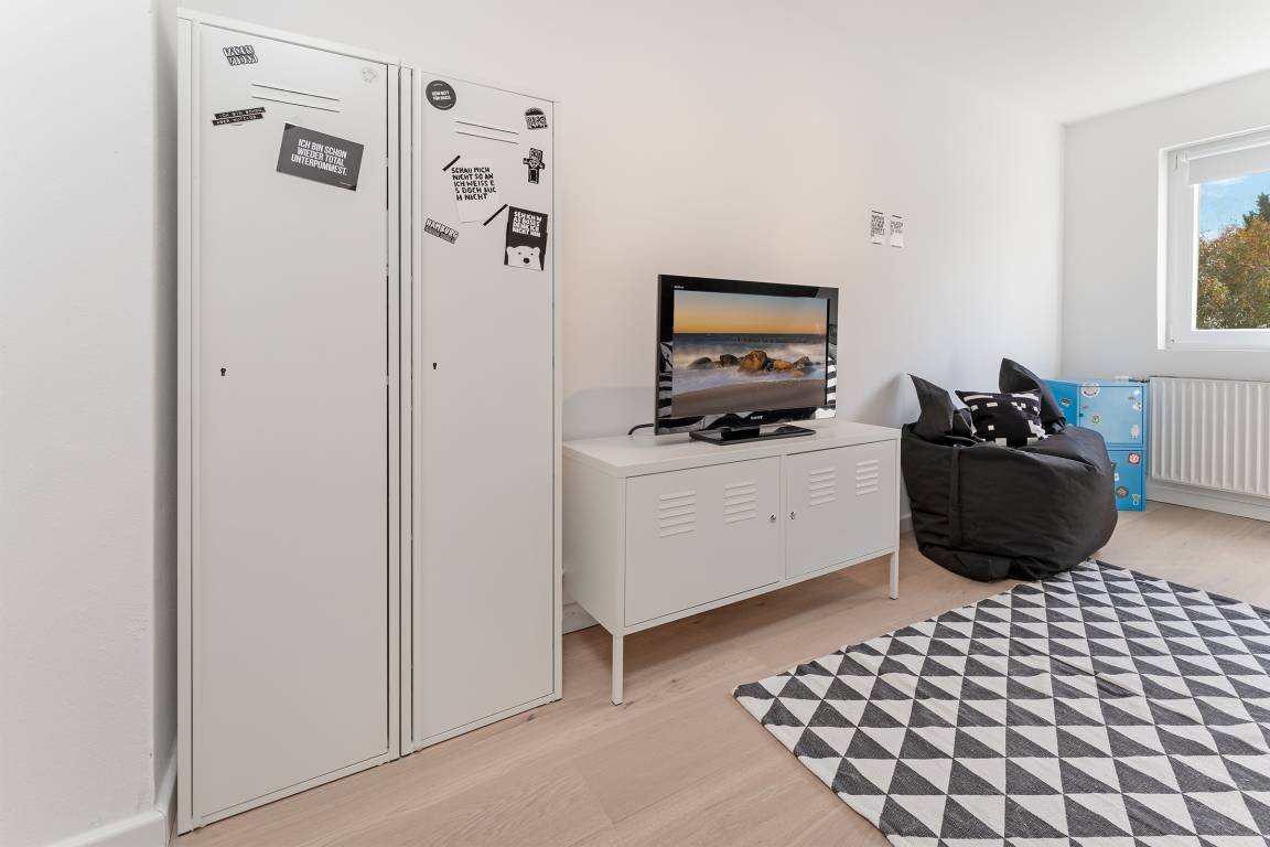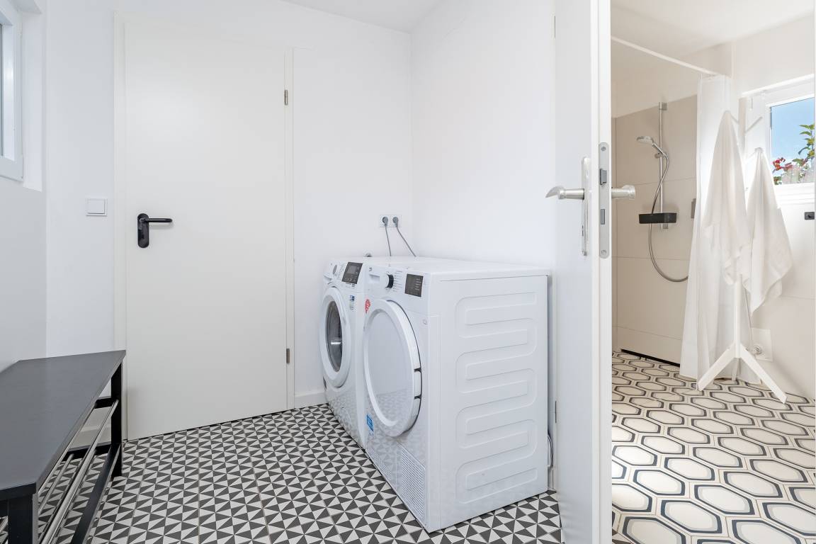 Das tageslichthelle und stilsichere Designbad begeistert mit bodentiefer Dusche, Fußbodenheizung, Waschmaschine, Trockner, beleuchtetem Spiegel und rundum gelungenem Ambiente. Im 1. Obergeschoss befinden sich beide Schlafzimmer: Eines der Schlafzimmer ist mit einem Doppelbett (2x 90x200 cm), Kommode und zwei Nachttischen möbliert, das zweite Schlafzimmer ist mit zwei Einzelbetten (je 80x200 cm), Kommode und TV ausgestattet. Gemütliche Sitzsäcke und eine Sitzecke mit zwei Cocktailsesseln laden im Obergeschoss zum Lümmeln und Entspannen ein. An grauen Tagen vertreiben Sie sich die Zeit mit der großen Spielesammlung oder schmökern in den vorhandenen Büchern und Zeitschriften.