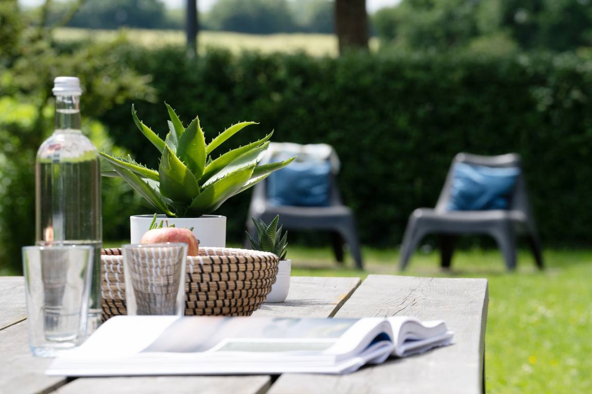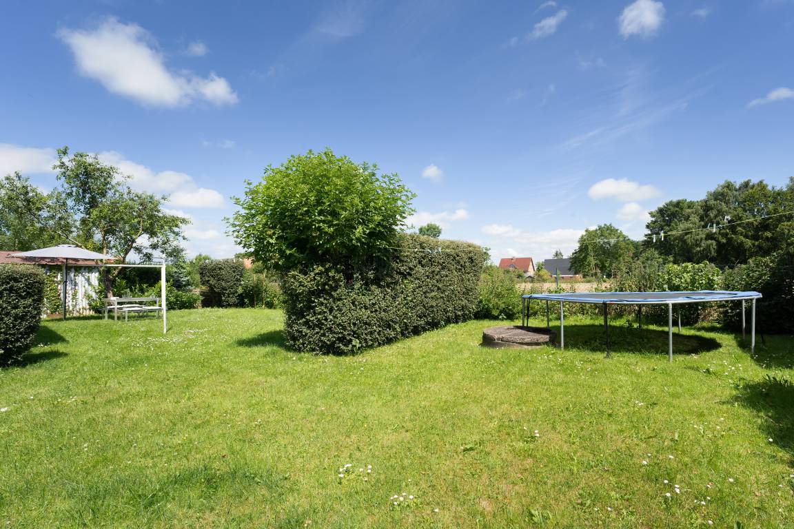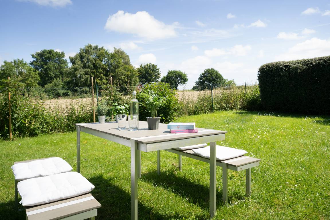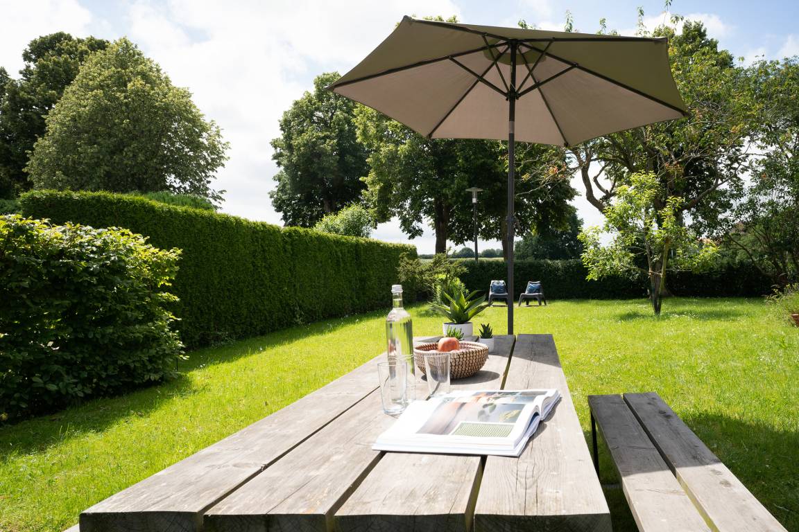 Der idyllisch angelegte Garten bietet viele schöne Rückzugsorte: ein großzügiger Essplatz im Außenbereich, eine Gartenbank Richtung Feldrand sowie zwei Outdoor-Sessel unter Obstbäumen. Als zusätzliche Highlights gibt es ein großes Gartentrampolin für die kleinen Gäste zum Austoben, Außenspiele wie z. B. Federball, Wikingerschach und sogar eine Hängematte.