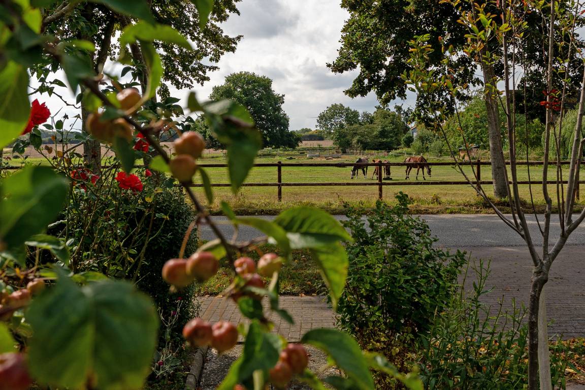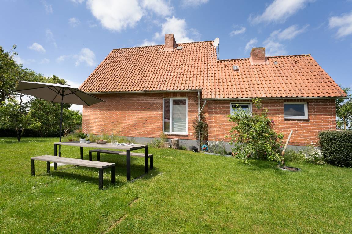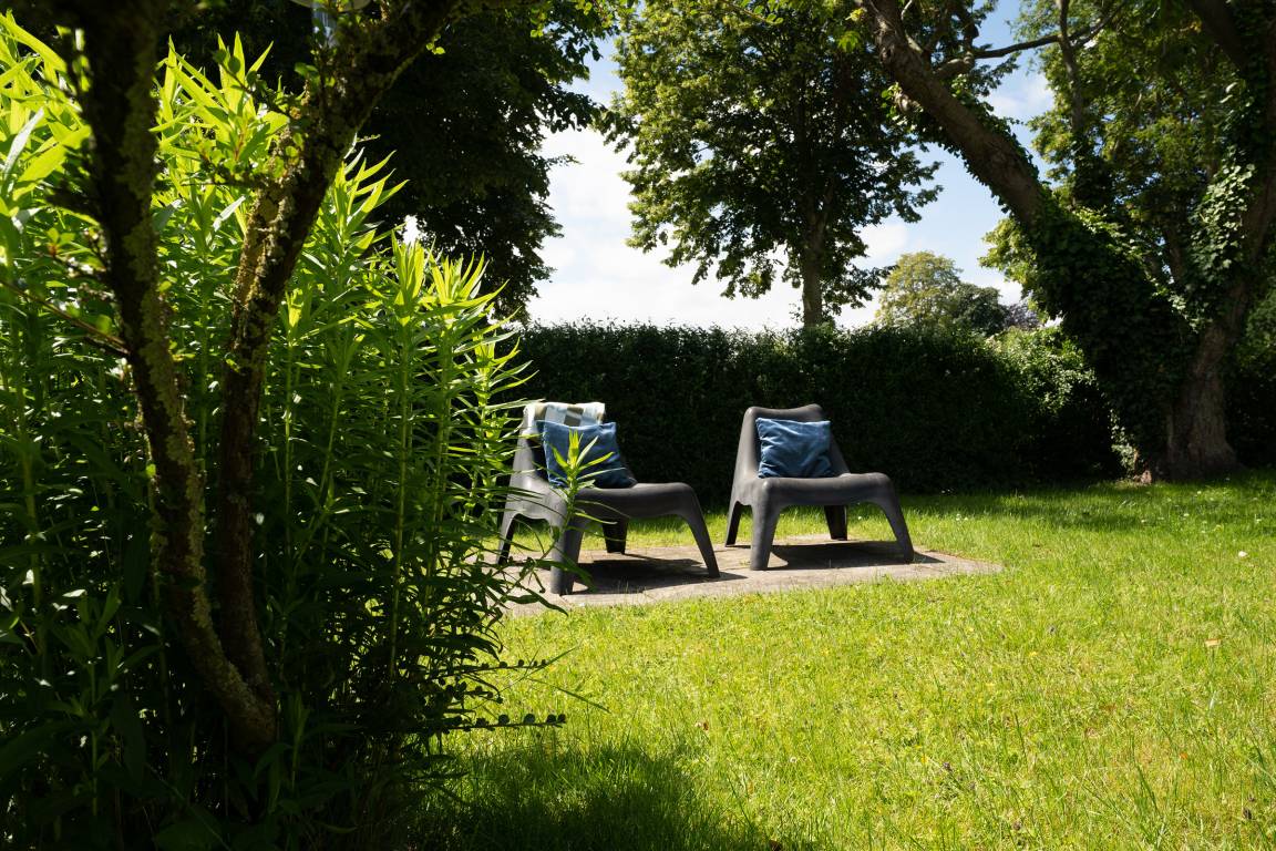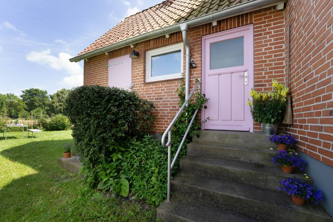 Der idyllisch angelegte Garten bietet viele schöne Rückzugsorte: ein großzügiger Essplatz im Außenbereich, eine Gartenbank Richtung Feldrand sowie zwei Outdoor-Sessel unter Obstbäumen. Als zusätzliche Highlights gibt es ein großes Gartentrampolin für die kleinen Gäste zum Austoben, Außenspiele wie z. B. Federball, Wikingerschach und sogar eine Hängematte.