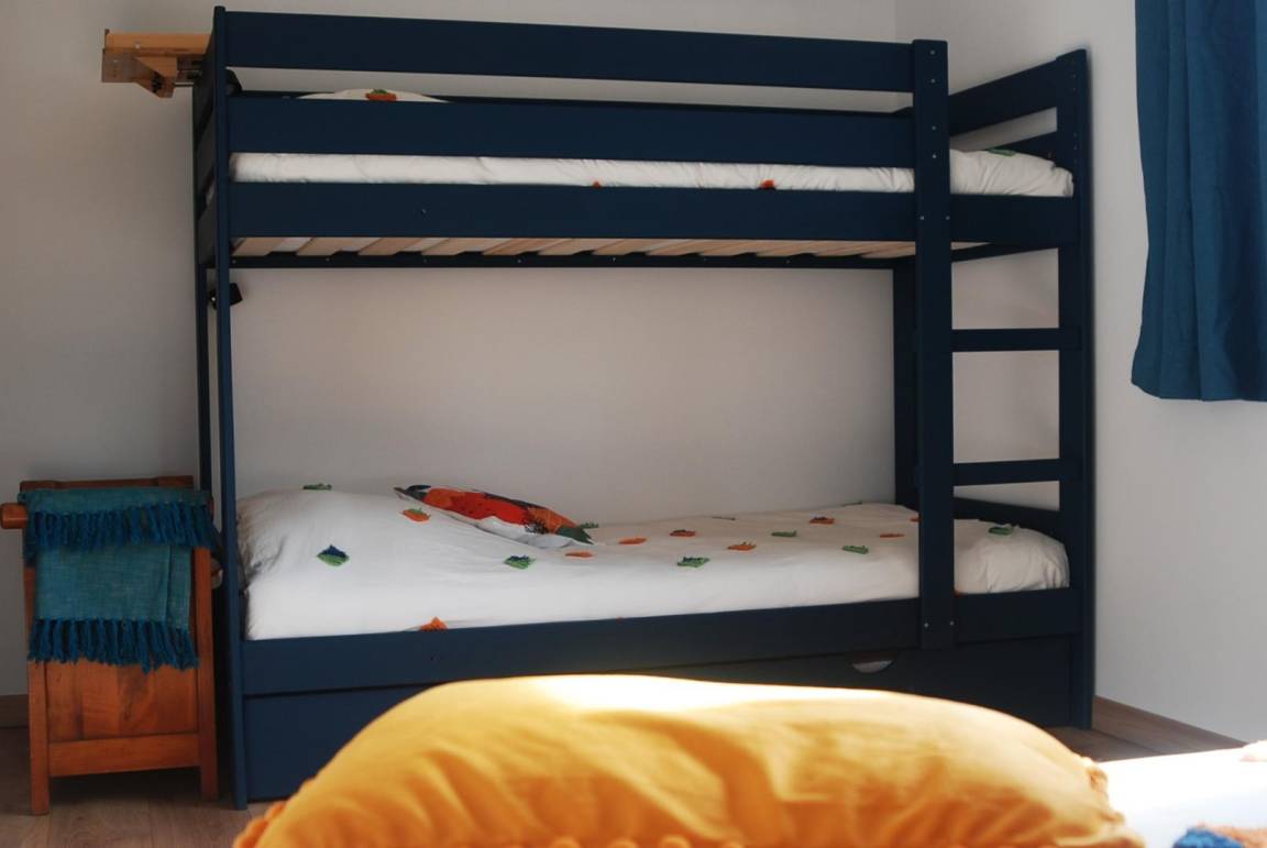 Erdgeschoss: großes Wohnzimmer (Tischfußball), Fernsehraum, Küche (Mikrowelle, Gefrierschrank). WC. Etage: 1 Schlafzimmer. (1 Bett 160 x 200 cm, 2 Einzelausziehbetten, Duschraum mit Toilette), 1 Schlafzimmer. (1 Bett 160 x 200 cm), 1 Schlafzimmer. (1 Bett 160 x 200 cm, 2 Einzel-Etagenbetten). Duschraum (Waschmaschine, Trockner). WC. Heizung durch Wärmepumpe (reversible Split). Reinigungsoption 80 €. Fahrradverleih im Dorf möglich. W-lan. Angeln im 50 m entfernten Kanal möglich. Spielplatz im Dorf (Rutsche, Fußballplatz und Tischtennisplatte). Auf Wunsch Brötchenservice möglich.