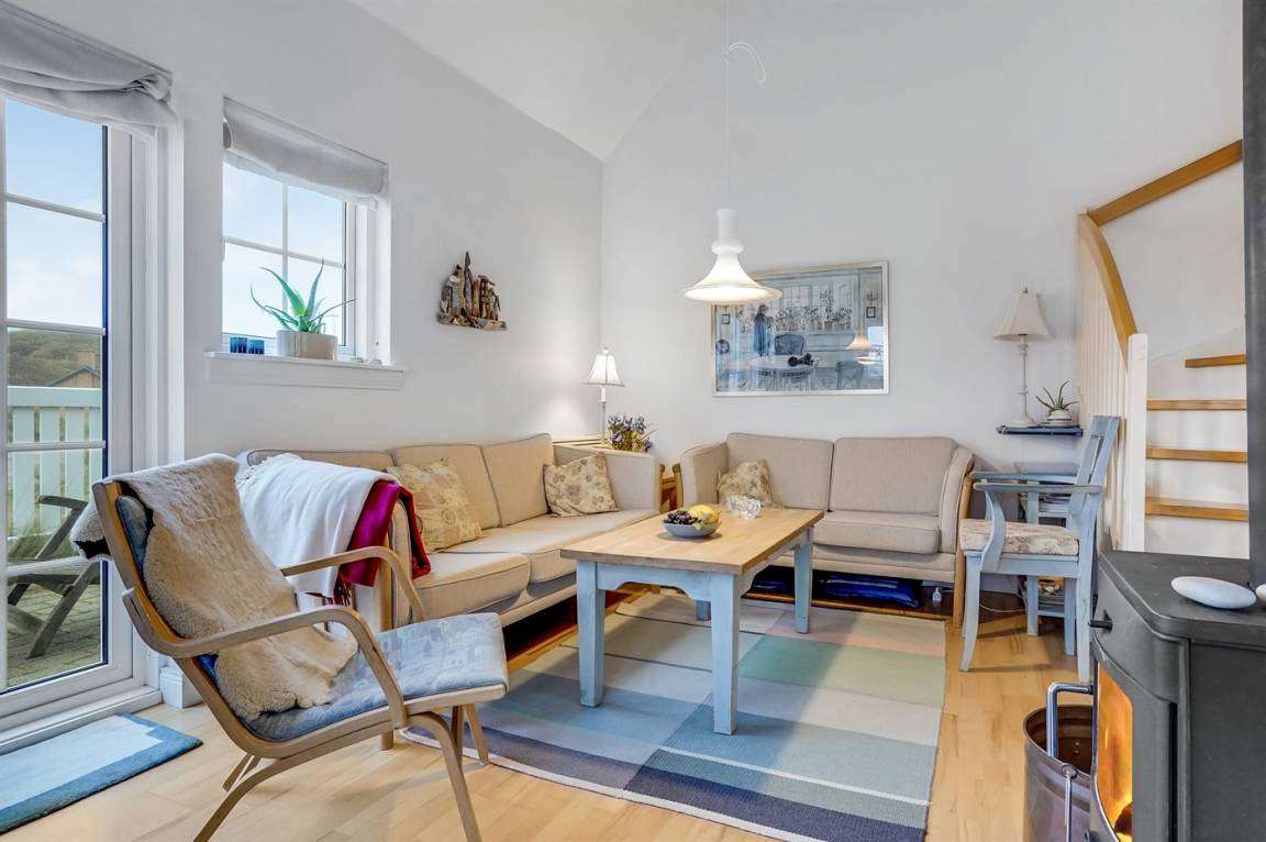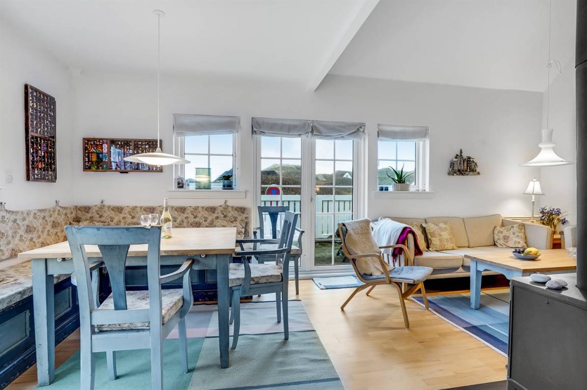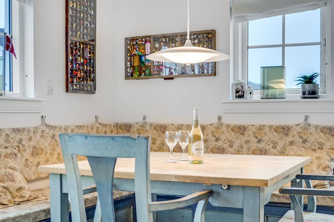 Im Wohnzimmer gibt es eine Essecke mit Eckbänken (in einer der Bänke liegen die Polster für die Terrassenstühle). Außerdem findest du eine Sofaecke, einen Kaminofen und einen Fernseher mit dänischen, deutschen, norwegischen, schwedischen und englischen Kanälen. WLAN ist ebenfalls verfügbar.