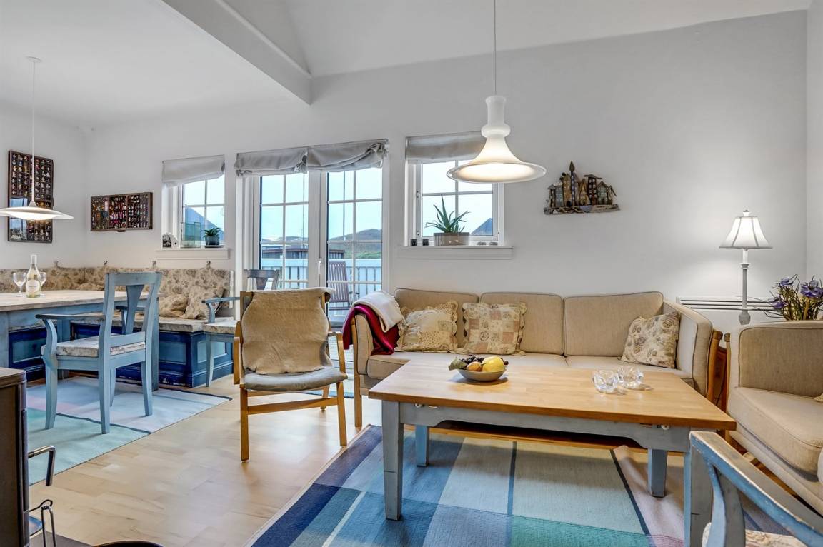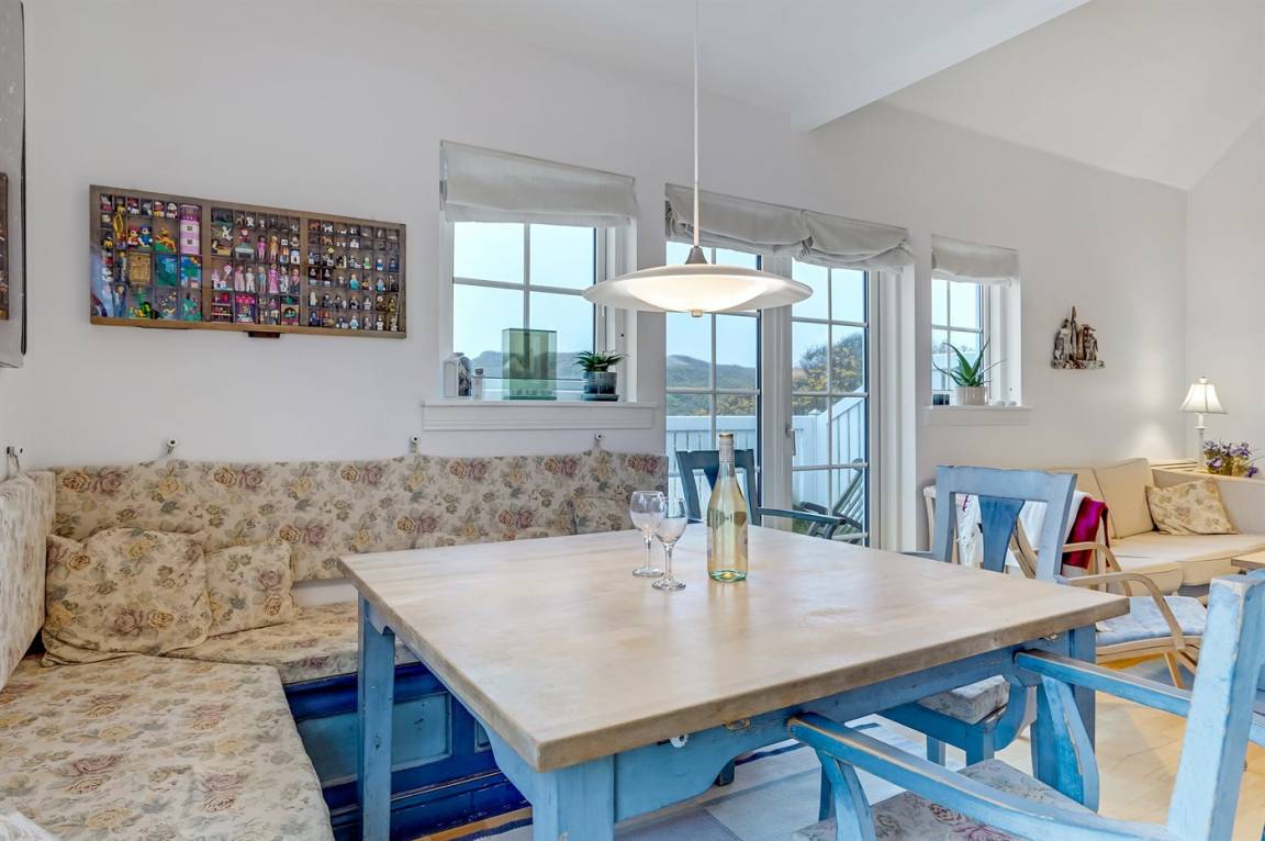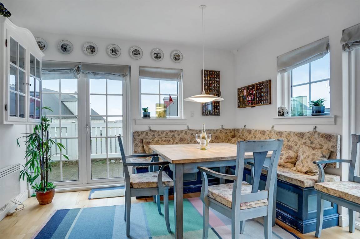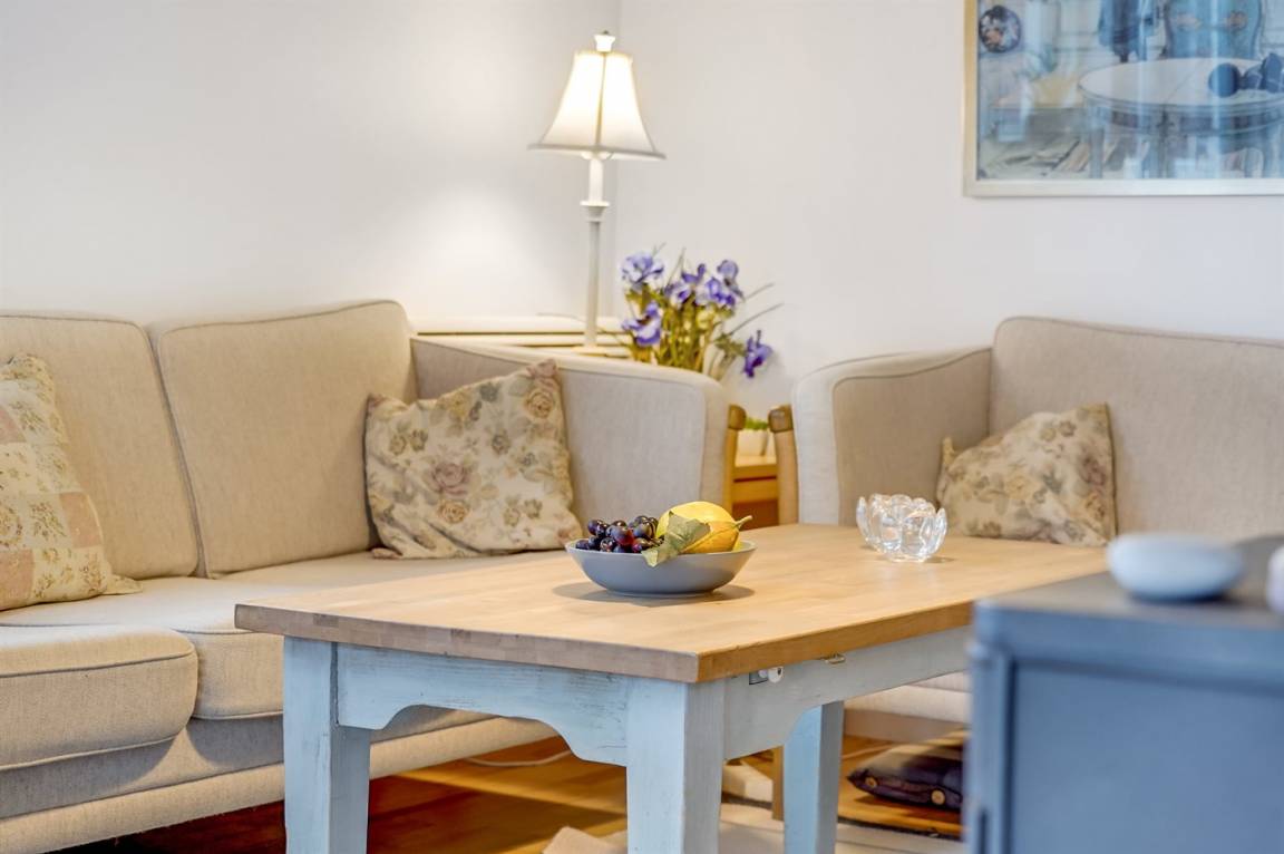 Im Wohnzimmer gibt es eine Essecke mit Eckbänken (in einer der Bänke liegen die Polster für die Terrassenstühle). Außerdem findest du eine Sofaecke, einen Kaminofen und einen Fernseher mit dänischen, deutschen, norwegischen, schwedischen und englischen Kanälen. WLAN ist ebenfalls verfügbar.