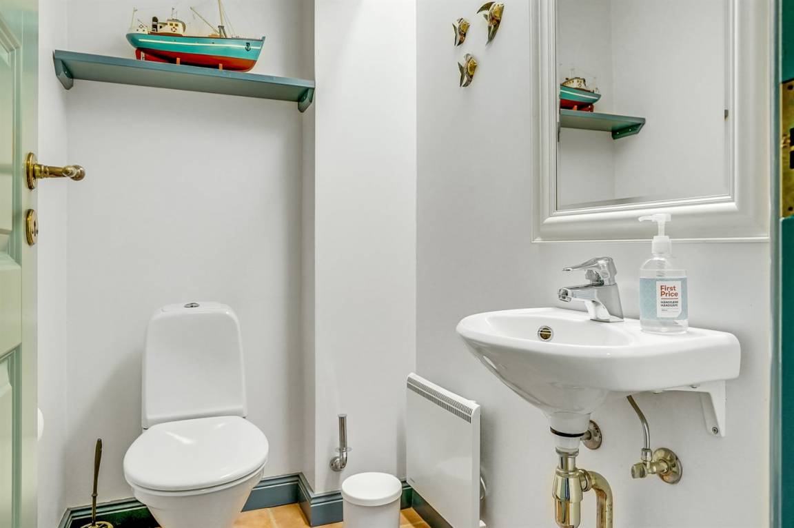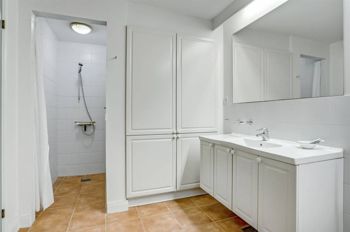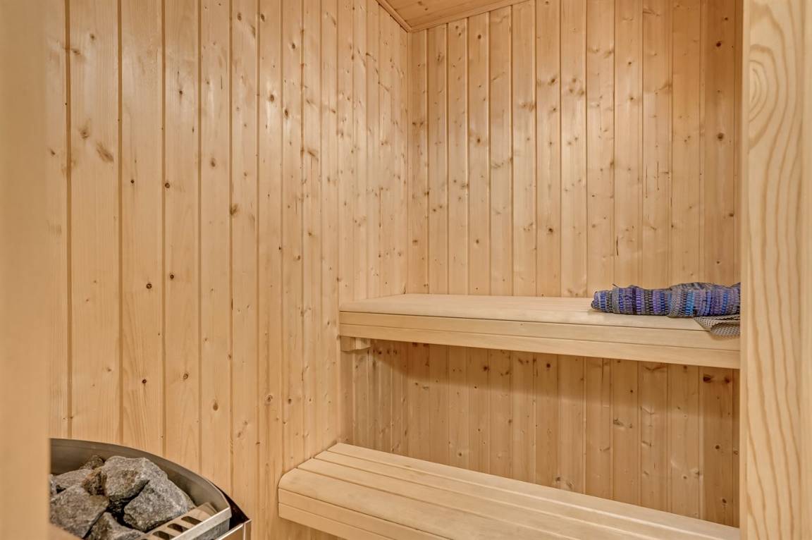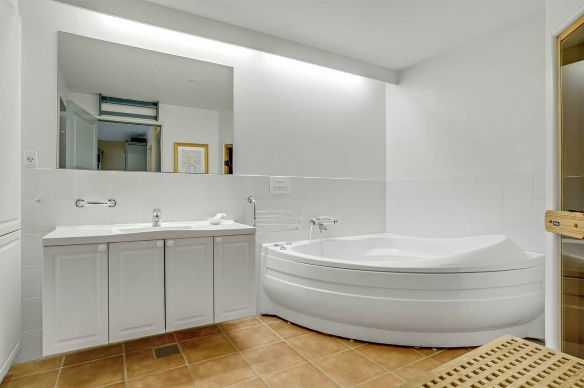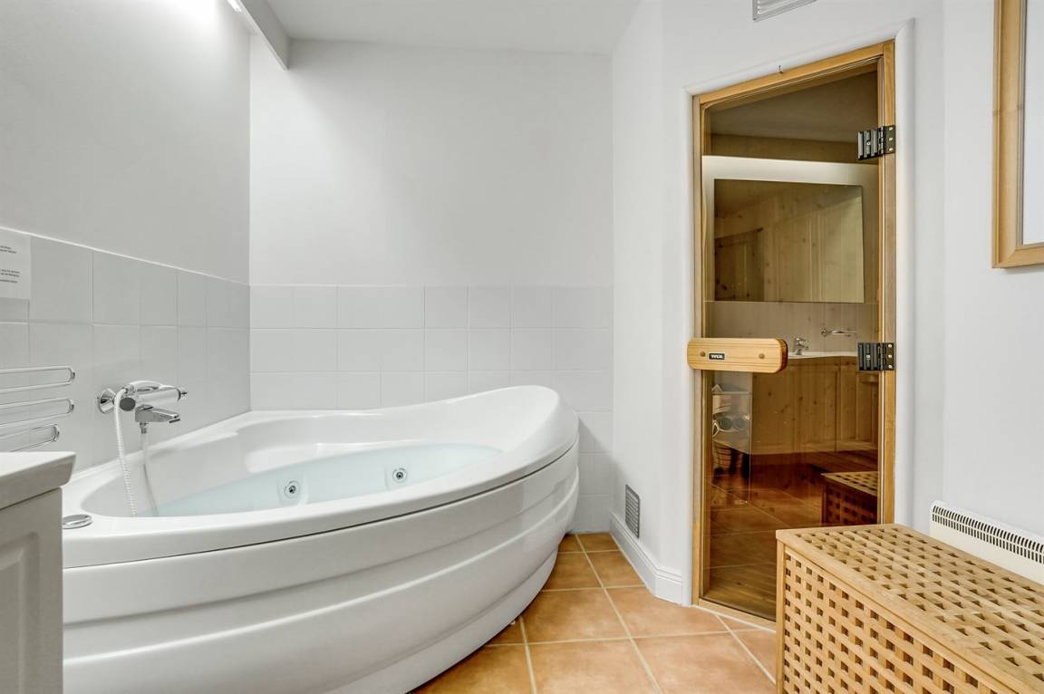 Die Wohnung bietet eine separate Toilette mit Waschbecken, sodass du das große Badezimmer in Ruhe genießen kannst. Das Badezimmer ist mit einem Whirlpool, einer kleinen Sauna, einer Duschniche und Fußbodenheizung ausgestattet. Zudem befinden sich in Schränken im Badezimmer eine Waschmaschine und ein Trockner.