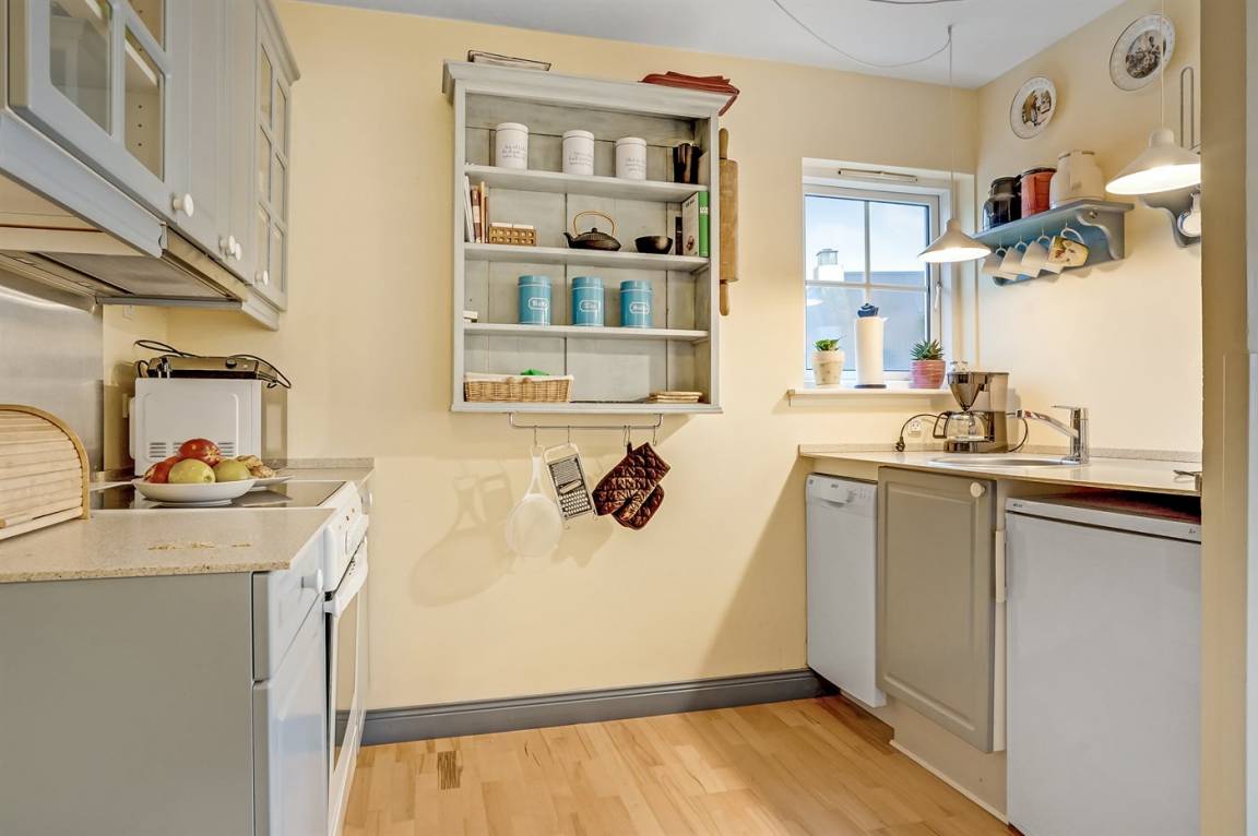 Die Küche ist gut ausgestattet mit allerlei Geschirr, einer Kaffeemaschine, einem Wasserkocher, einem großen Kühl-Gefrierschrank, einem Induktionskochfeld mit Backofen, einer Mikrowelle und einem Geschirrspüler.