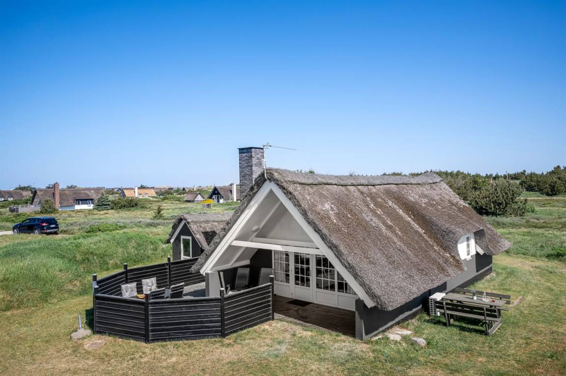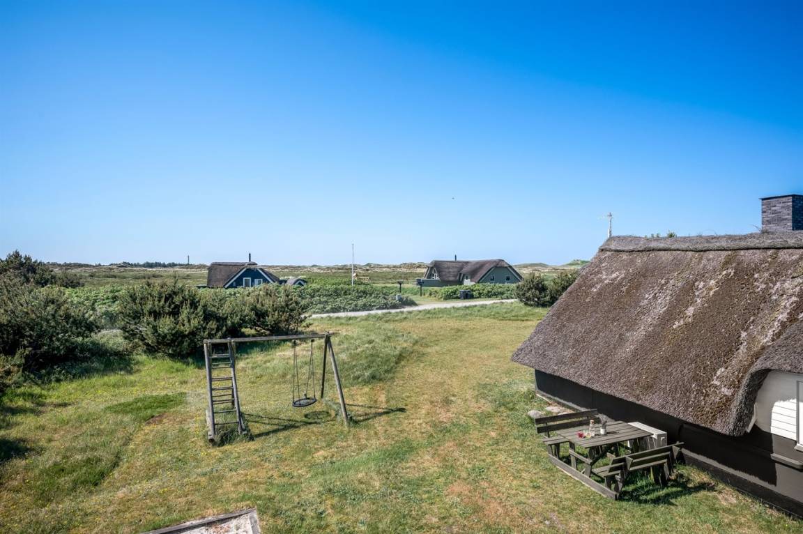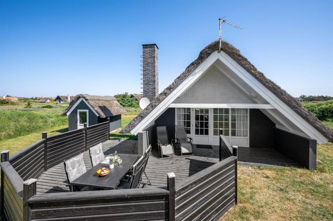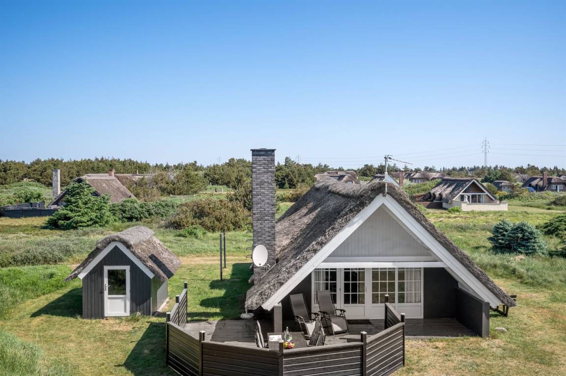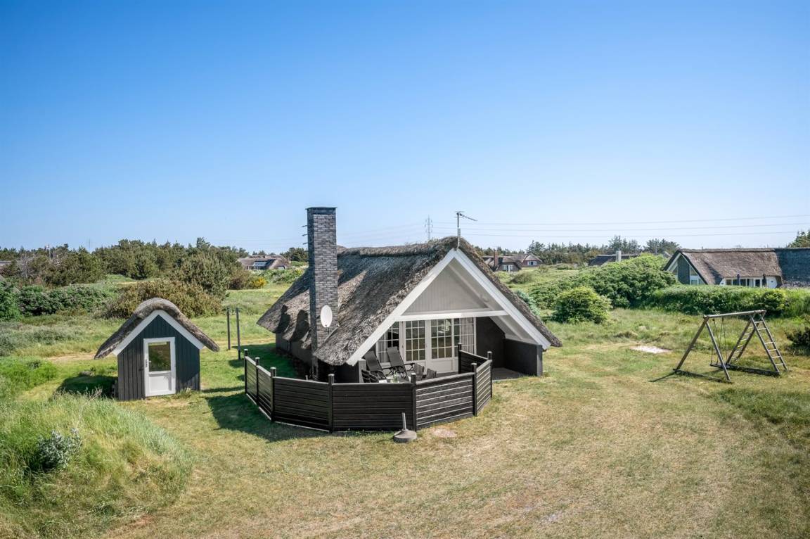 Auf einem großen Naturgrundstück 800 m vom Wasser entfernt liegt dieses gepflegte Ferienhaus mit Reetdach zwischen dem Fischerort Hvide Sande und dem Badeort Søndervig. Das Ferienhaus ist gemütlich eingerichtet mit offenes Obergeschoss mit 2 Schlafplätzen.