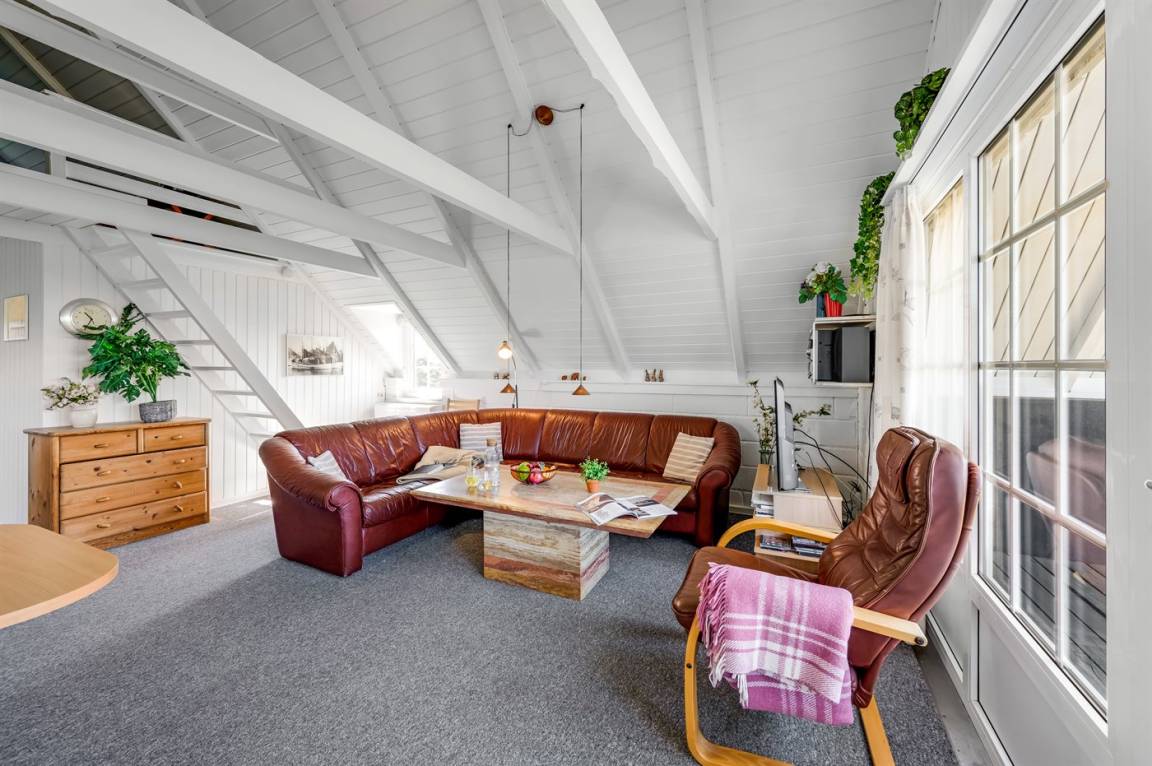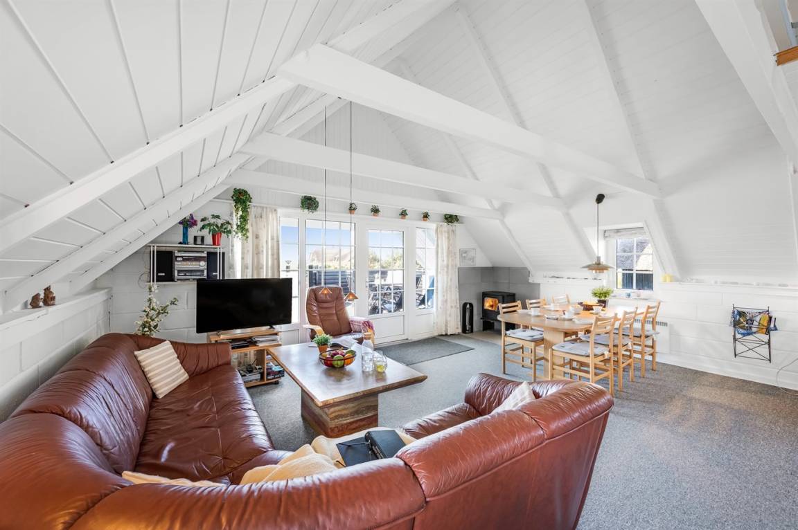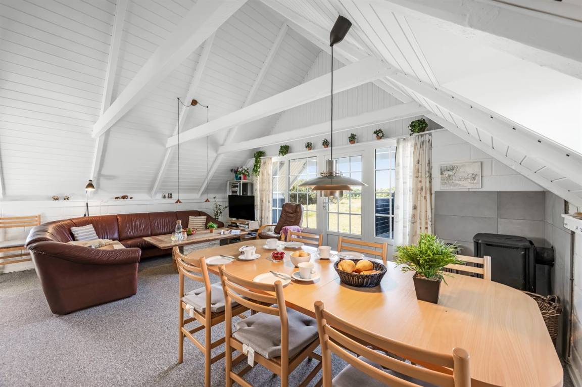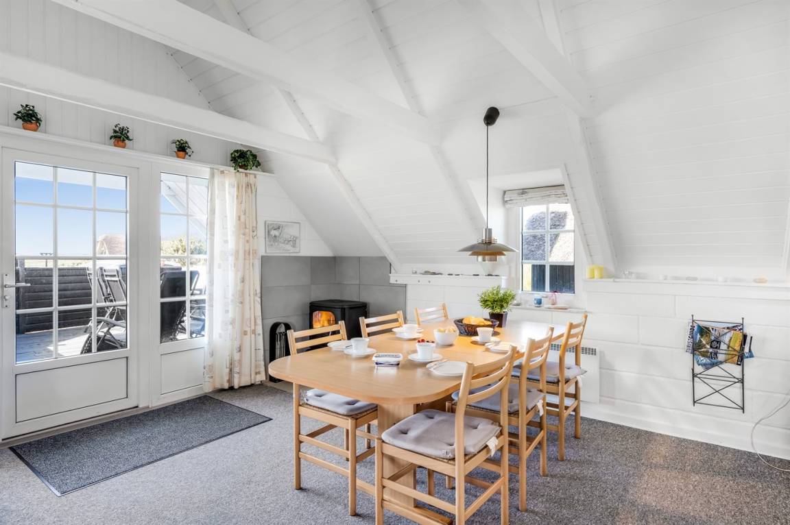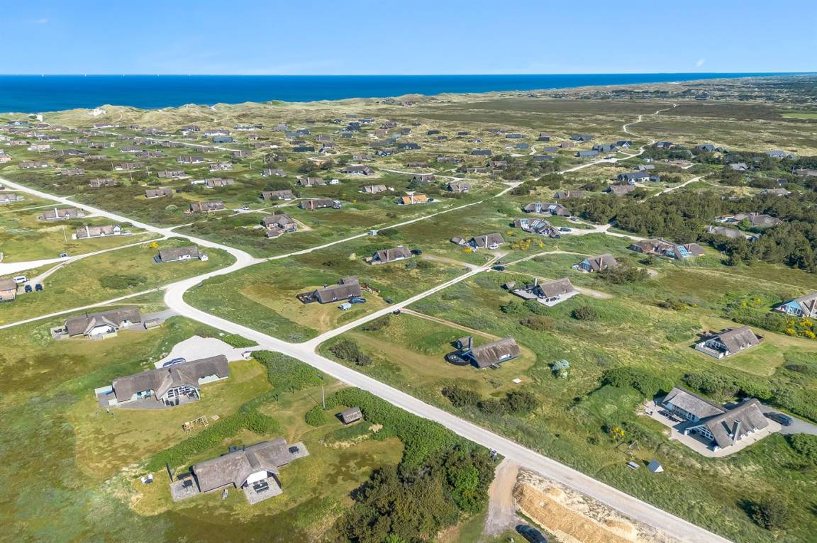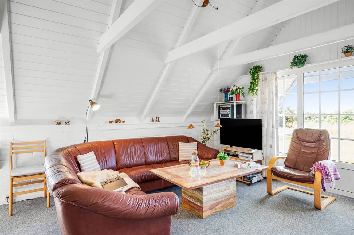 Auf einem großen Naturgrundstück 800 m vom Wasser entfernt liegt dieses gepflegte Ferienhaus mit Reetdach zwischen dem Fischerort Hvide Sande und dem Badeort Søndervig. Das Ferienhaus ist gemütlich eingerichtet mit offenes Obergeschoss mit 2 Schlafplätzen.