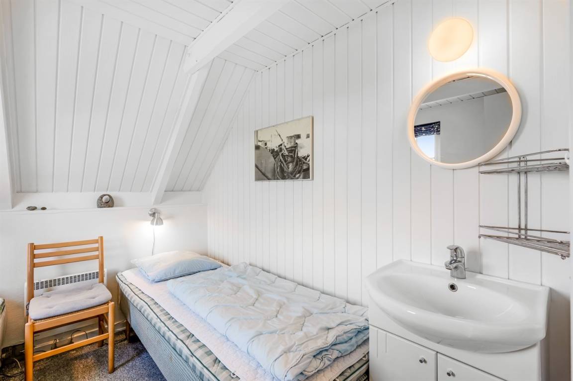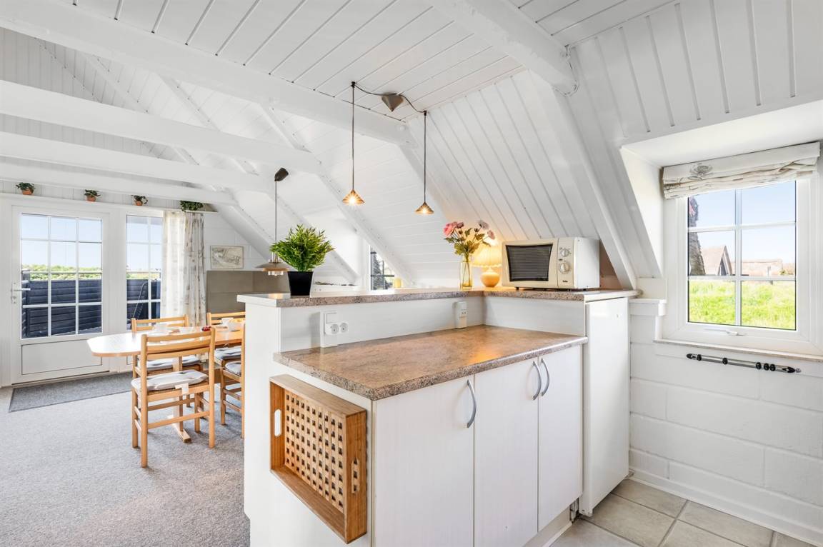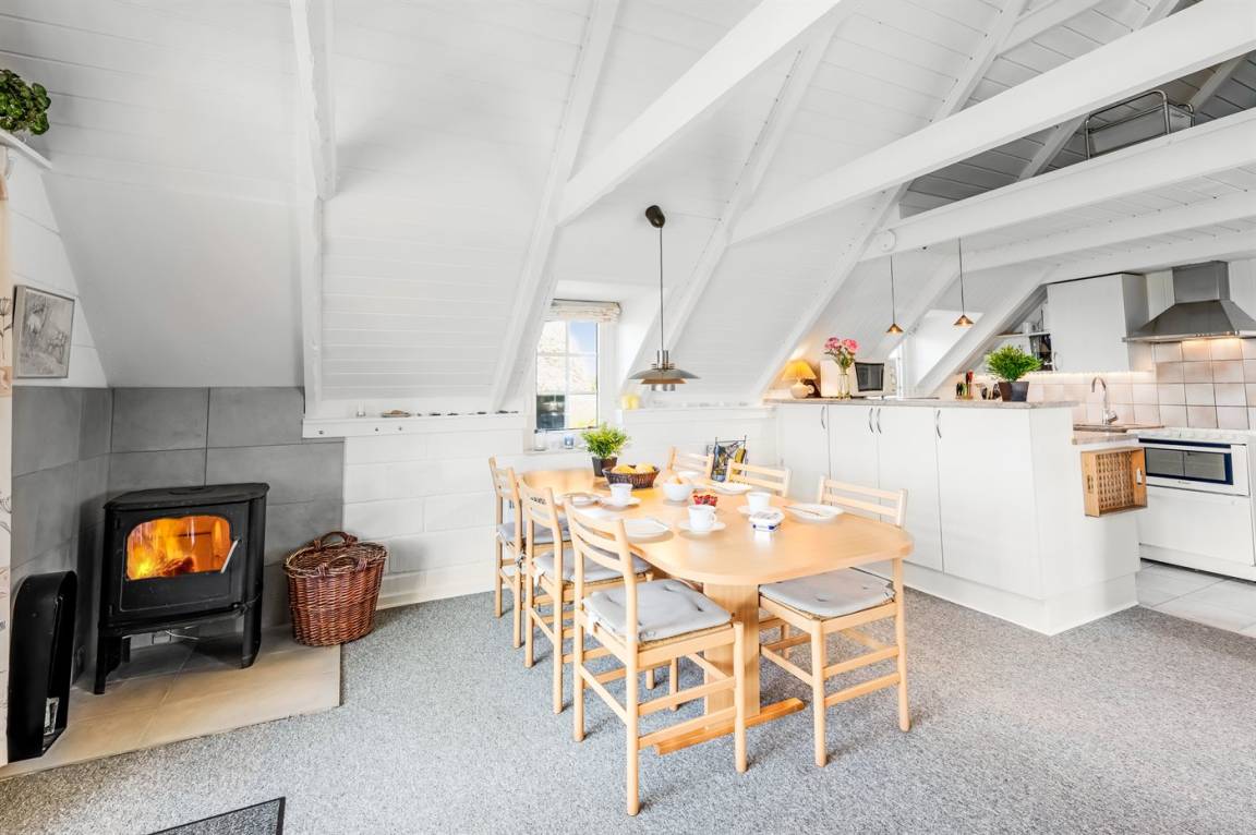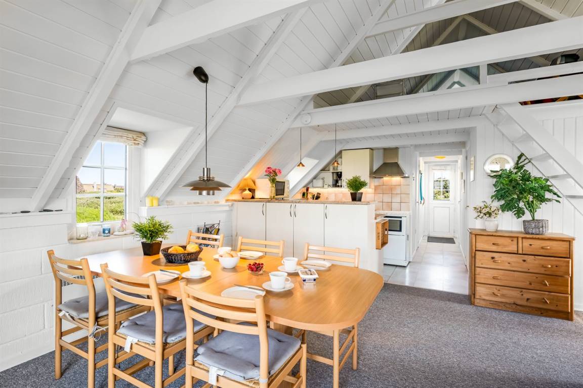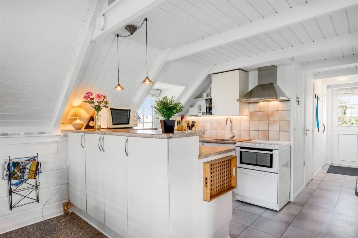 Auf einem großen Naturgrundstück 800 m vom Wasser entfernt liegt dieses gepflegte Ferienhaus mit Reetdach zwischen dem Fischerort Hvide Sande und dem Badeort Søndervig. Das Ferienhaus ist gemütlich eingerichtet mit offenes Obergeschoss mit 2 Schlafplätzen.