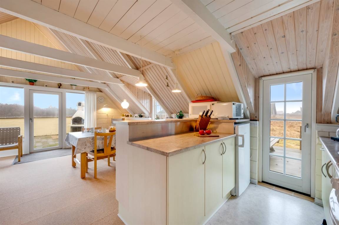 Ein Ferienhaus mit Reetdach und Sauna, auf einem ca. 2.200 m² großen Dünengrundstück bei Klegod gelegen, nur etwa 900 Meter von der Nordsee entfernt. Vom Wohnzimmer hast du direkten Zugang zu einer nach Süden ausgerichteten, teilweise überdachten Terrasse. Außerdem gibt es eine nach Westen ausgerichtete, abgeschirmte Terrasse sowie eine große, geschlossene Terrasse am nördlichen Ende des Hauses.