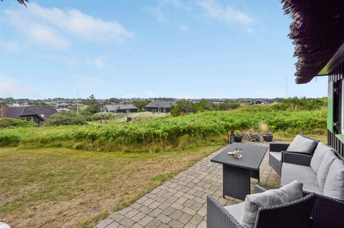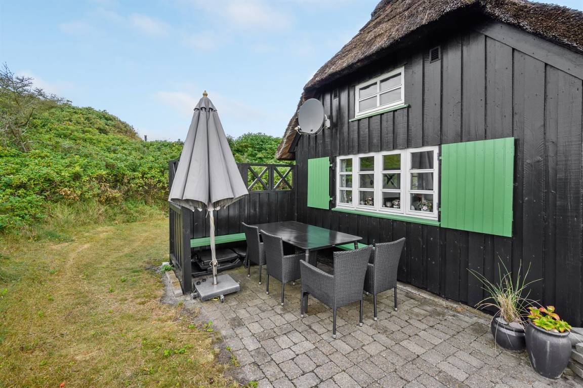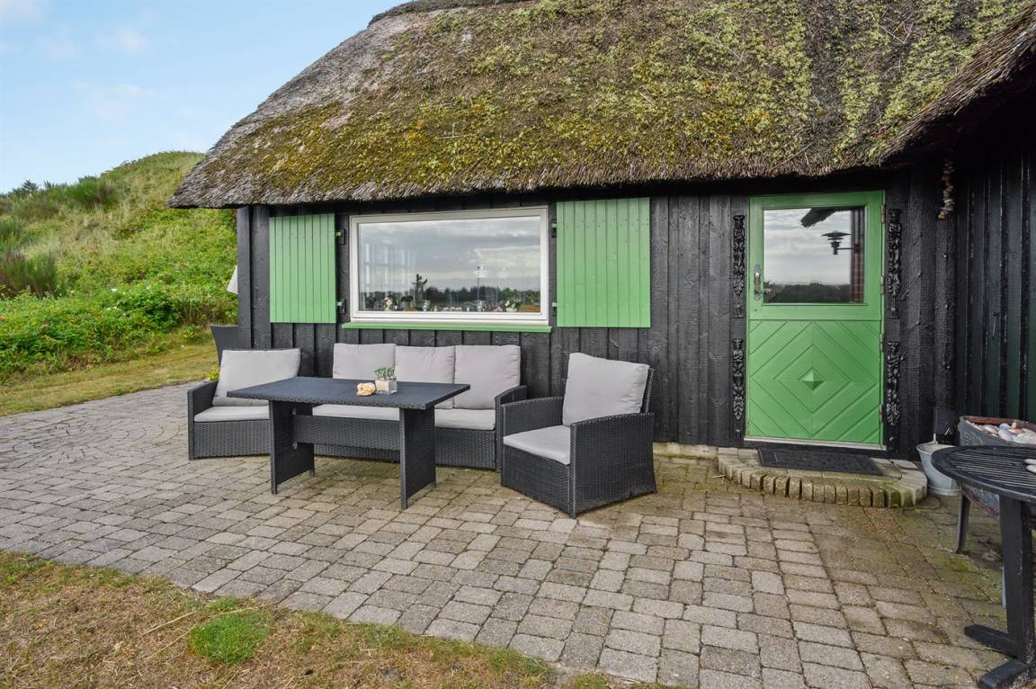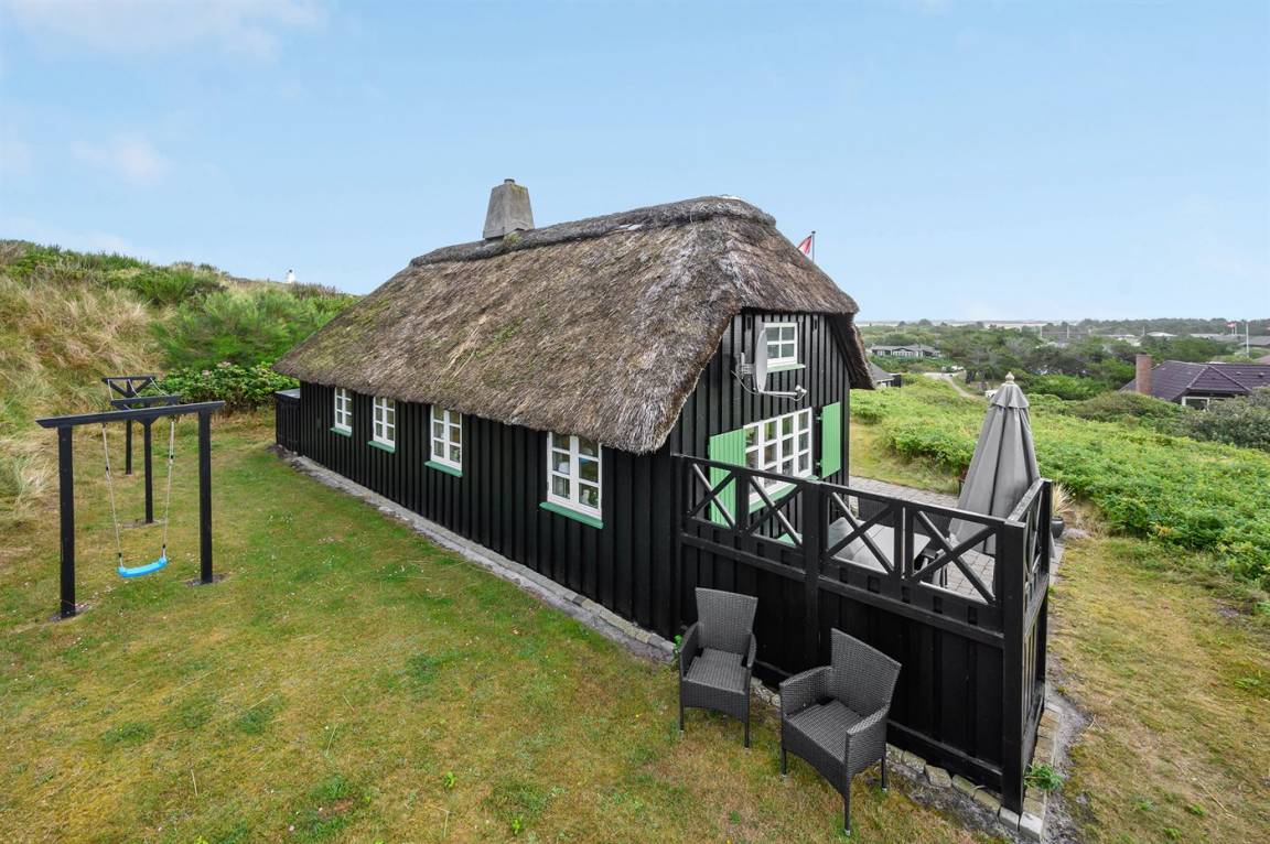 DraußenDie Ferienunterkunft liegt auf einem 1400 m² großen Dünengrundstück. Die Entfernung zum Meer beträgt 300 m. Die Entfernung zum Fjord beträgt 1500 m. Die nächste Einkaufsmöglichkeit liegt 500 m entfernt. Es steht ein 35 m² Terrassenareal zur Verfügung. Schaukel. Parkplatz auf dem Grundstück.