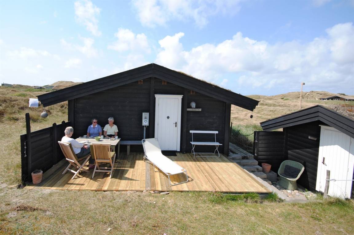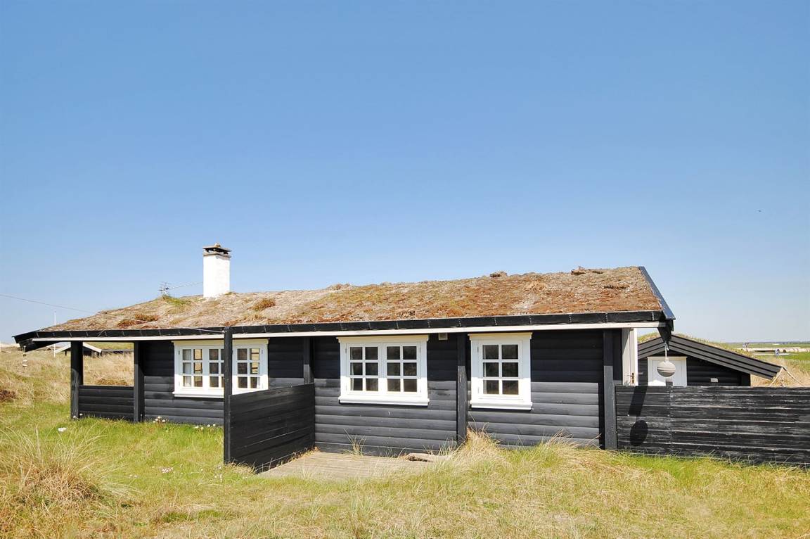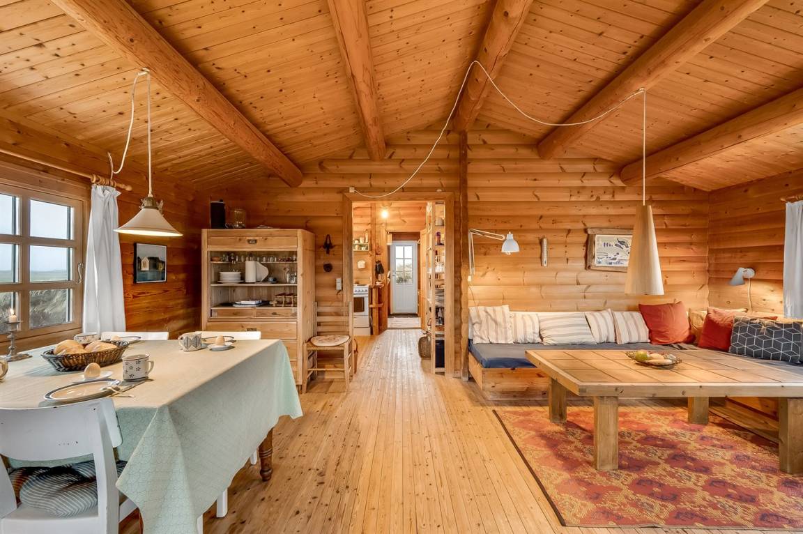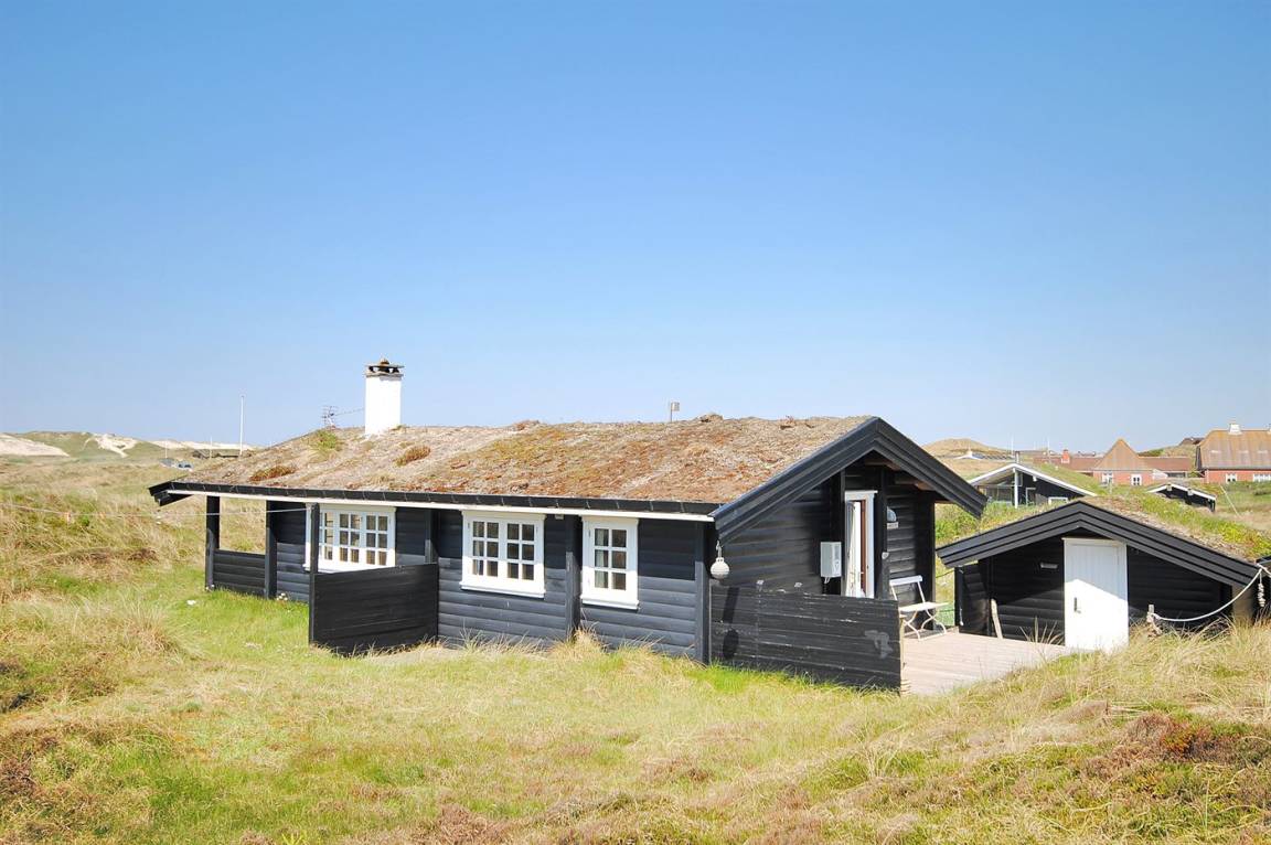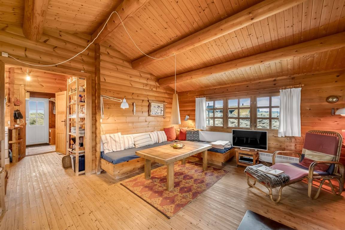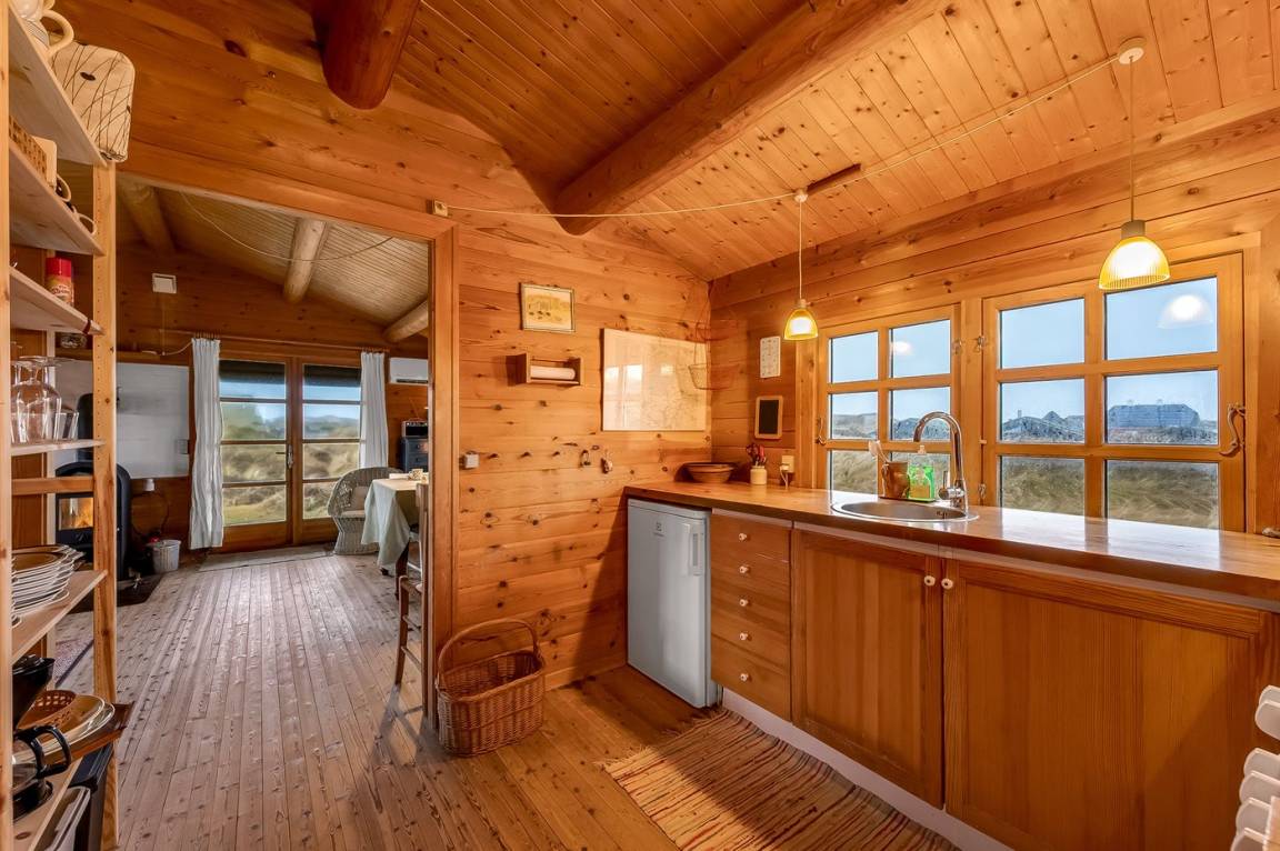 Balkenferienhaus, 1982 gebaut, mit Gras auf dem Dach. Das Haus liegt auf einem hügeligen Dünengrundstück. Offene und überdachte Terrasse mit Gartenmöbeln. Kiefernholzböden mit Brücken. Die Wände und Decken sind mit Holz verkleidet. Badezimmer mit Klinkerboden und Dusche. Das Wohnzimmer enthält Kaminofen und TV.