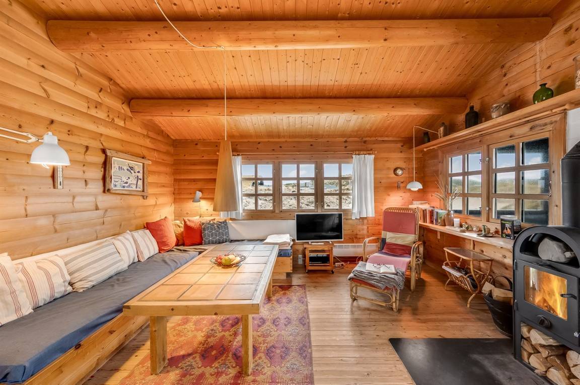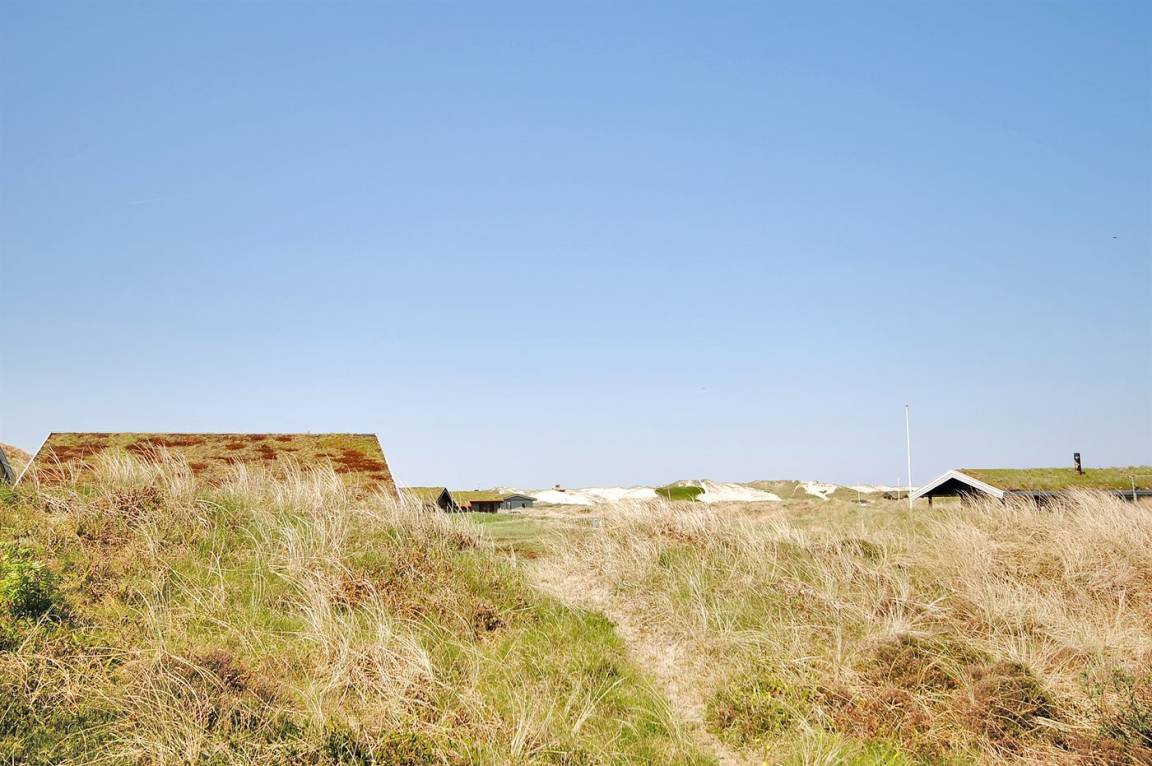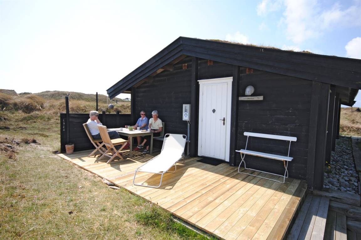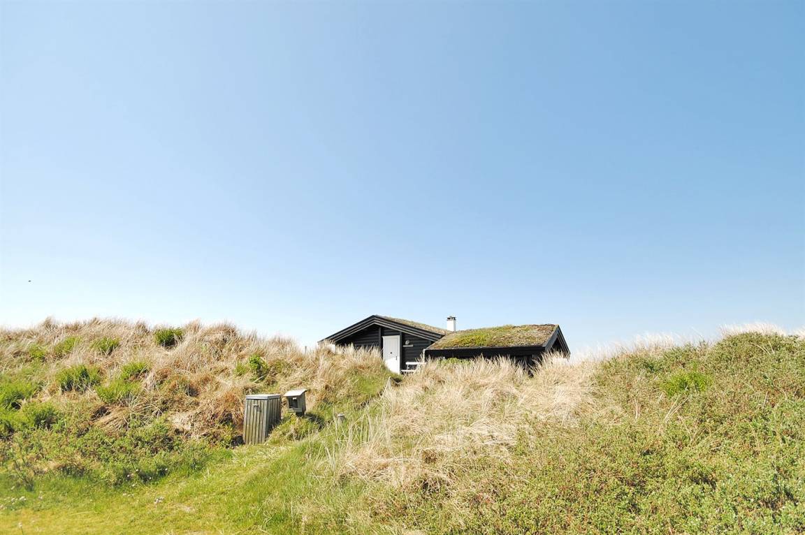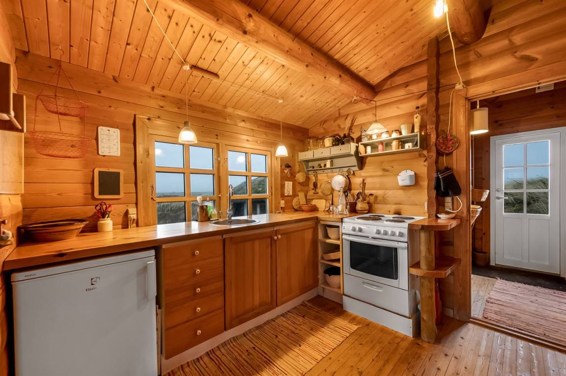 Balkenferienhaus, 1982 gebaut, mit Gras auf dem Dach. Das Haus liegt auf einem hügeligen Dünengrundstück. Offene und überdachte Terrasse mit Gartenmöbeln. Kiefernholzböden mit Brücken. Die Wände und Decken sind mit Holz verkleidet. Badezimmer mit Klinkerboden und Dusche. Das Wohnzimmer enthält Kaminofen und TV.