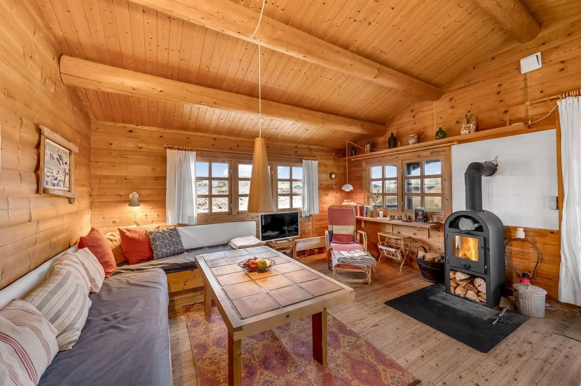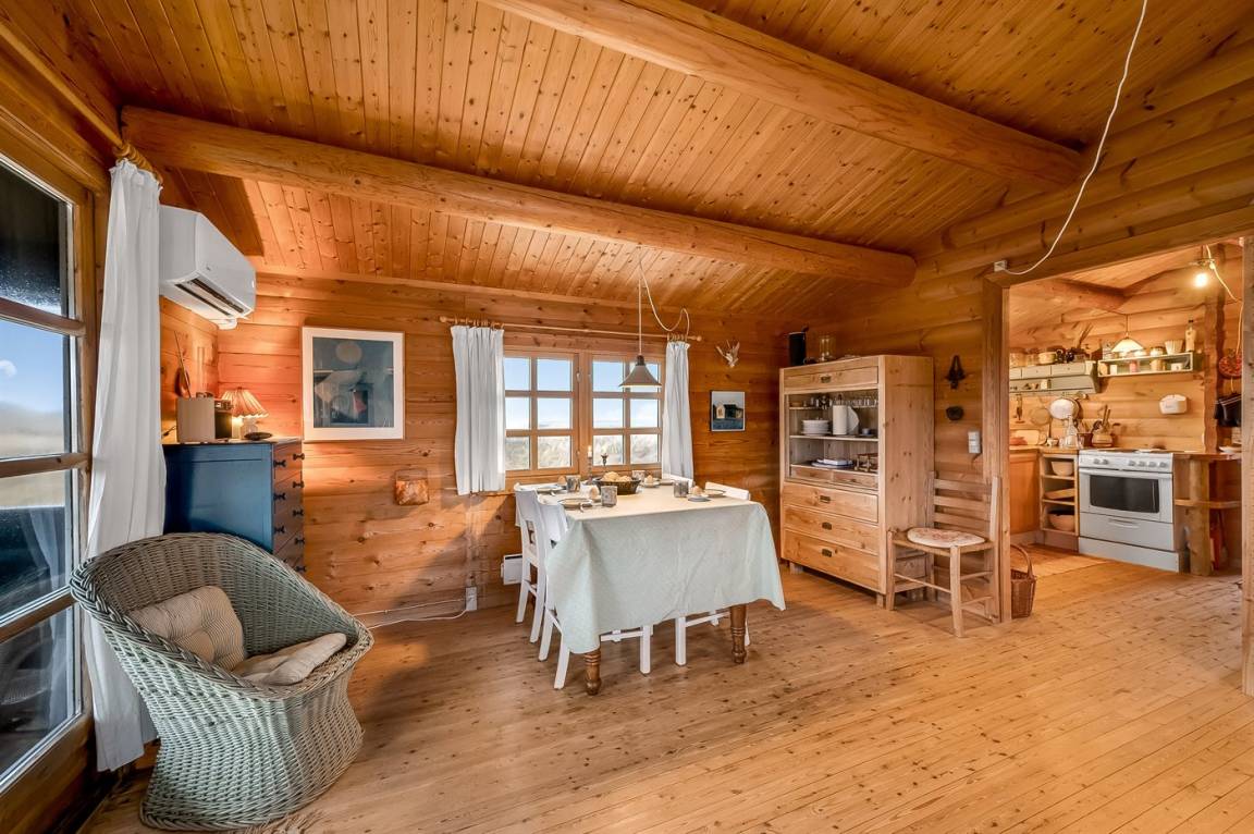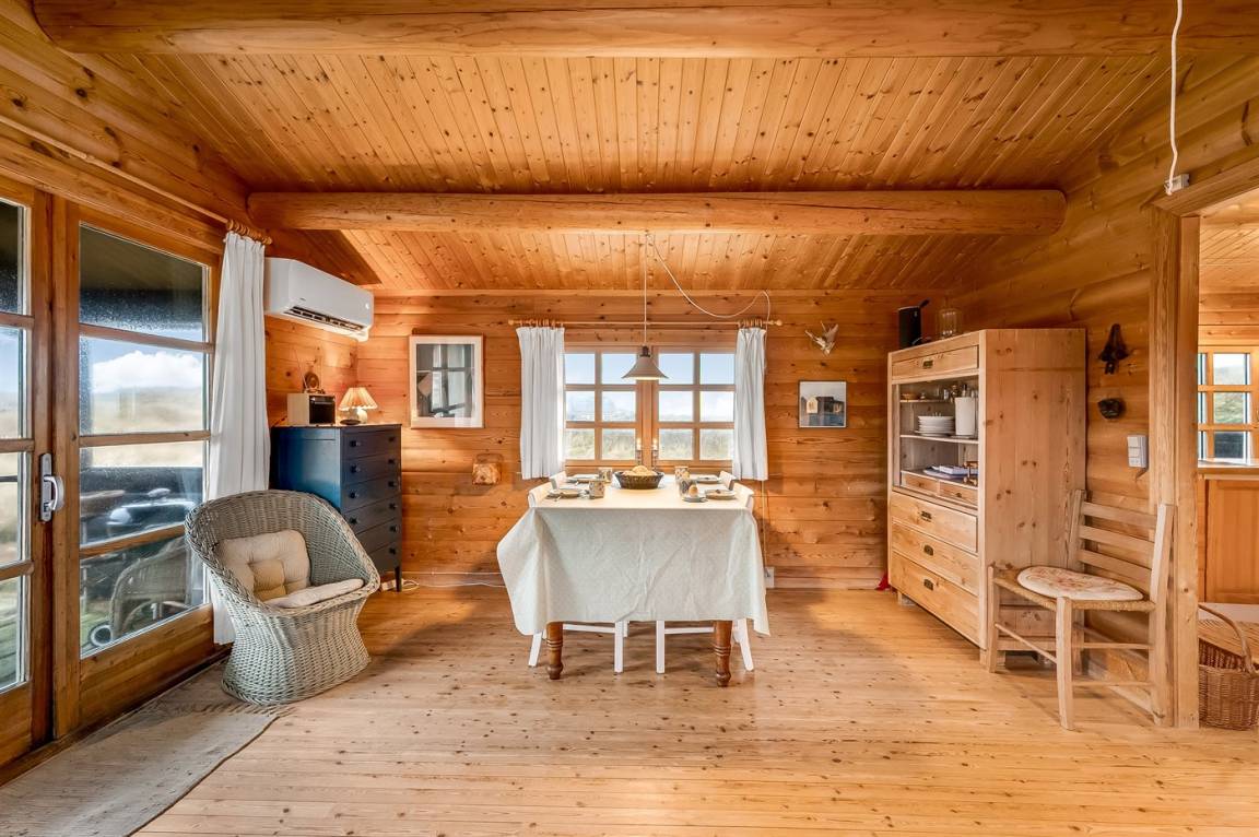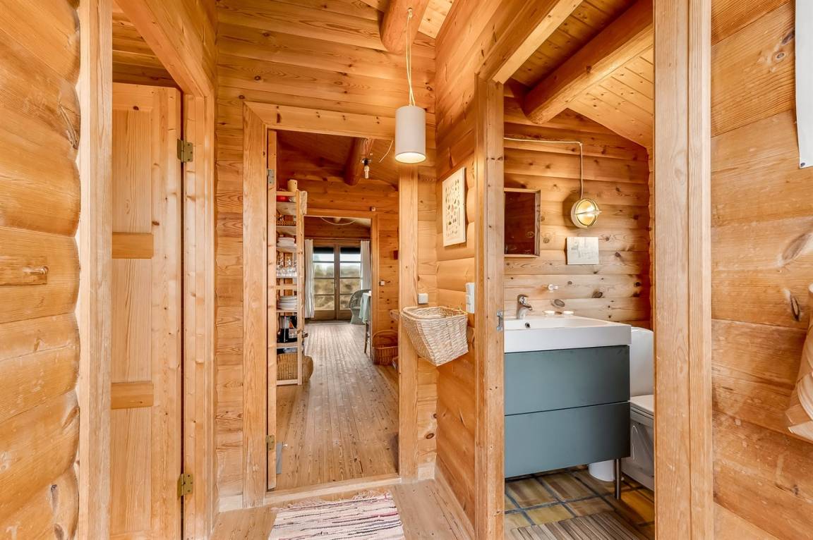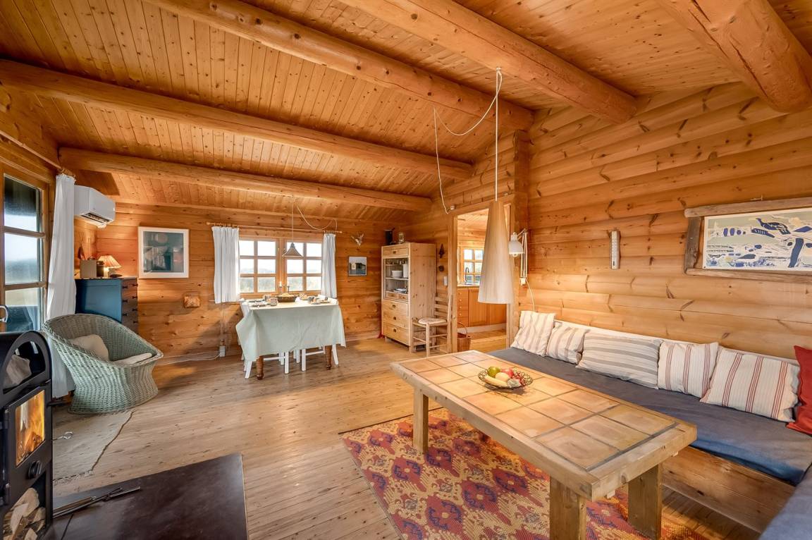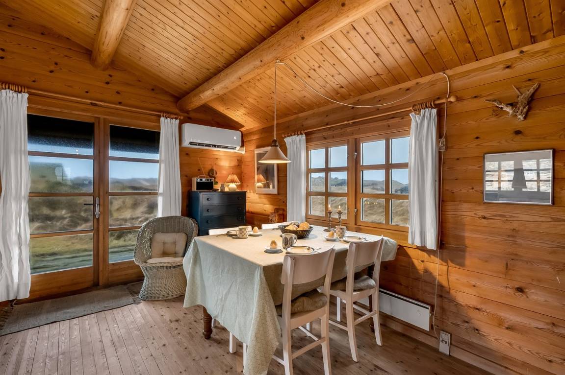 Balkenferienhaus, 1982 gebaut, mit Gras auf dem Dach. Das Haus liegt auf einem hügeligen Dünengrundstück. Offene und überdachte Terrasse mit Gartenmöbeln. Kiefernholzböden mit Brücken. Die Wände und Decken sind mit Holz verkleidet. Badezimmer mit Klinkerboden und Dusche. Das Wohnzimmer enthält Kaminofen und TV.