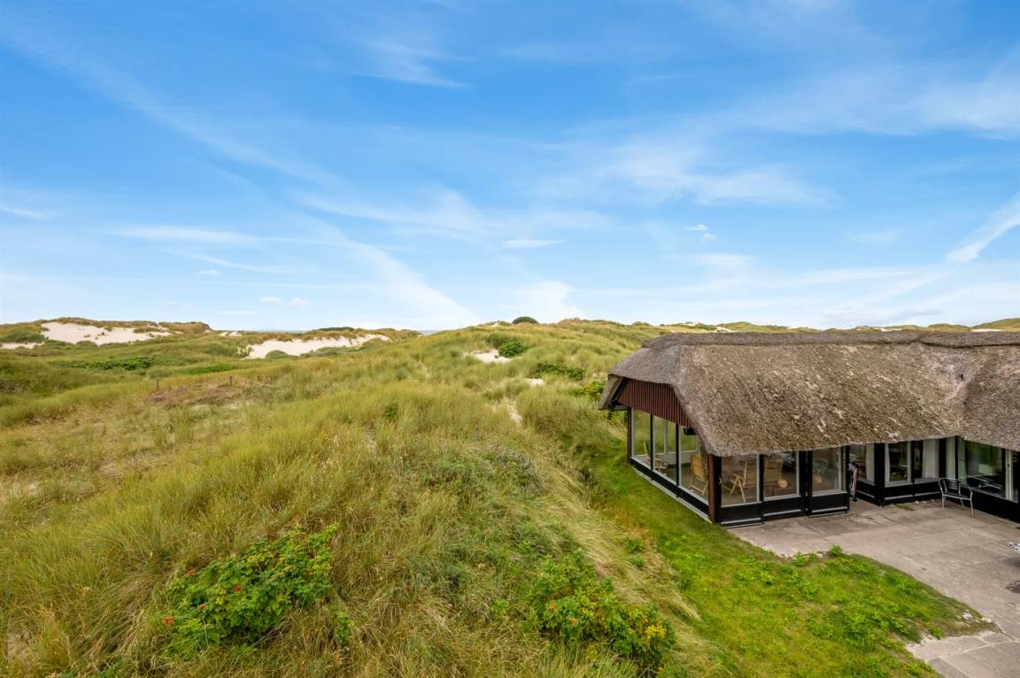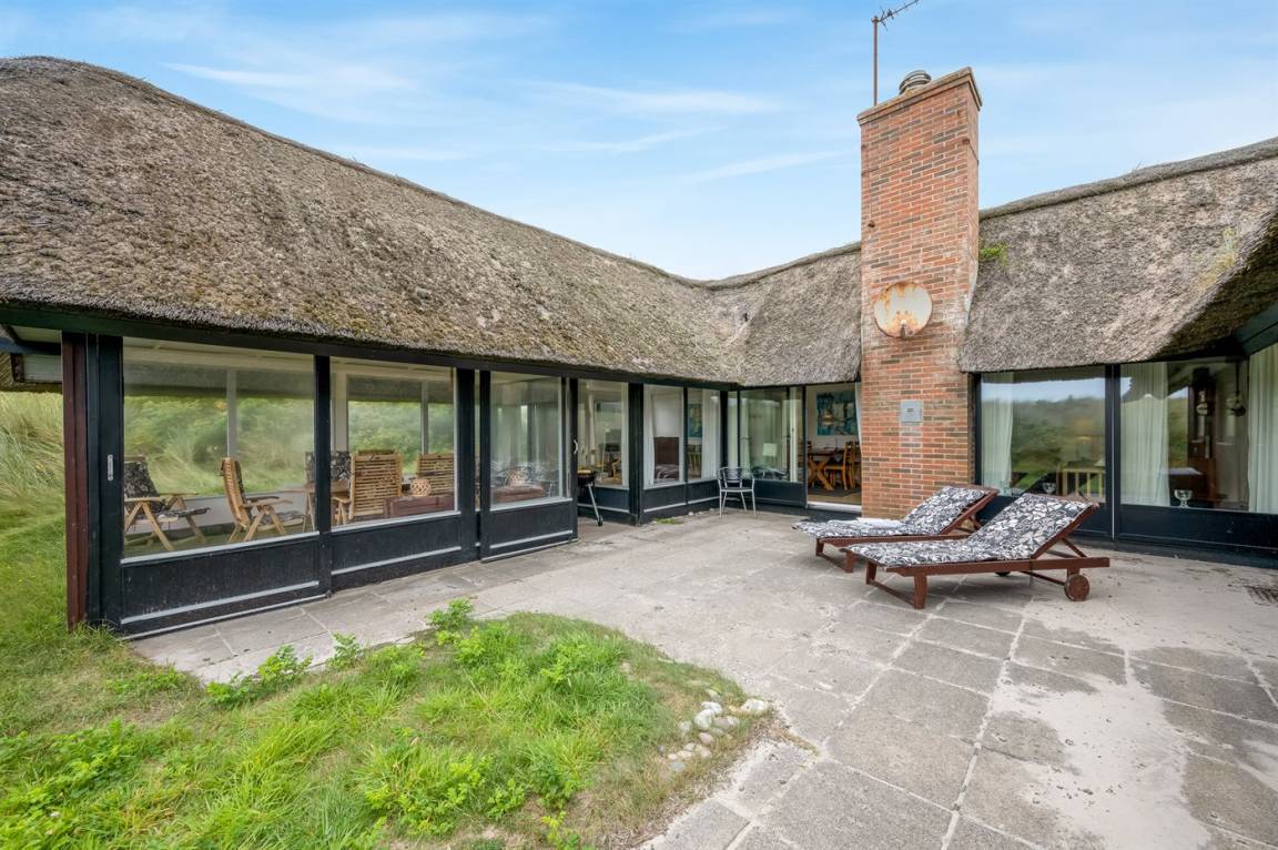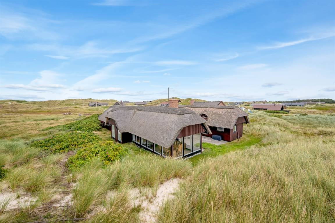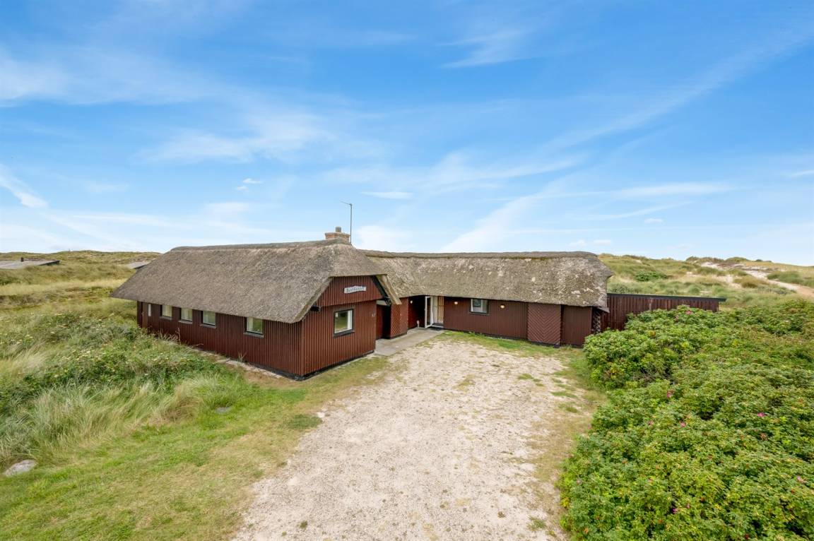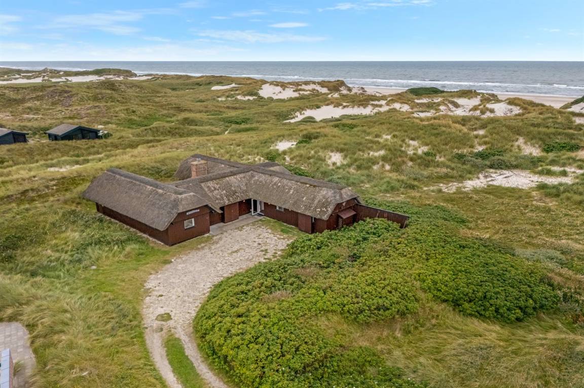 Geräumiges Feriehaus mit Reetdach im alten Stil gebaut auf einem sehr großen Grundstück in der ersten Dünenreihe und direkt an der Nordsee gelegen. Vom höchsten Punkt des Grundstücks gibt es sowohl Aussicht auf das Meer als auch auf die Förde. Zum Haus gehört eine große nach Süden gerichtete Terrasse sowie einen großen Wintergarten, der in Richtung der Terrasse geöffnet werden kann. Westlich des Hauses befindet sich ein großes Gebiet mit viel Platz für Ballspiele und andere Aktivitäten im Freien. Ein sehr schönes und hübsch gelegenes Ferienhaus mit einem großen Hof für das Parken. Das Haus ist für 2 Familien sehr geeignet, und liegt nicht weit von Søndervig mit einem großen modernen Supermarkt, Restaurants, Geschäfte u.a. entfernt.
