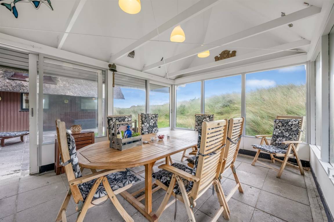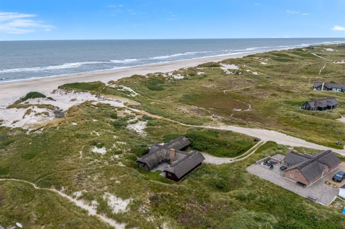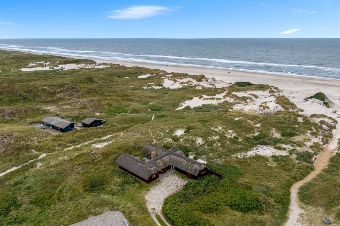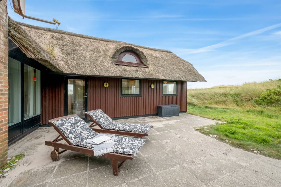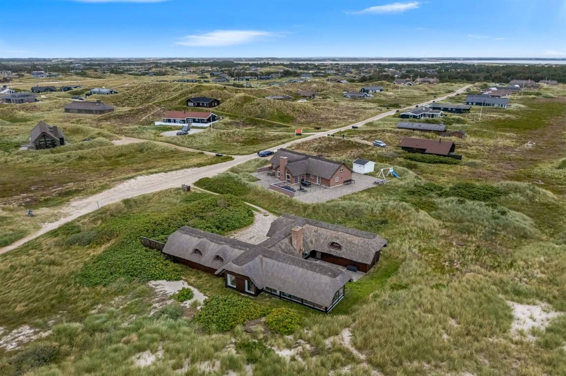 Geräumiges Feriehaus mit Reetdach im alten Stil gebaut auf einem sehr großen Grundstück in der ersten Dünenreihe und direkt an der Nordsee gelegen. Vom höchsten Punkt des Grundstücks gibt es sowohl Aussicht auf das Meer als auch auf die Förde. Zum Haus gehört eine große nach Süden gerichtete Terrasse sowie einen großen Wintergarten, der in Richtung der Terrasse geöffnet werden kann. Westlich des Hauses befindet sich ein großes Gebiet mit viel Platz für Ballspiele und andere Aktivitäten im Freien. Ein sehr schönes und hübsch gelegenes Ferienhaus mit einem großen Hof für das Parken. Das Haus ist für 2 Familien sehr geeignet, und liegt nicht weit von Søndervig mit einem großen modernen Supermarkt, Restaurants, Geschäfte u.a. entfernt.
