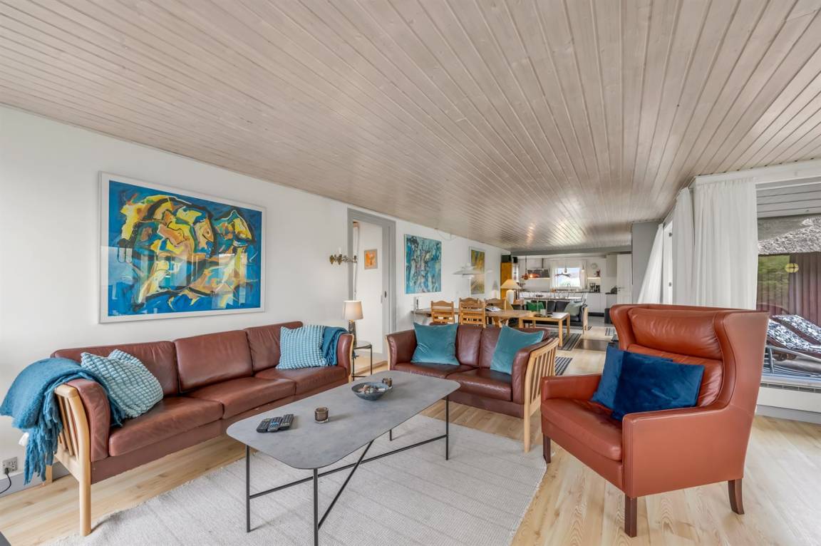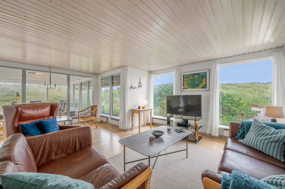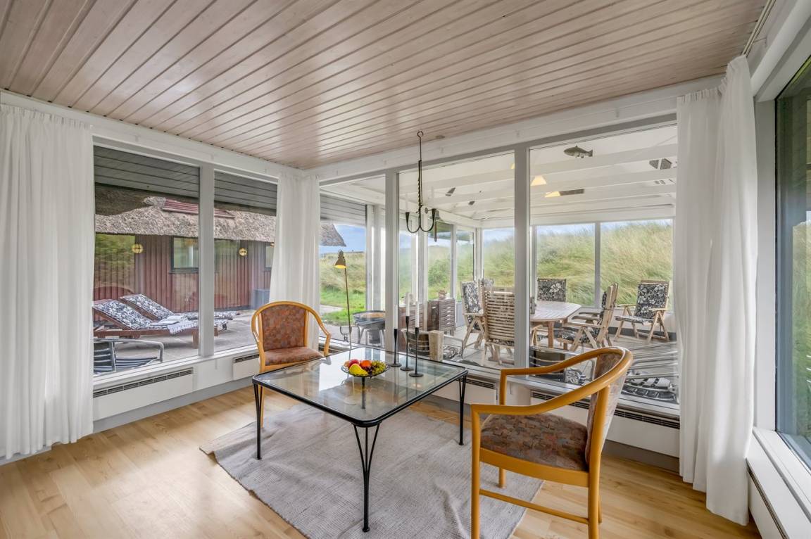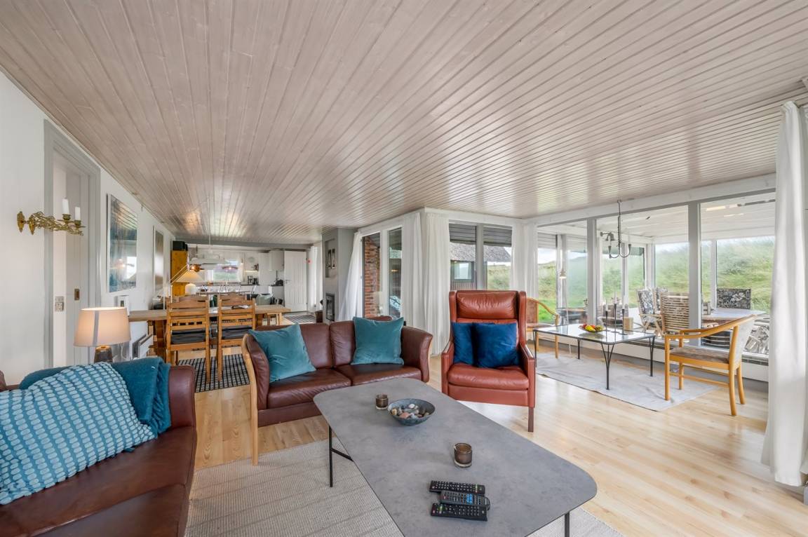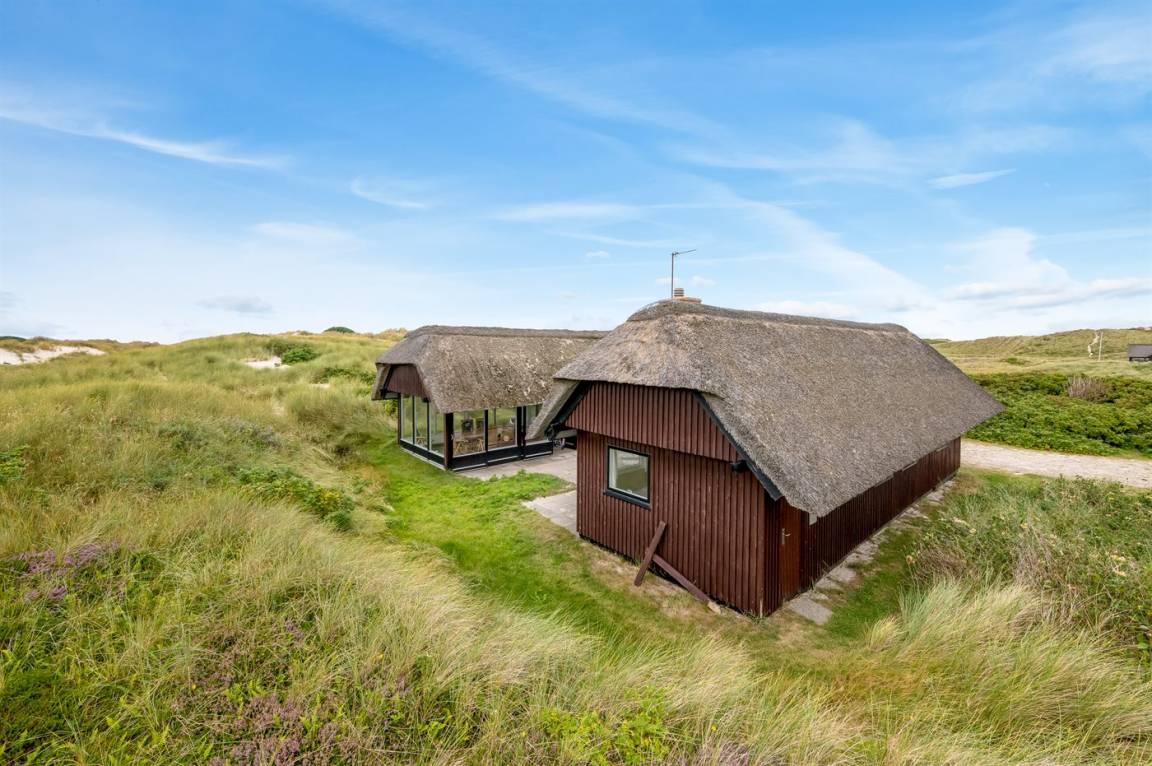 Geräumiges Feriehaus mit Reetdach im alten Stil gebaut auf einem sehr großen Grundstück in der ersten Dünenreihe und direkt an der Nordsee gelegen. Vom höchsten Punkt des Grundstücks gibt es sowohl Aussicht auf das Meer als auch auf die Förde. Zum Haus gehört eine große nach Süden gerichtete Terrasse sowie einen großen Wintergarten, der in Richtung der Terrasse geöffnet werden kann. Westlich des Hauses befindet sich ein großes Gebiet mit viel Platz für Ballspiele und andere Aktivitäten im Freien. Ein sehr schönes und hübsch gelegenes Ferienhaus mit einem großen Hof für das Parken. Das Haus ist für 2 Familien sehr geeignet, und liegt nicht weit von Søndervig mit einem großen modernen Supermarkt, Restaurants, Geschäfte u.a. entfernt.