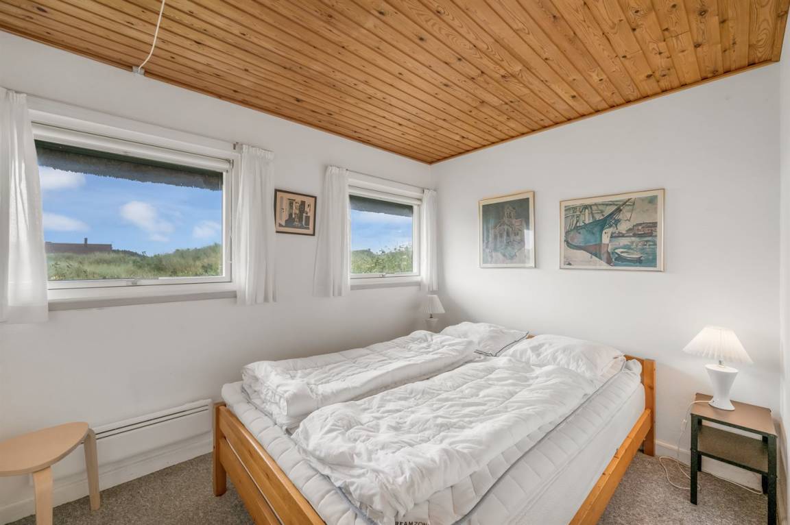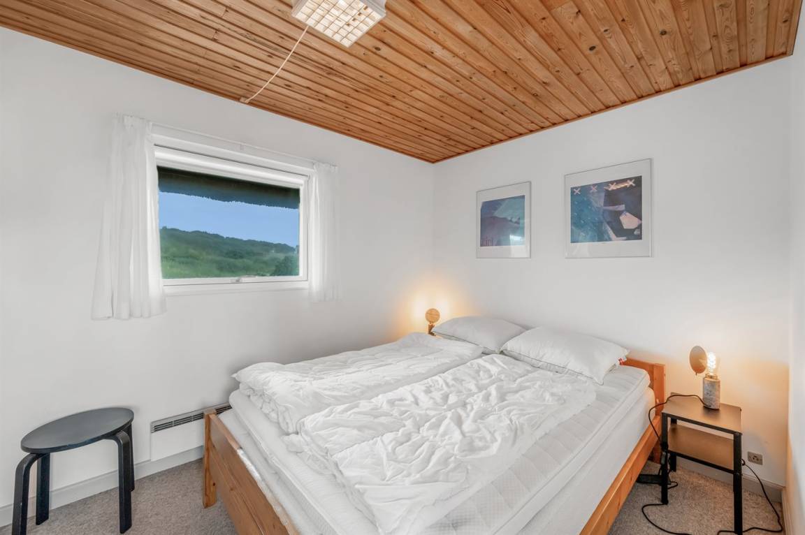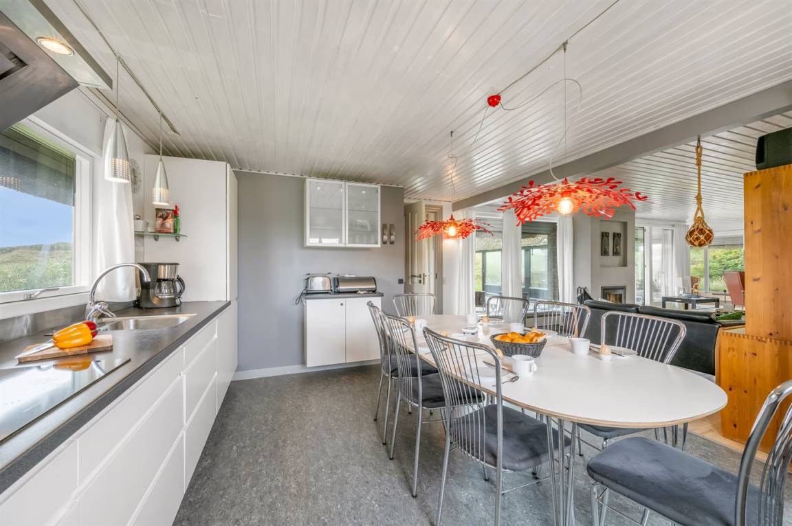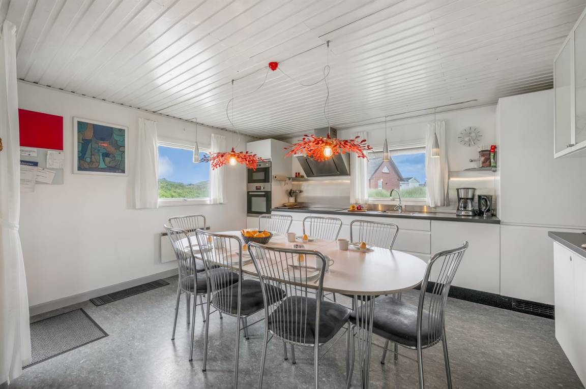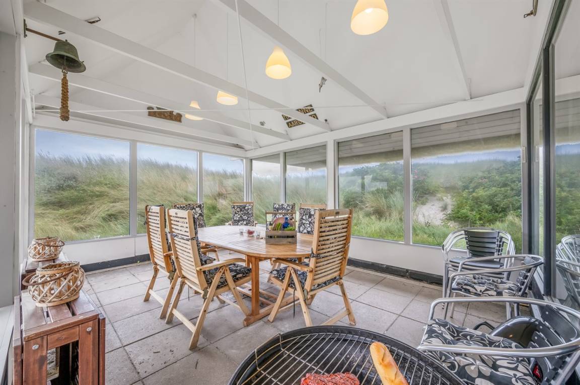 DraußenDie Ferienunterkunft liegt auf einem 16000 m² großen Dünengrundstück. Die Entfernung zum Meer beträgt 200 m. Die Entfernung zum Fjord beträgt 1000 m. Die nächste Einkaufsmöglichkeit liegt 2000 m entfernt. Es steht ein 35 m² Terrassenareal zur Verfügung. Außerdem gibt es 17 m² überdachte Terrasse. Zutritt zu einem Wintergarten. Geräteraum. Parkplatz auf dem Grundstück.