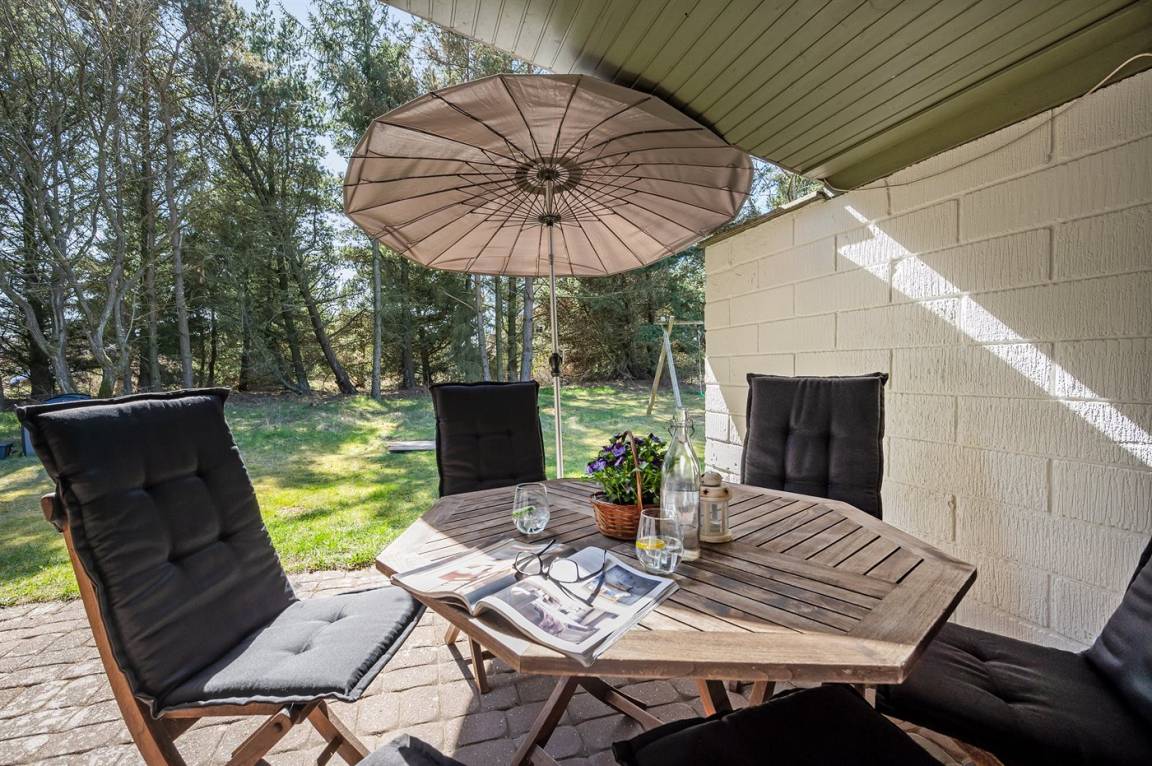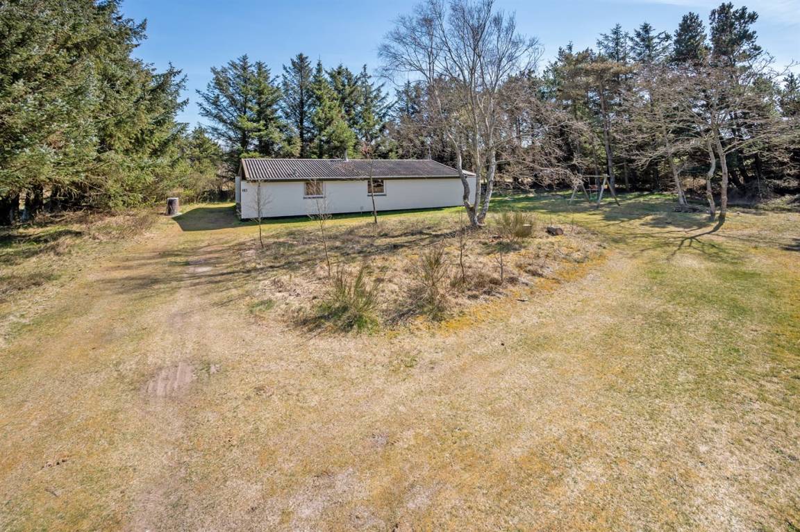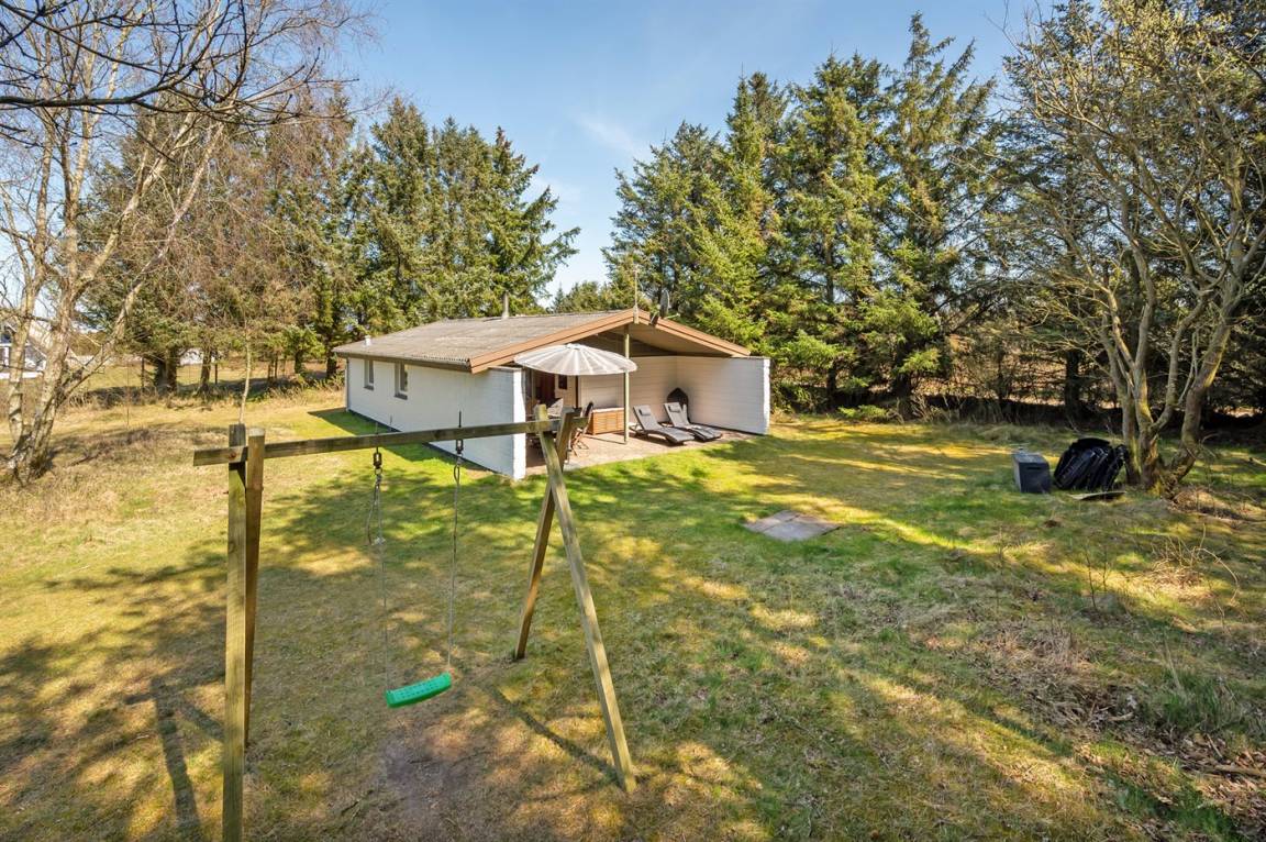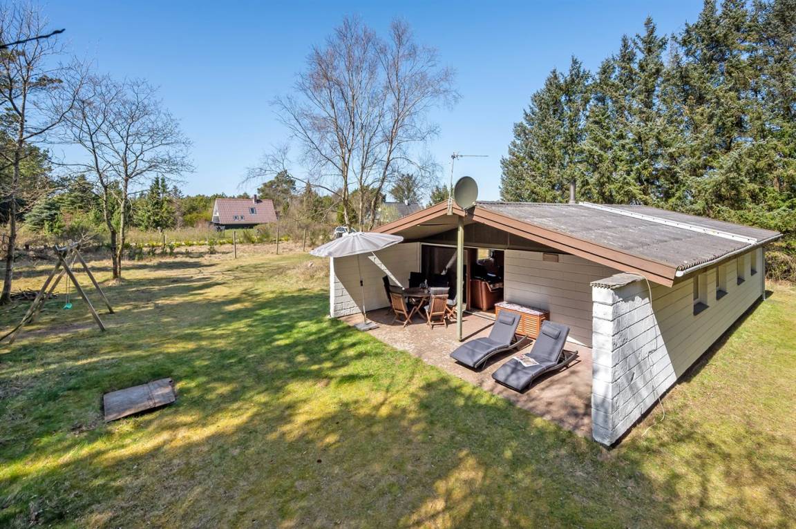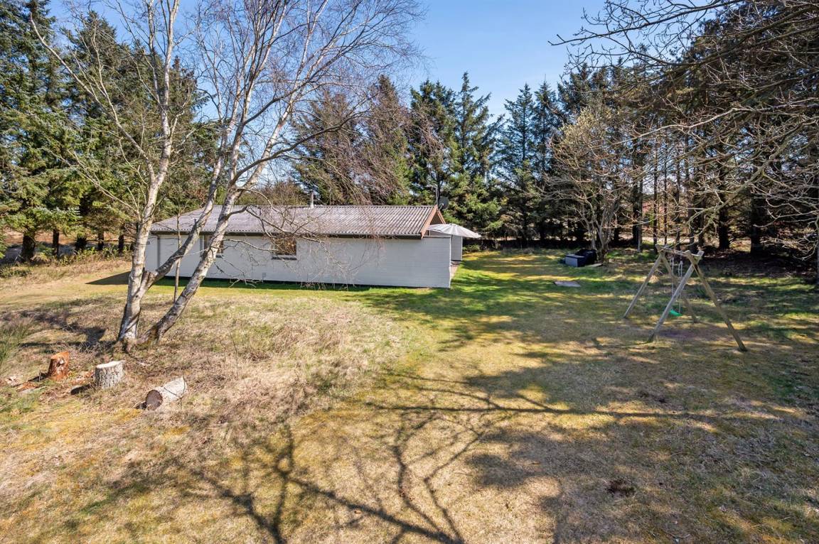 Dieses gepflegte Ferienhaus liegt auf einem großen, fast abgeschirmten Natur-/Dünengrundstück mit Bäumen, Büschen und Heidekraut, dicht am Golfplatz und Fjord.