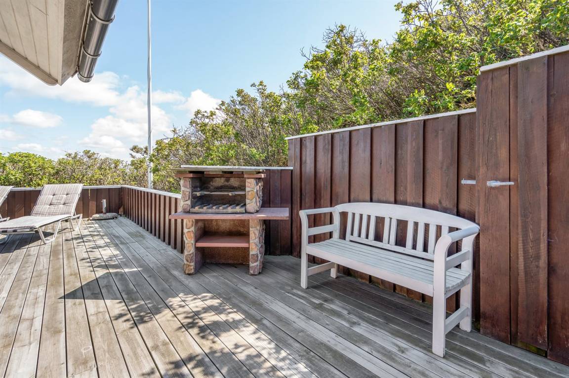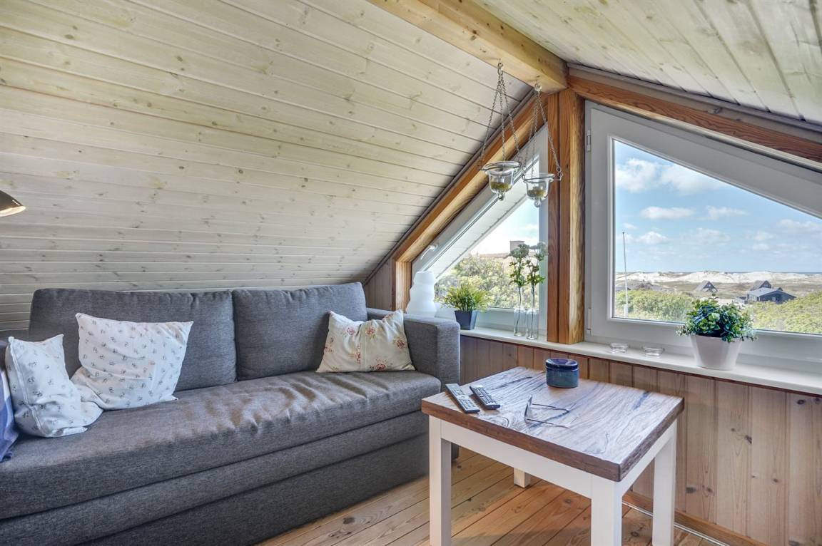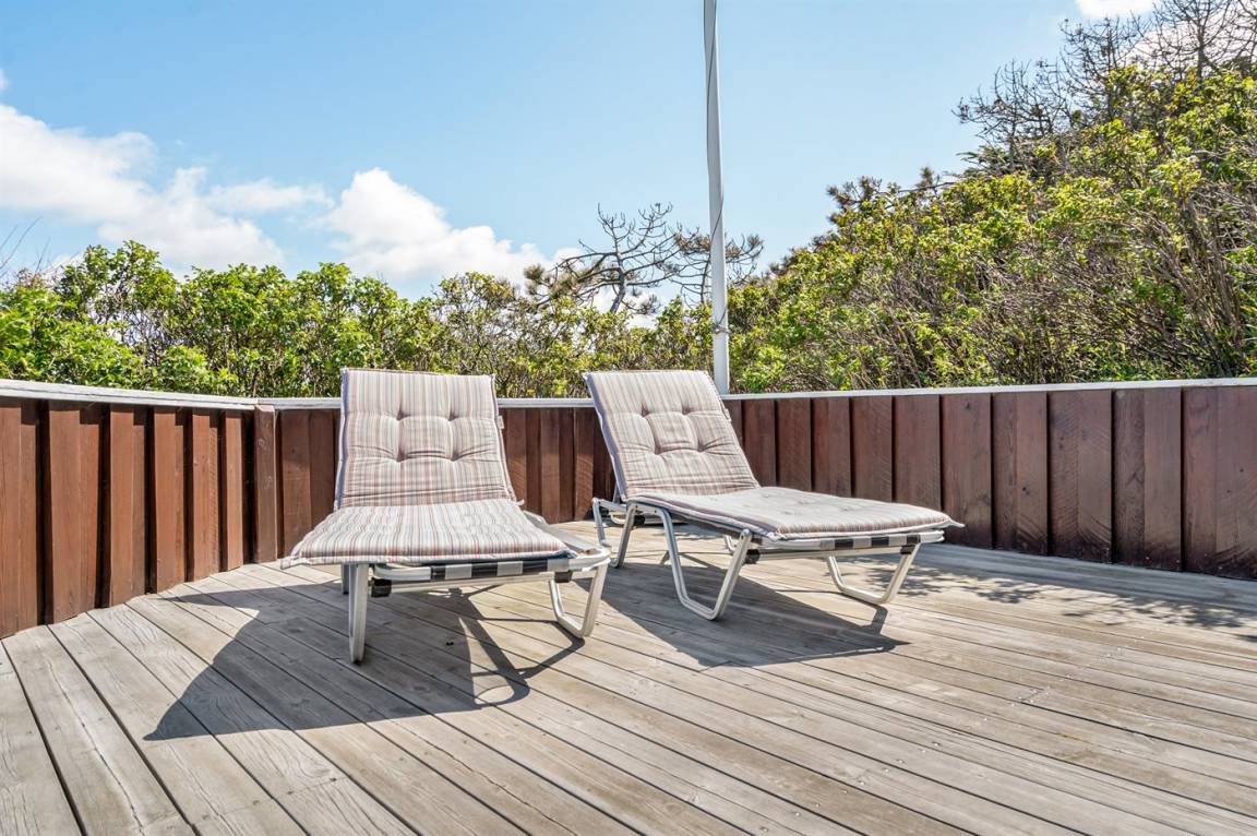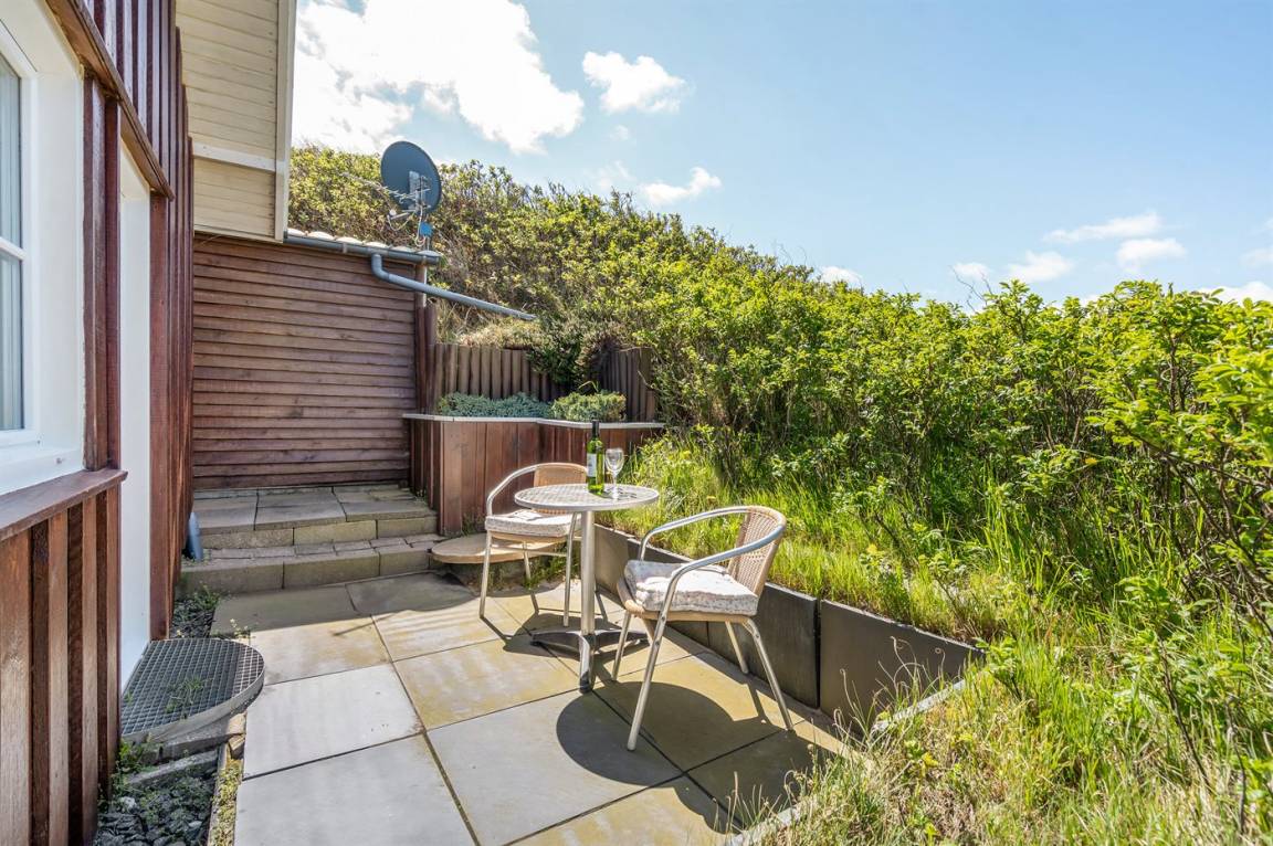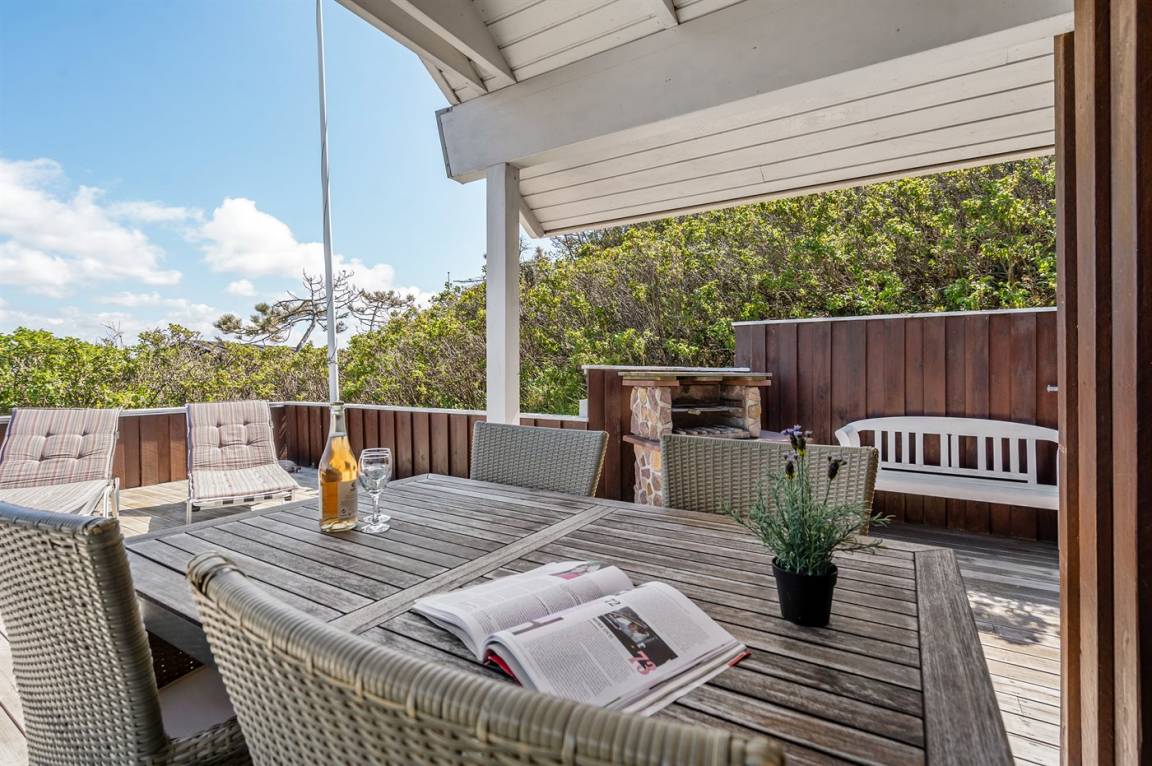 DraußenDie Ferienunterkunft liegt auf einem 400 m² großen Dünengrundstück. Die Entfernung zum Meer beträgt 200 m. Die nächste Einkaufsmöglichkeit liegt 200 m entfernt. Es steht ein 50 m² Terrassenareal zur Verfügung. Außerdem gibt es 5 m² überdachte Terrasse. Parkplatz auf dem Grundstück.
