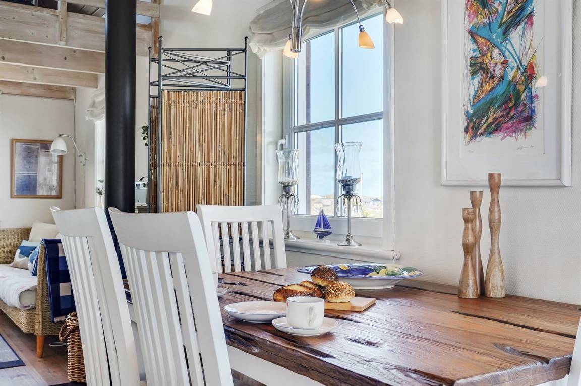 Zum Haus gehört ein schönes Terrassenareal mit windgeschützten Ecken, gemauertem Grill und diversen Gartenmöbeln. Innen gibt es Holzböden. Schönes Badezimmer mit beheizbarem Flieseboden und Duschnische. Die helle und gut eingerichtete Küche ist u. a. mit Tiefkühlgerät, Umluftofen und Herd mit Ceran-Feld ausgestattet. Das gemütliche Wohnzimmer enthält Kaminofen, DAB-Radio, DVD-Spieler sowie TV mit Chromecast und mindestens 4 deutsche Fernsehsender. Ferner kostenlose, kabellose Internetverbindung vorhanden (Computer ist mitzubringen). 1 Schlafzimmer mit Doppelbett. 2 offene Obergeschosse. Auf dem einen gibt es zusätzliches TV mit Chromecast. Auf dem anderen finden Sie eine Kuschelecke von der Sie die Aussicht auf die Nordsee so richtig genießen können.