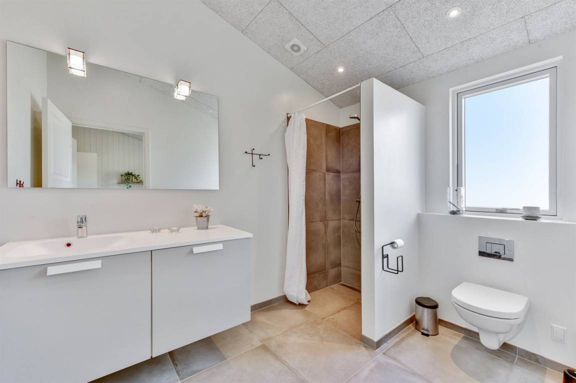 Ein schönes Ferienhaus am Ende einer Sackgasse, von der malerischen Natur zwischen Meer und Fjord umgeben. Zum Haus gehört eine große, geschlossene Terrasse mit einer Windschutzhütte für windige oder regnerische Tage.