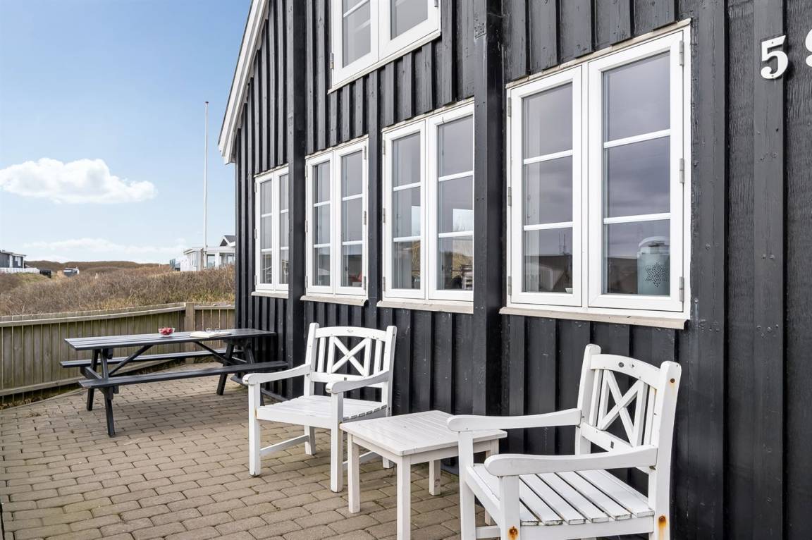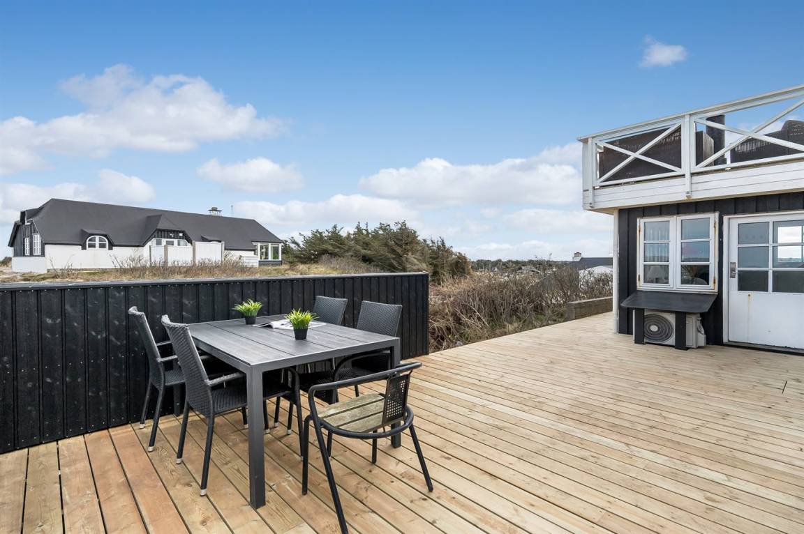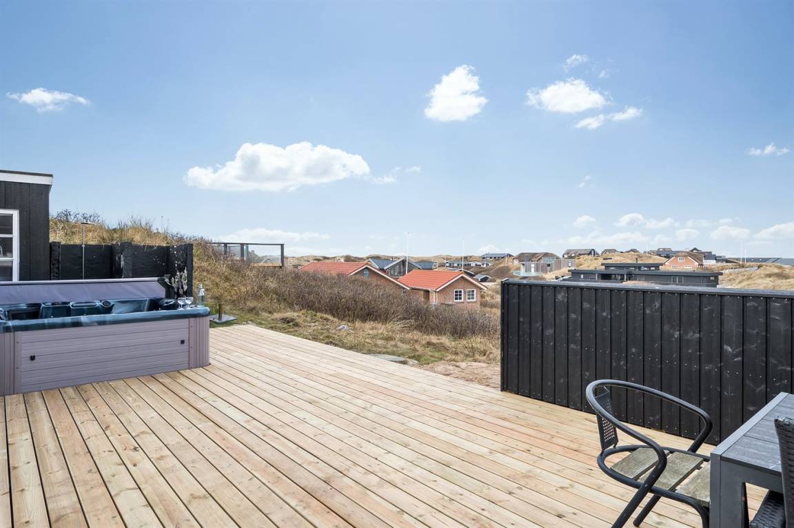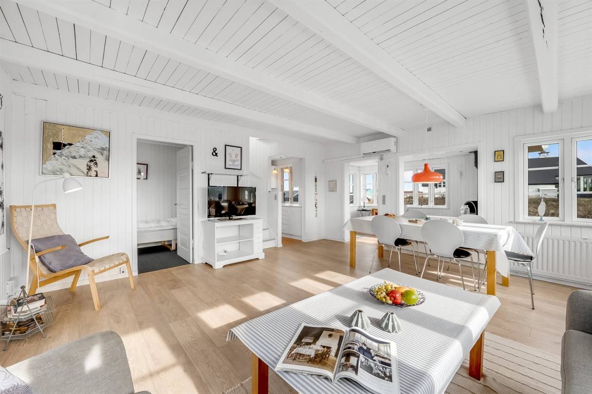 DraußenDie Ferienunterkunft liegt auf einem 1040 m² großen Naturgrundstück. Die Entfernung zum Meer beträgt 250 m. Die Entfernung zum Fjord beträgt 750 m. Die nächste Einkaufsmöglichkeit liegt 100 m entfernt. In einem Abstand von 1000 m gibt es einen Golfplatz. Es steht ein offenes Terrassenareal zur Verfügung. Außendusche. Parkplatz auf dem Grundstück.