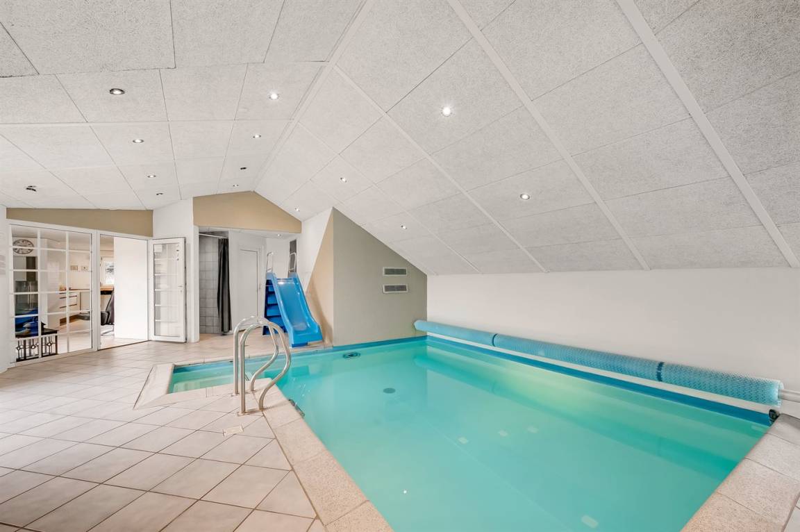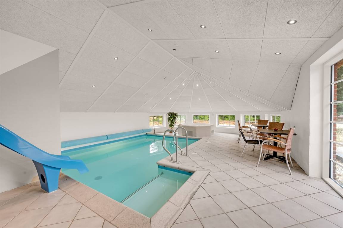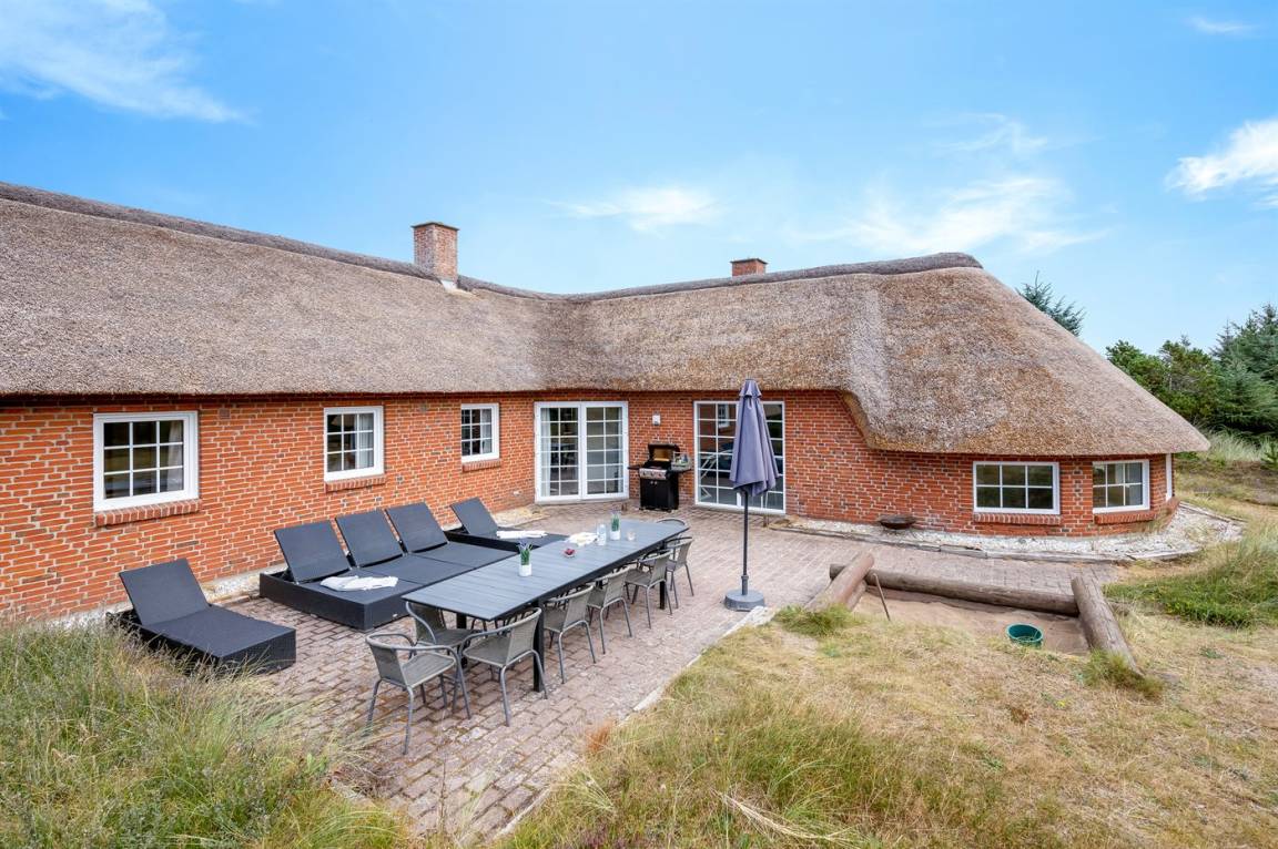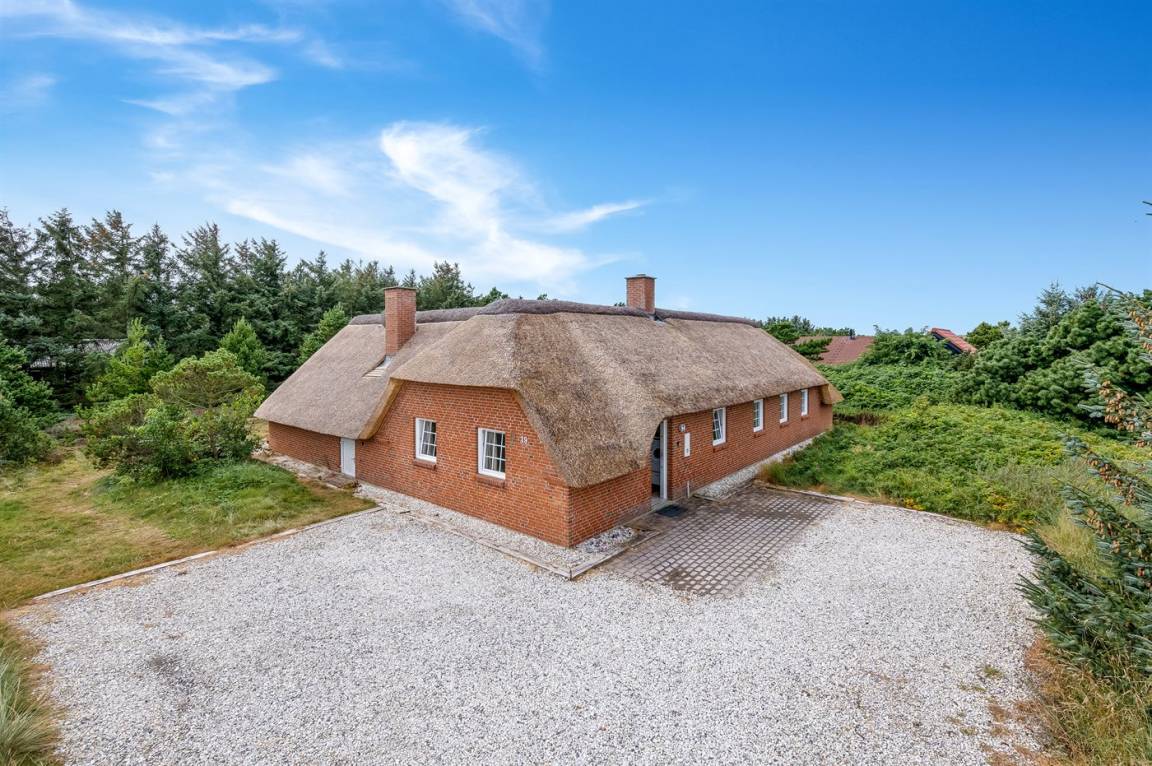 In einem naturschönen Gebiet auf Holmsland Klit, nur 900 m von der Nordsee entfernt und wenige Minuten Fahrt zum Badeort Søndervig, liegt dieses schöne und geräumige Ferienhaus. Das Haus mit Reetdach ist aus Stein 1994 gebaut und liegt auf einem schönen Natur- und Dünengrundstück. Offenes Terrassenareal mit verschiedenen Gartenmöbeln, wo Sie sich entspannen können, während die Kinder im Sandkasten oder auf der Schaukel spielen. Klinkerböden, jedoch Holzböden in den Schlafzimmern. Große, schöne Poolabteilung, wo es viele Möglichkeiten sich zu trimmen oder sich zu entspannen gibt - eine Stelle, wo Gemütlichkeit und Beisammensein gedeihen. Hier gibt es Swimmingpool, Kinderpool, Gegenstromanlage, Rutsche, 5-Pers. Standwasser-Whirlpool, Sauna und direkten Zugang zu einem der Badezimmer des Hauses mit Duschnische und beheizbarem Fußboden. Die herrliche, große Küche enthält u. a. Amerikanischer Kühlschrank (518 l Kühlschrank und 175 l Gefrierkapazität), Mikrowelle, Umluftofen und Geschirrspüler. Gemütlich eingerichtetes Wohnzimmer mit Kaminofen, TV mit digitalem Satellitenanschluss, DVD-Spieler und Stereoanlage mit CD-Spieler. 6 Schlafzimmer: 4 Zimmer mit Doppelbett und 2 Zimmer mit je 2 Einzelbetten. Außerdem ist das Haus mit Waschmaschine und Wäschetrockner ausgestattet. Für die kleinen Feriengäste gibt es Kinderbett und Kinderhochstuhl. Ein helles und freundliches Ferienhaus, das sich für mehrere Familien gut eignet - nicht weit vom Badeort Søndervig entfernt.