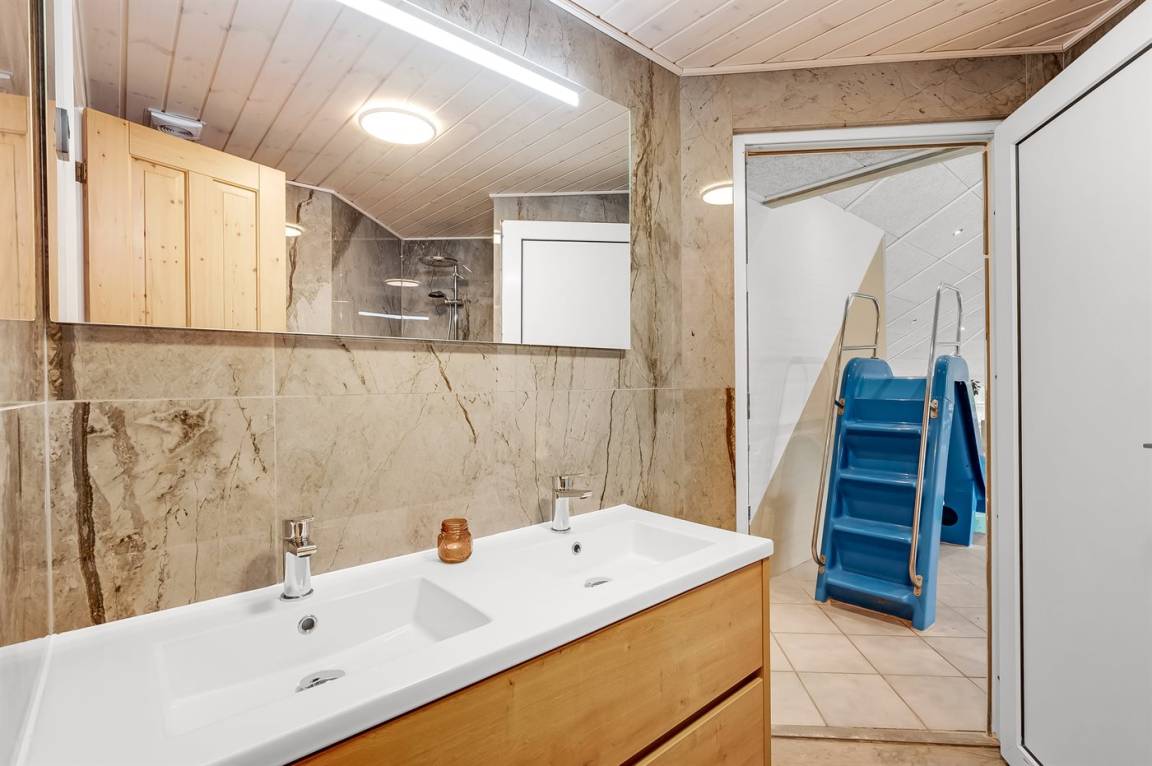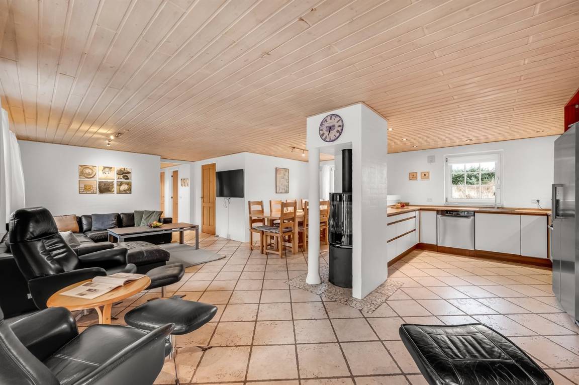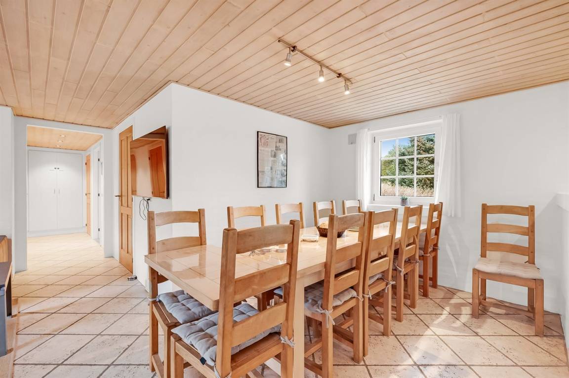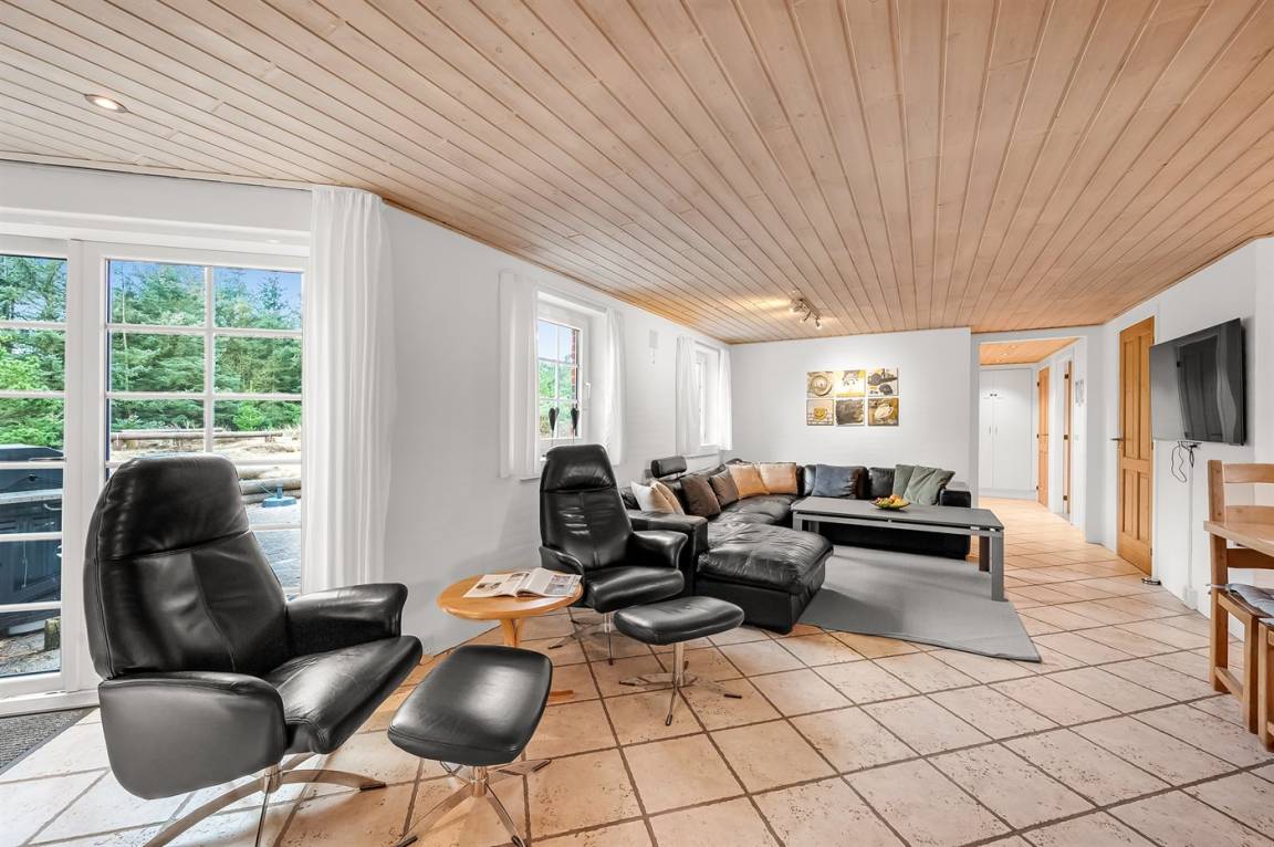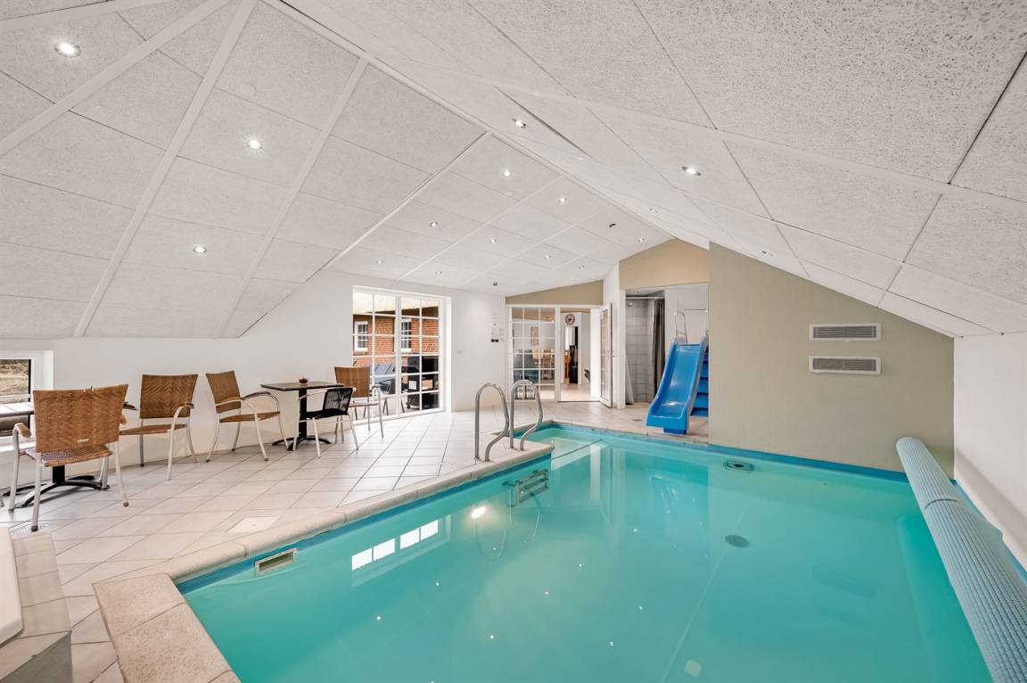 In einem naturschönen Gebiet auf Holmsland Klit, nur 900 m von der Nordsee entfernt und wenige Minuten Fahrt zum Badeort Søndervig, liegt dieses schöne und geräumige Ferienhaus. Das Haus mit Reetdach ist aus Stein 1994 gebaut und liegt auf einem schönen Natur- und Dünengrundstück. Offenes Terrassenareal mit verschiedenen Gartenmöbeln, wo Sie sich entspannen können, während die Kinder im Sandkasten oder auf der Schaukel spielen. Klinkerböden, jedoch Holzböden in den Schlafzimmern. Große, schöne Poolabteilung, wo es viele Möglichkeiten sich zu trimmen oder sich zu entspannen gibt - eine Stelle, wo Gemütlichkeit und Beisammensein gedeihen. Hier gibt es Swimmingpool, Kinderpool, Gegenstromanlage, Rutsche, 5-Pers. Standwasser-Whirlpool, Sauna und direkten Zugang zu einem der Badezimmer des Hauses mit Duschnische und beheizbarem Fußboden. Die herrliche, große Küche enthält u. a. Amerikanischer Kühlschrank (518 l Kühlschrank und 175 l Gefrierkapazität), Mikrowelle, Umluftofen und Geschirrspüler. Gemütlich eingerichtetes Wohnzimmer mit Kaminofen, TV mit digitalem Satellitenanschluss, DVD-Spieler und Stereoanlage mit CD-Spieler. 6 Schlafzimmer: 4 Zimmer mit Doppelbett und 2 Zimmer mit je 2 Einzelbetten. Außerdem ist das Haus mit Waschmaschine und Wäschetrockner ausgestattet. Für die kleinen Feriengäste gibt es Kinderbett und Kinderhochstuhl. Ein helles und freundliches Ferienhaus, das sich für mehrere Familien gut eignet - nicht weit vom Badeort Søndervig entfernt.