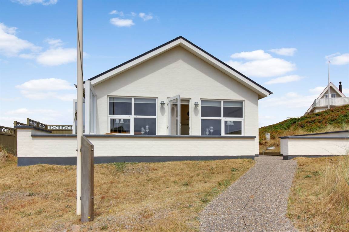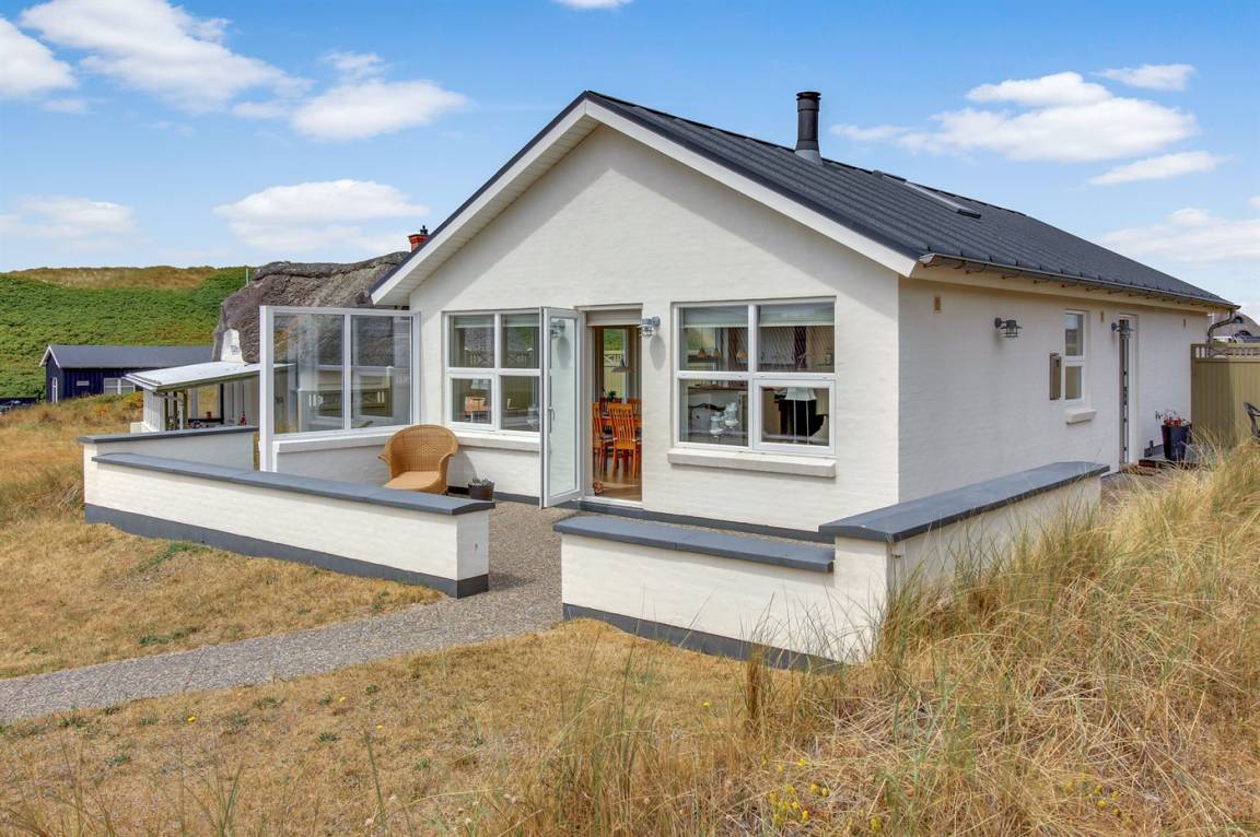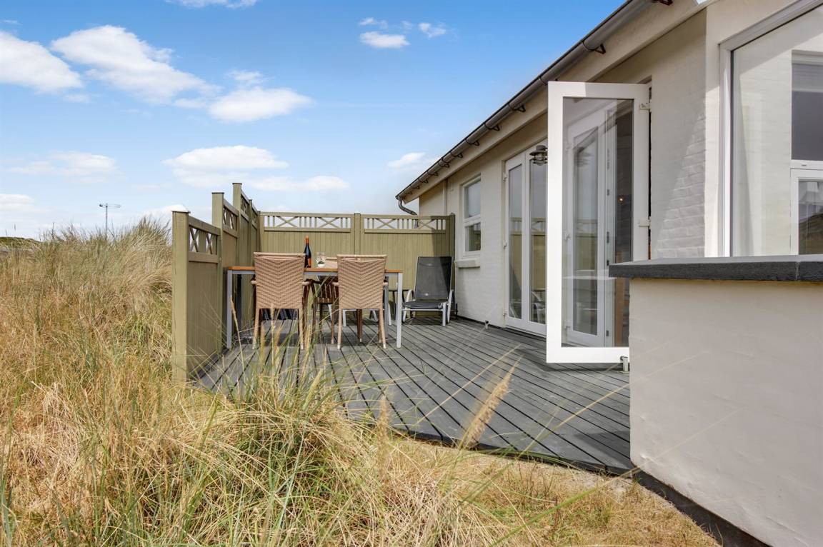 DraußenDie Ferienunterkunft liegt auf einem 1000 m² großen Dünengrundstück. Die Entfernung zum Meer beträgt 100 m. Die nächste Einkaufsmöglichkeit liegt 1000 m entfernt. Es steht ein 50 m² Terrassenareal zur Verfügung. Parkplatz auf dem Grundstück.