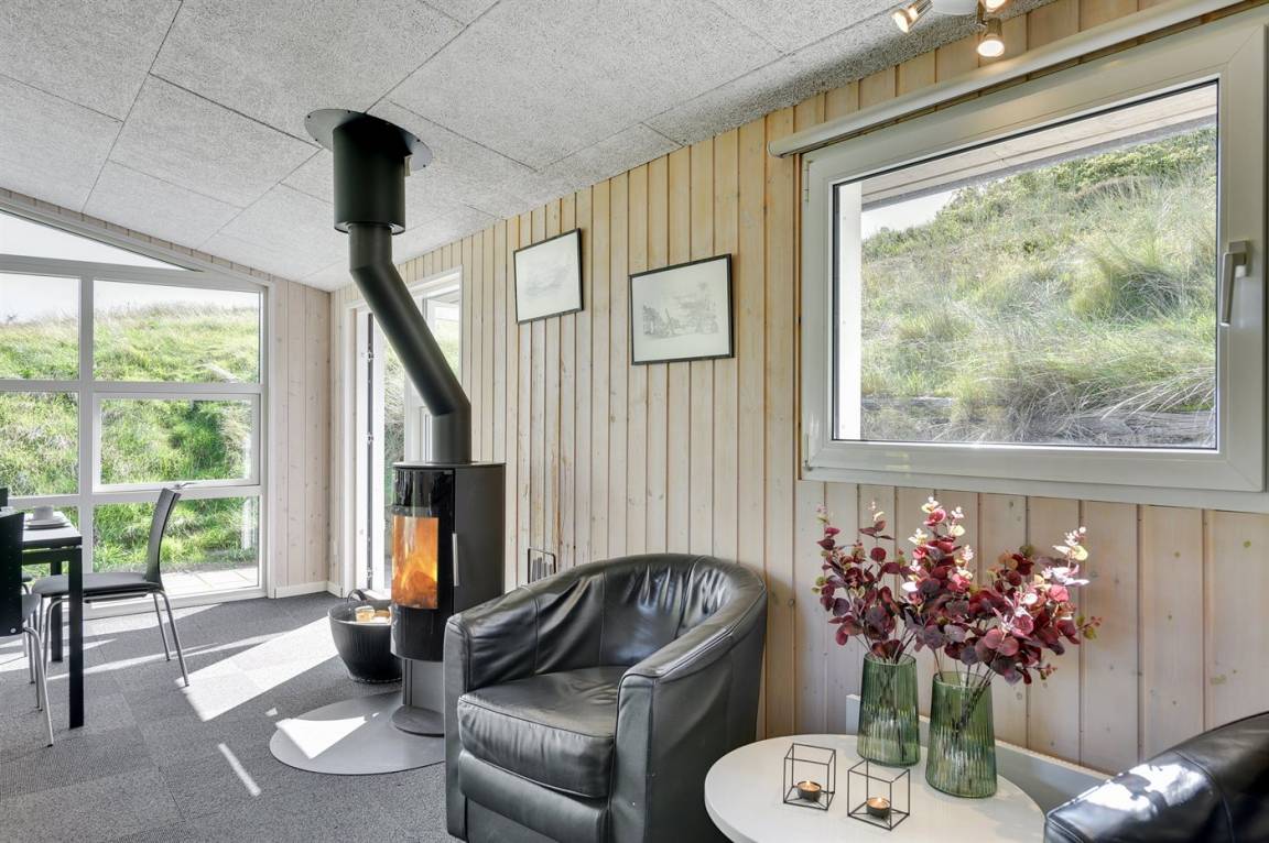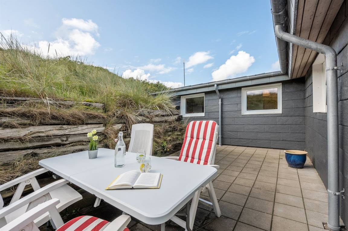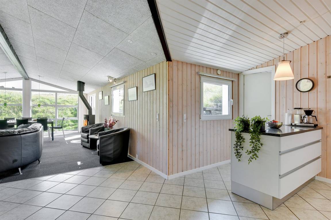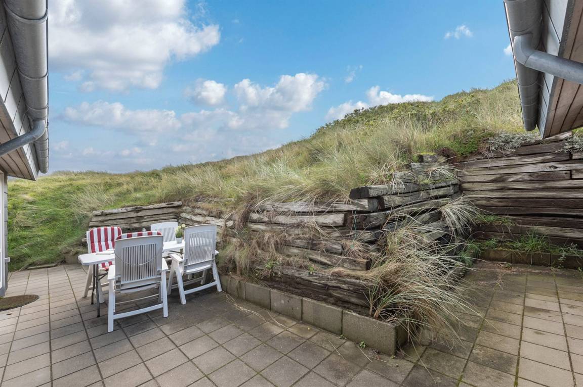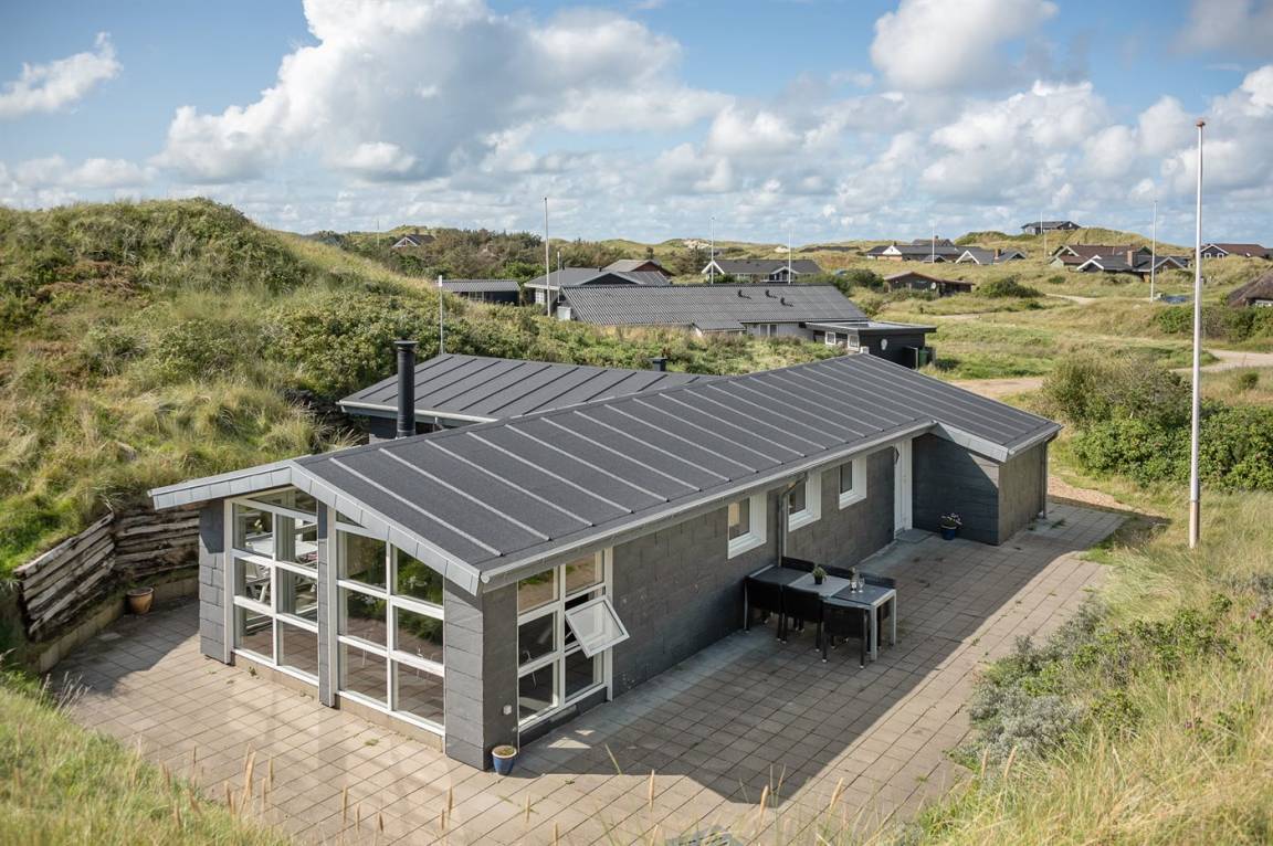 DraußenDie Ferienunterkunft liegt auf einem 1200 m² großen Dünengrundstück. Die Entfernung zum Meer beträgt 400 m. Die Entfernung zum Fjord beträgt 4000 m. Die nächste Einkaufsmöglichkeit liegt 400 m entfernt. Es steht ein 35 m² Terrassenareal zur Verfügung. Parkplatz auf dem Grundstück.