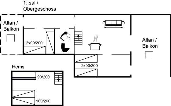 SchlafverhältnisseDie Schlafplätze verteilen sich auf 2 Schlafräume. 2 Schlafplätze in einem Doppelbett. 4 Schlafplätze in Einzelbetten. 2 Schlafplätze in einem Etagenbett. 4 von diesen Schlafplätzen befinden sich im offenen Obergeschoss.