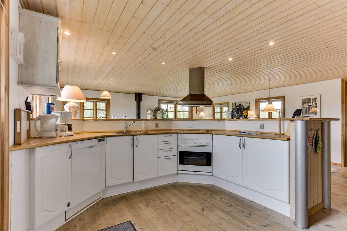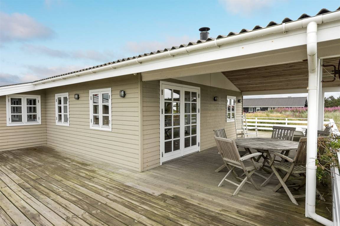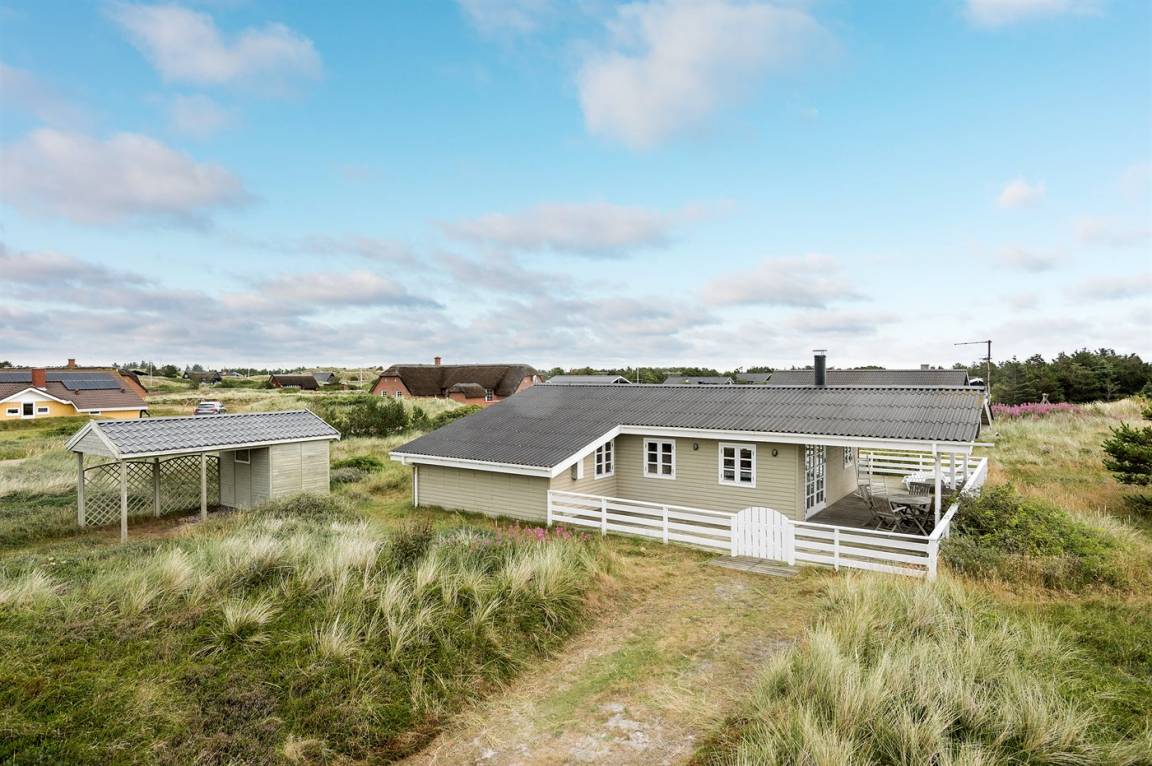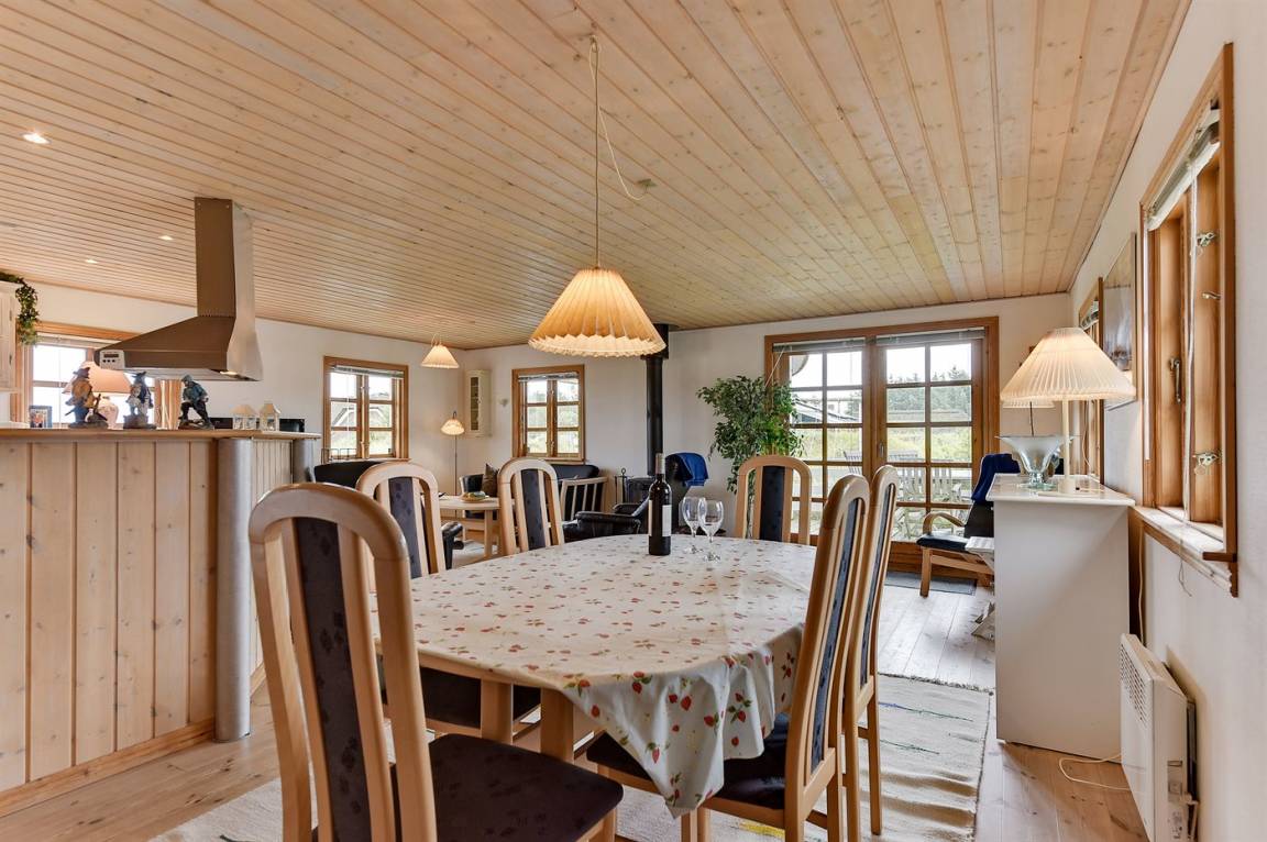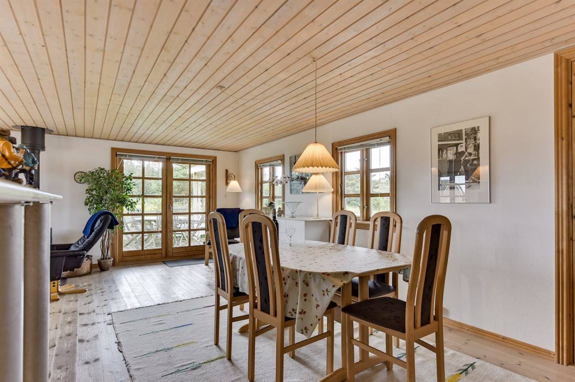 Schönes Ferienhaus aus Holz, 2000 gebaut, auf einem schönen Naturgrundstück gelegen, nur 600 m vom Strand entfernt. Schöne offene sowie überdachte Terrassen mit Gartenmöbeln. Hell gebeizte Holzböden und -decken. Gestrichene Wände. Badezimmer mit beheiztem Klinkerboden und Duschnische. Vom Badezimmer hat man direkten Zutritt zur Sauna. Die Küche ist gut ausgestattet mit u. a. Herd mit Ceran-Feld, Mikrowelle, Warmluftofen, Tiefkühlgerät und Geschirrspüler. Das gemütliche Wohnzimmer enthält Kaminofen, TV mit digitalem Satellitenanschluss und Radio. Kinderbett, Kinderhochstuhl, Sandkasten und Schaukel für die Kinder. Waschmaschine und Wäschetrockner vorh. Ausserdem kostenlose kabellose Internetverbindung. Ein wirklich herrliches Ferienhaus! Gute Aktivitätsmöglichkeiten in der Gegend.