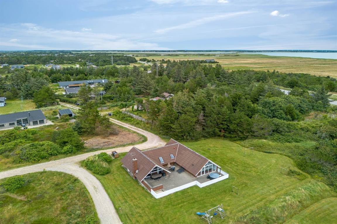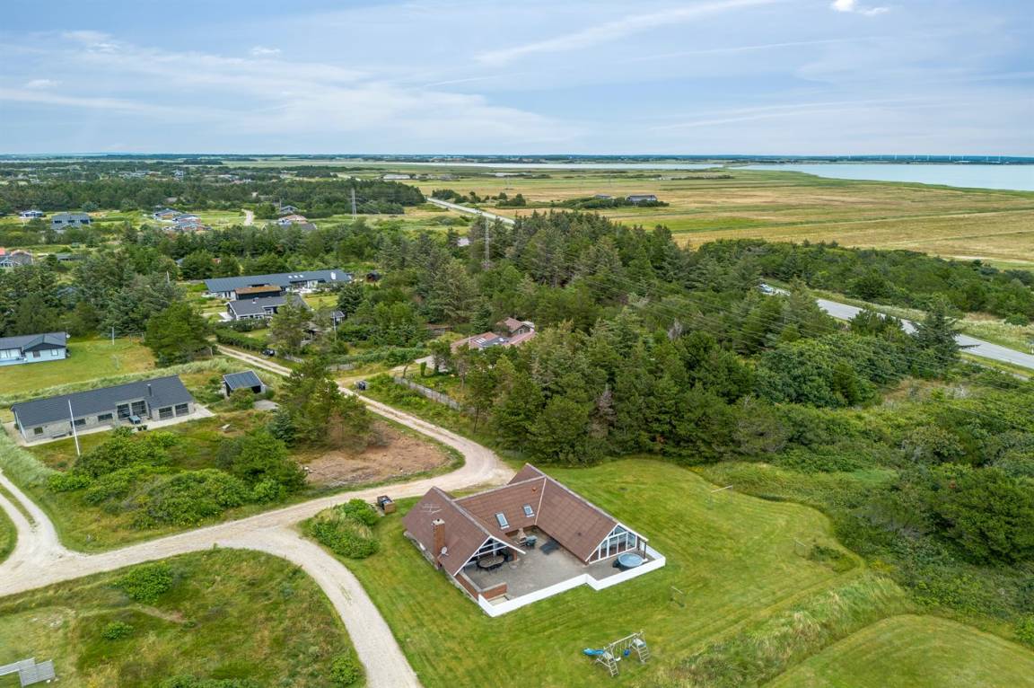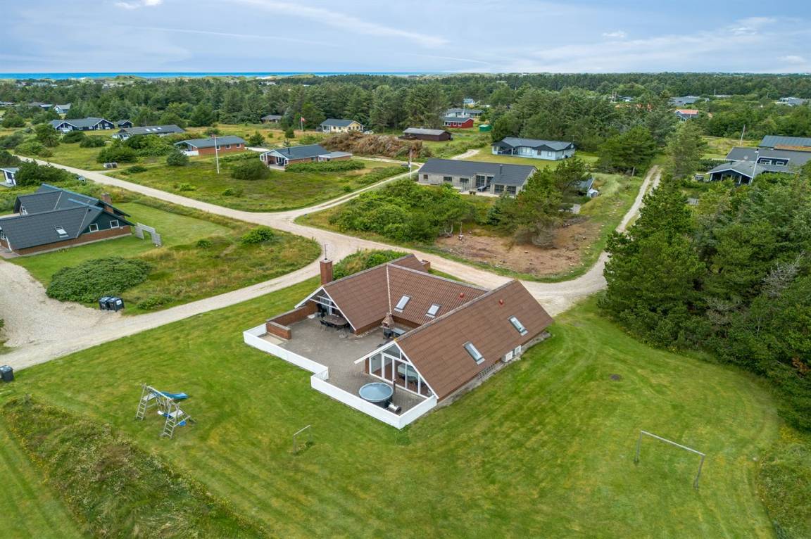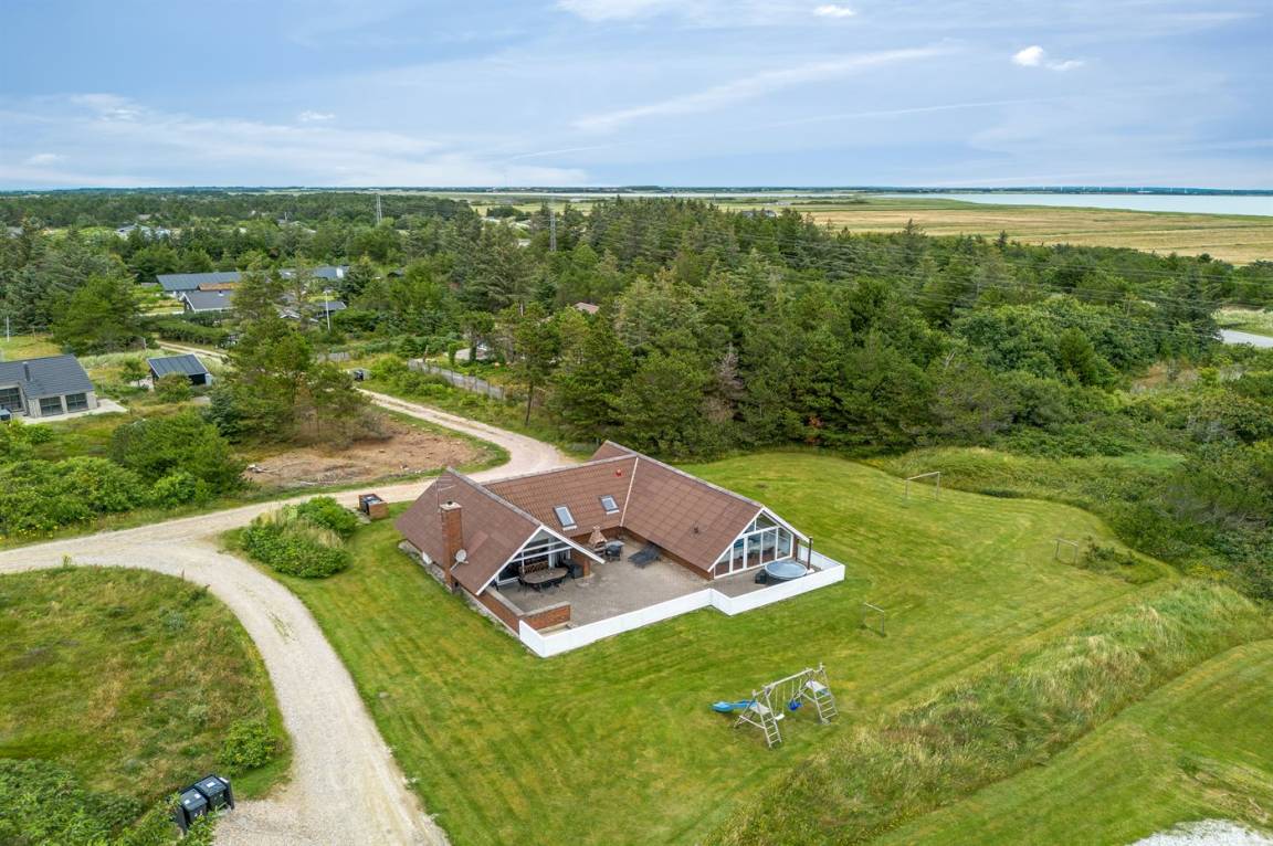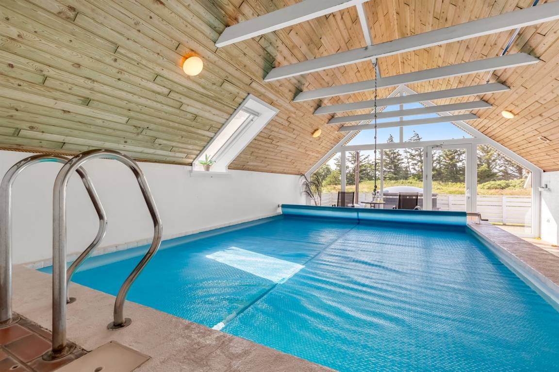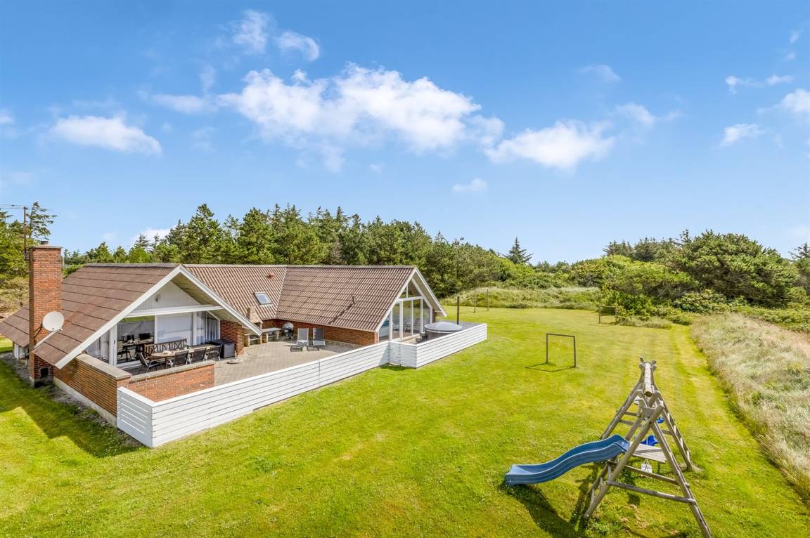 Ein geräumiges und gepflegtes Ferienhaus mit Swimmingpool und Sauna. Das Ferienhaus ist laufend modernisiert, und liegt auf einem großen Naturgrundstück. Zum Haus gehört ein schönes, großes Terrassenareal mit gutem Windschutz, Gartenmöbeln und Grill/Kamin. Auf dem Grundstück, mit guten Spielmöglichkeiten, finden Sie Spielturm mit Rutsche und Schaukel sowie Sandkasten. Es sind zwei energiesparende Wärmepumpen installiert: Eine Luft-Wasser Wärmepumpe in der Swimmingpool-Abteilung und eine Luft-Luft Wärmepumpe im Wohnzimmer. Ein gutes Ferienhaus - in einem Gebiet mit guten Aktivitätsmöglichkeiten gelegen und nur wenige Minuten Fahrt vom Badeort Søndervig entfernt.