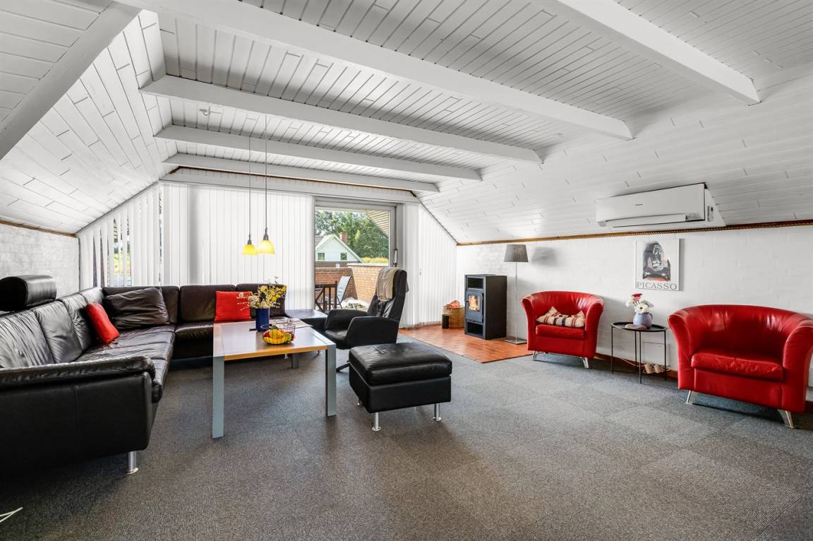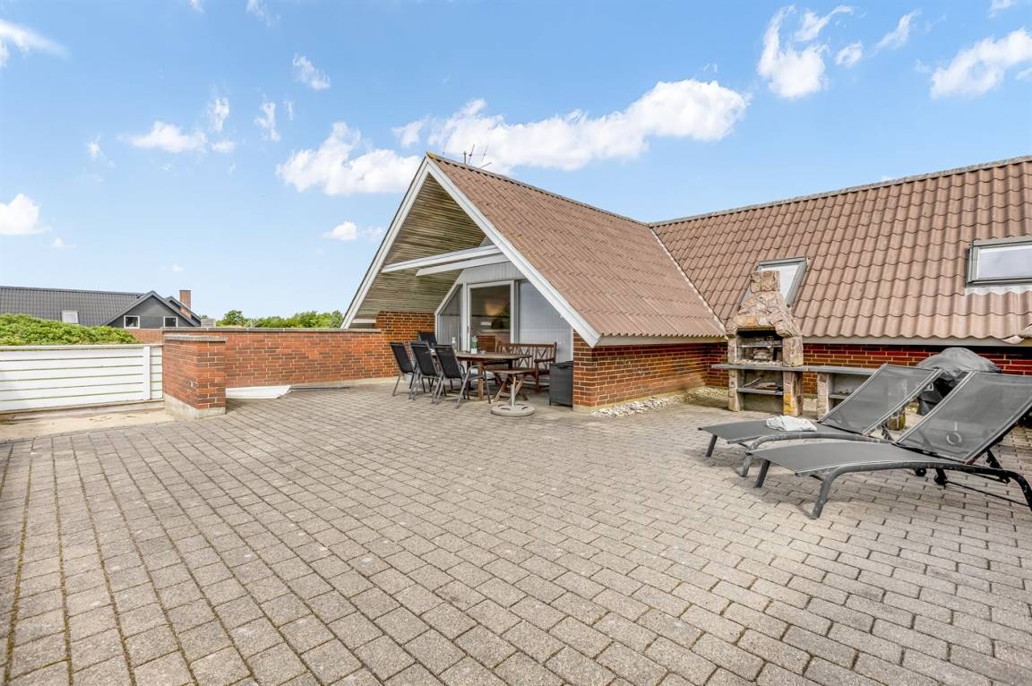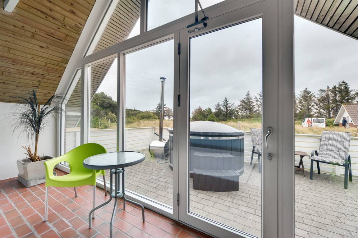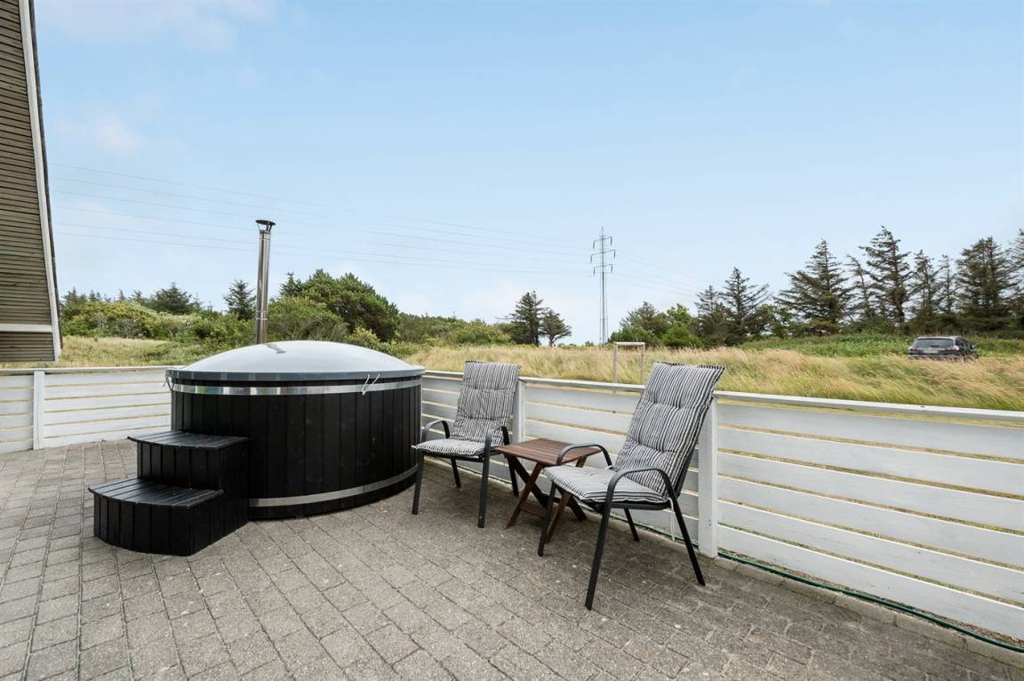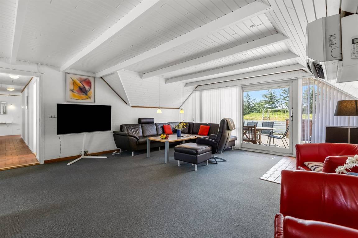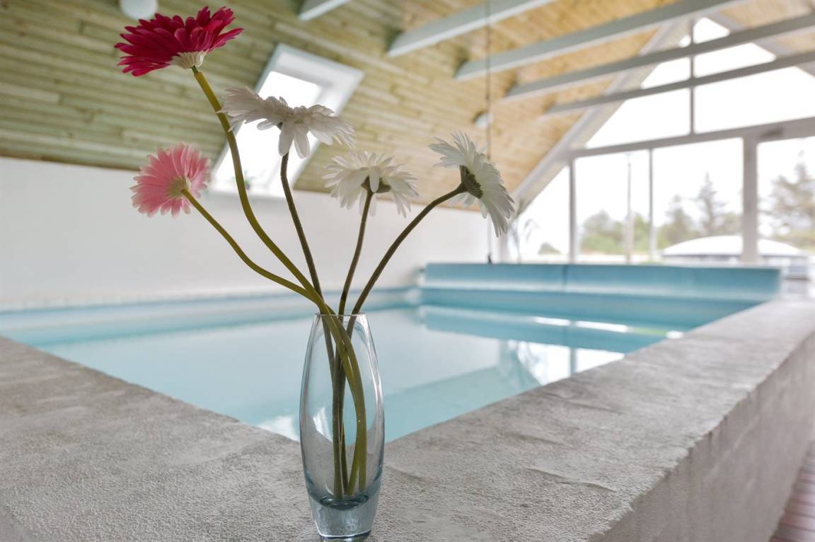 Ein geräumiges und gepflegtes Ferienhaus mit Swimmingpool und Sauna. Das Ferienhaus ist laufend modernisiert, und liegt auf einem großen Naturgrundstück. Zum Haus gehört ein schönes, großes Terrassenareal mit gutem Windschutz, Gartenmöbeln und Grill/Kamin. Auf dem Grundstück, mit guten Spielmöglichkeiten, finden Sie Spielturm mit Rutsche und Schaukel sowie Sandkasten. Es sind zwei energiesparende Wärmepumpen installiert: Eine Luft-Wasser Wärmepumpe in der Swimmingpool-Abteilung und eine Luft-Luft Wärmepumpe im Wohnzimmer. Ein gutes Ferienhaus - in einem Gebiet mit guten Aktivitätsmöglichkeiten gelegen und nur wenige Minuten Fahrt vom Badeort Søndervig entfernt.