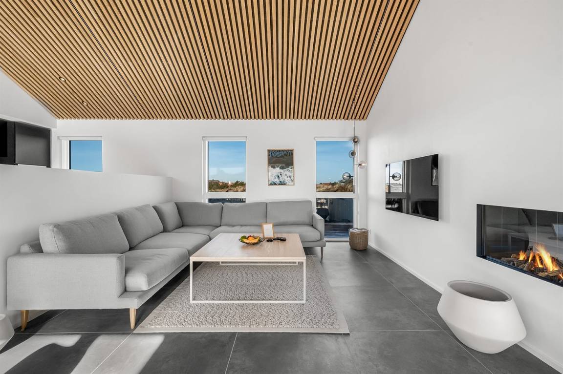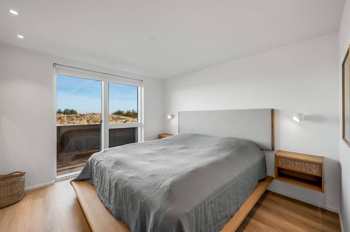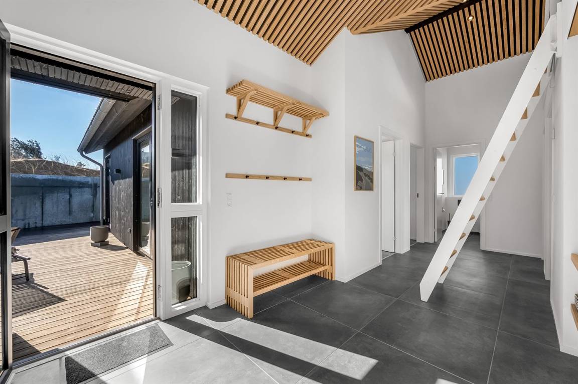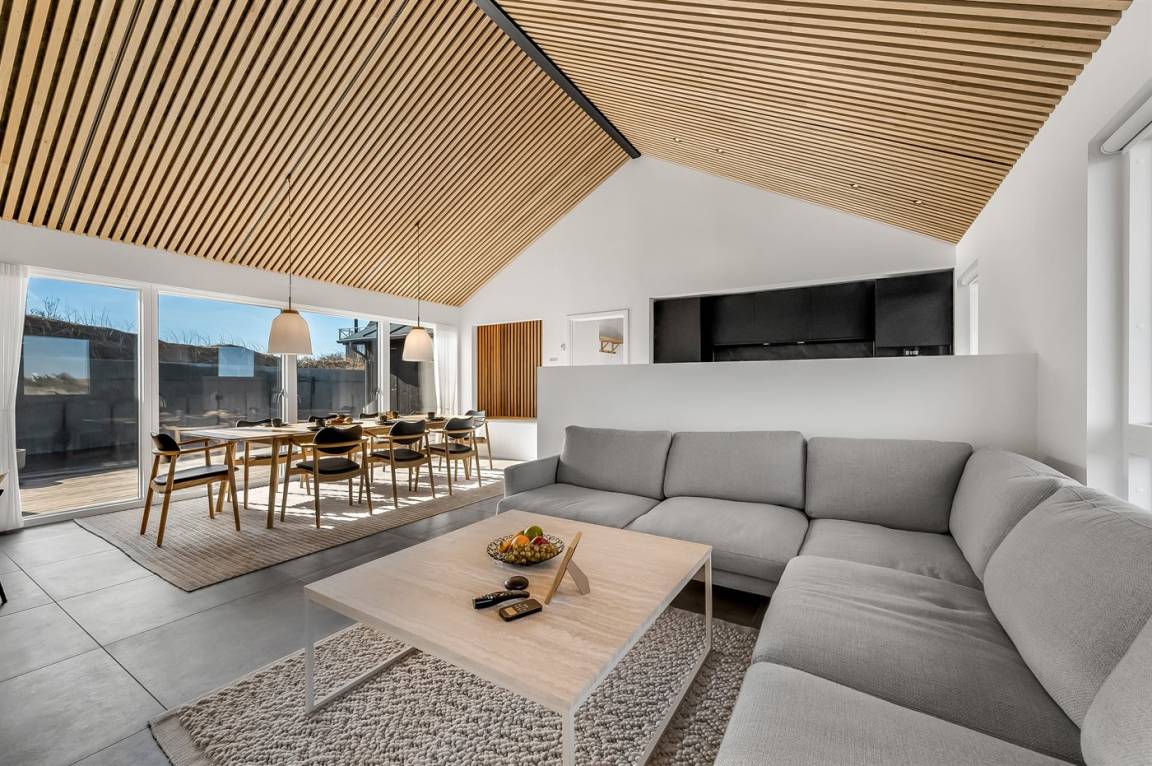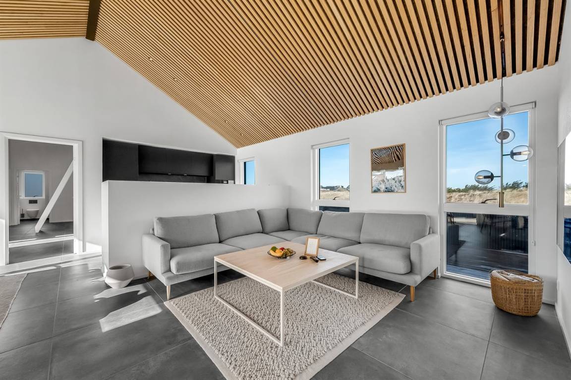 DraußenDie Ferienunterkunft liegt auf einem 1200 m² großen Naturgrundstück. Die Entfernung zum Meer beträgt 250 m. Die Entfernung zum Fjord beträgt 750 m. Die nächste Einkaufsmöglichkeit liegt 100 m entfernt. In einem Abstand von 1000 m gibt es einen Golfplatz. Es stehen 135 m² offene sowie 15 m² überdachte Terrasse zur Verfügung. Davon sind insgesamt 150 m² geschlossen. Außendusche. Es ist ein Ladestecker für Elektroautos installiert. Ladestecker Typ 2. Mit einer Ladeleistung von 11 kW. Parkplatz auf dem Grundstück.
