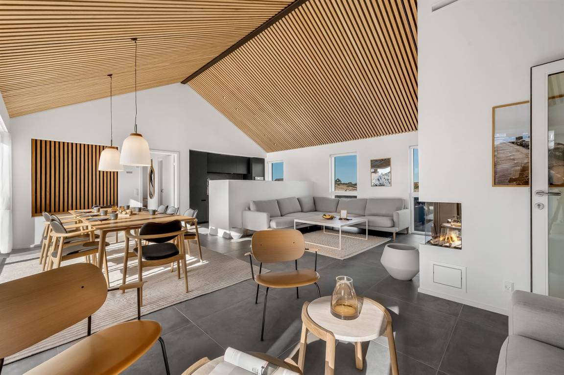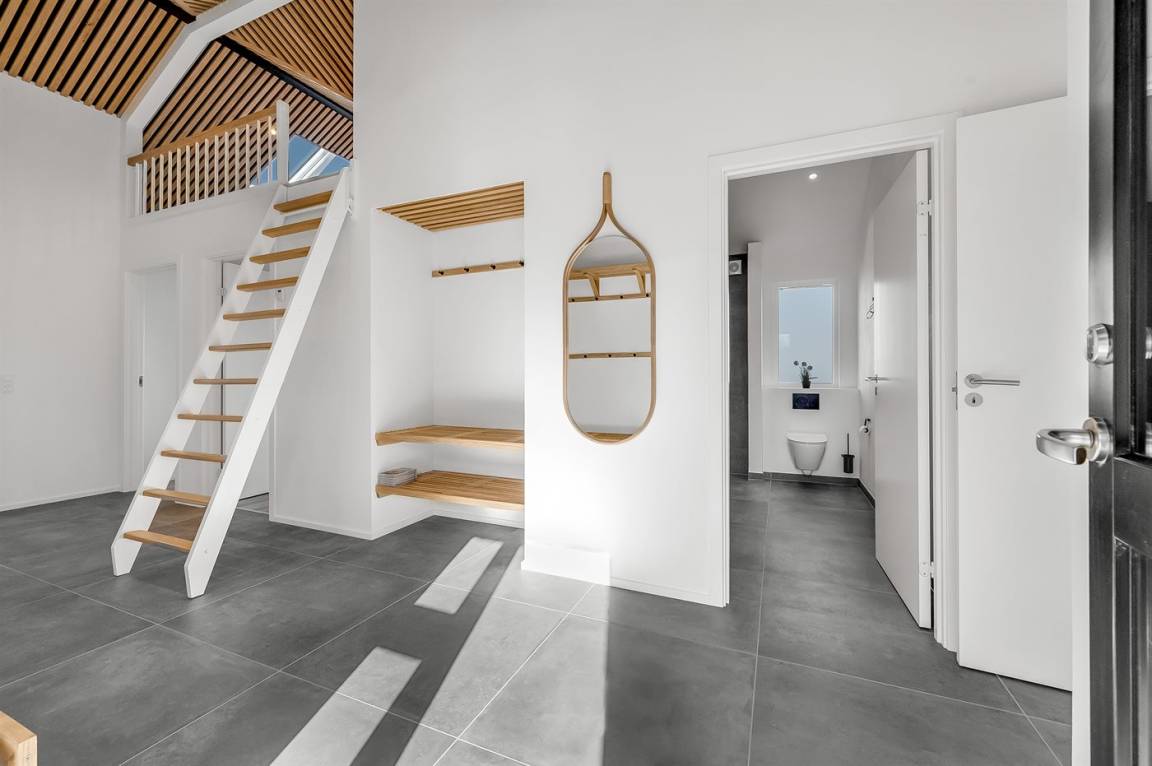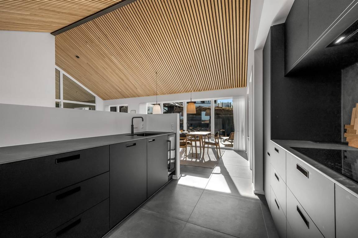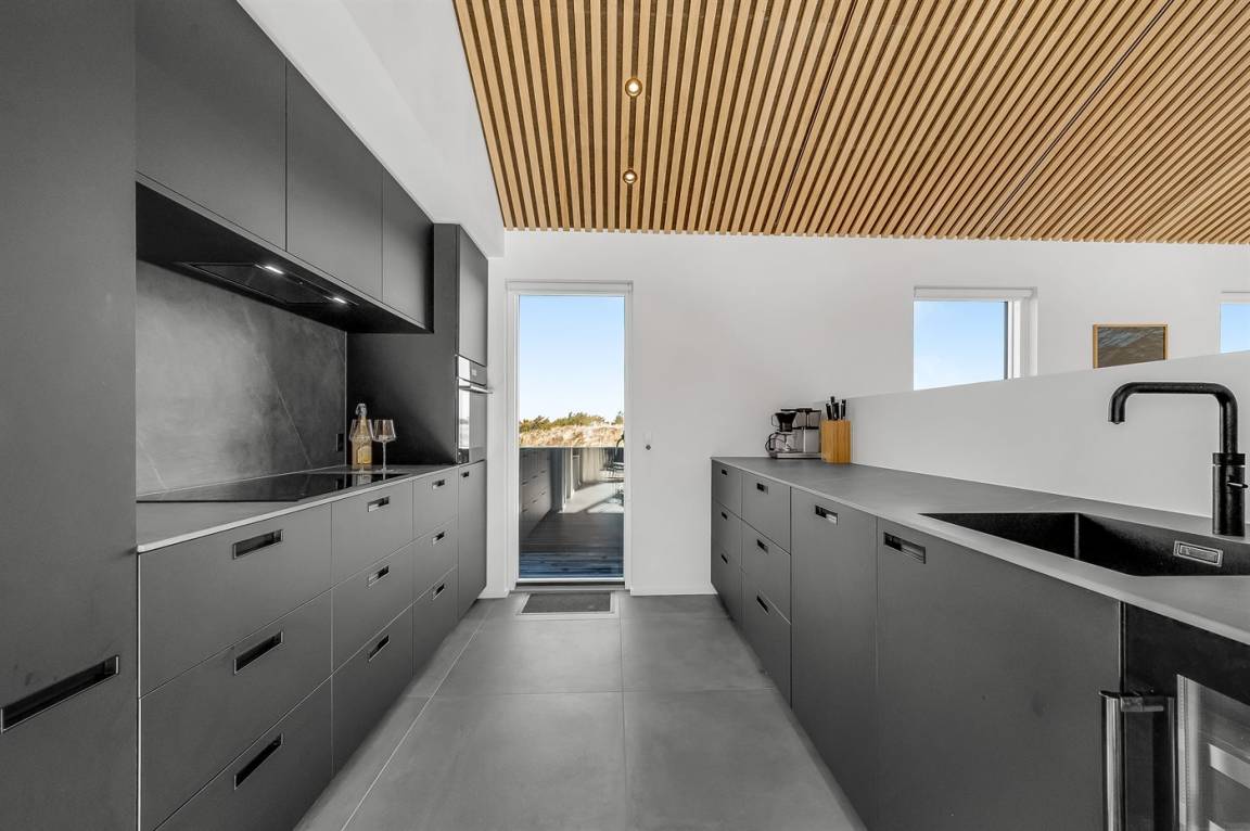 DraußenDie Ferienunterkunft liegt auf einem 1200 m² großen Naturgrundstück. Die Entfernung zum Meer beträgt 250 m. Die Entfernung zum Fjord beträgt 750 m. Die nächste Einkaufsmöglichkeit liegt 100 m entfernt. In einem Abstand von 1000 m gibt es einen Golfplatz. Es stehen 135 m² offene sowie 15 m² überdachte Terrasse zur Verfügung. Davon sind insgesamt 150 m² geschlossen. Außendusche. Es ist ein Ladestecker für Elektroautos installiert. Ladestecker Typ 2. Mit einer Ladeleistung von 11 kW. Parkplatz auf dem Grundstück.