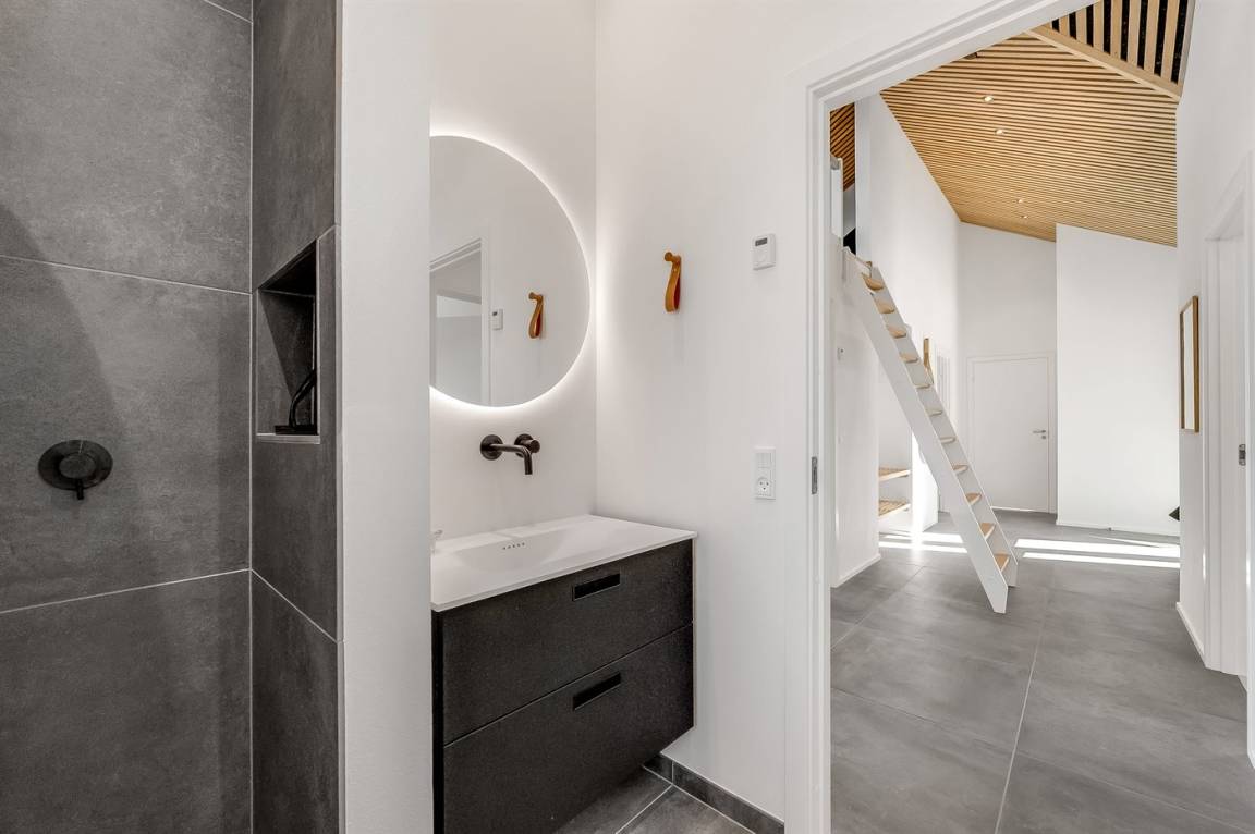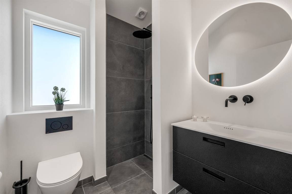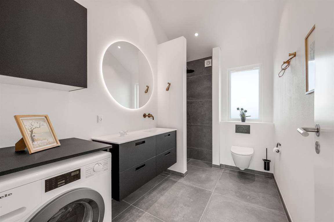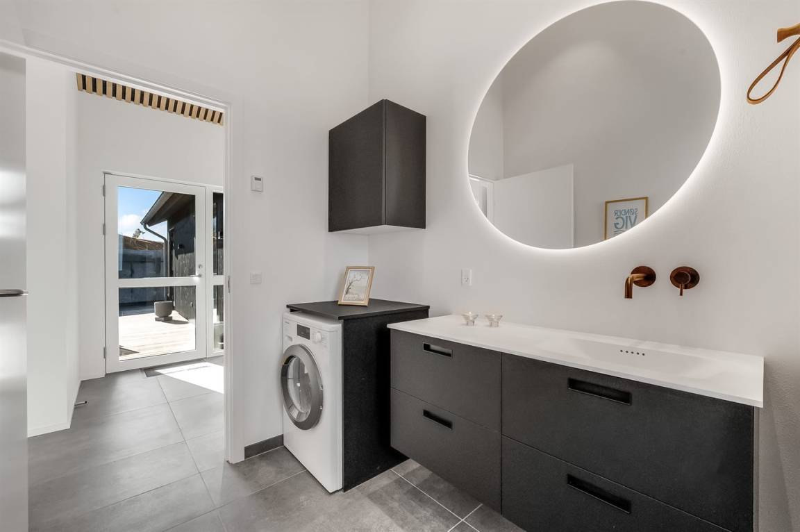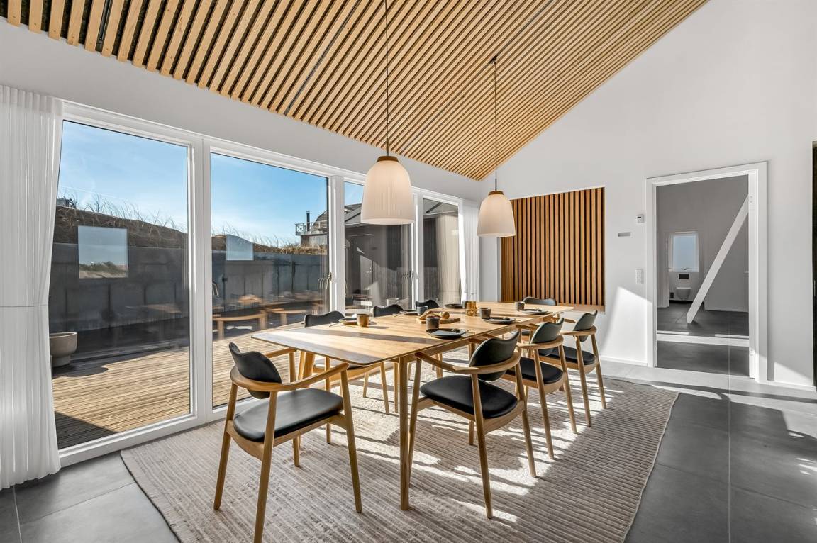 DraußenDie Ferienunterkunft liegt auf einem 1200 m² großen Naturgrundstück. Die Entfernung zum Meer beträgt 250 m. Die Entfernung zum Fjord beträgt 750 m. Die nächste Einkaufsmöglichkeit liegt 100 m entfernt. In einem Abstand von 1000 m gibt es einen Golfplatz. Es stehen 135 m² offene sowie 15 m² überdachte Terrasse zur Verfügung. Davon sind insgesamt 150 m² geschlossen. Außendusche. Es ist ein Ladestecker für Elektroautos installiert. Ladestecker Typ 2. Mit einer Ladeleistung von 11 kW. Parkplatz auf dem Grundstück.