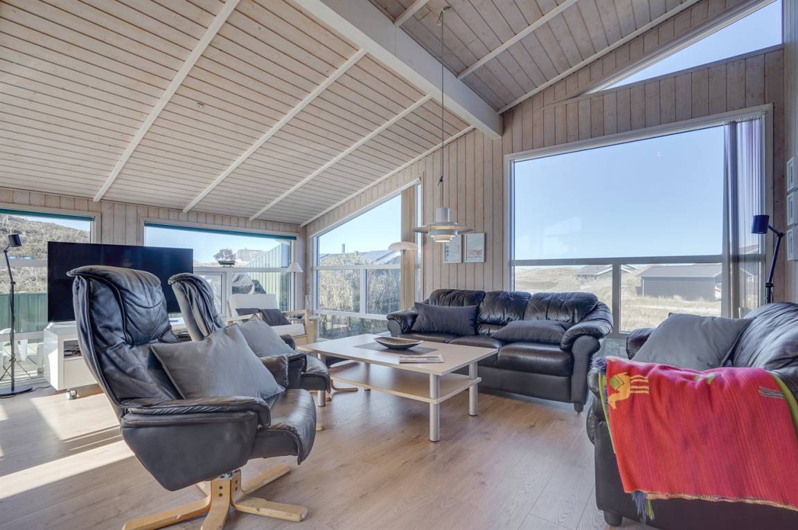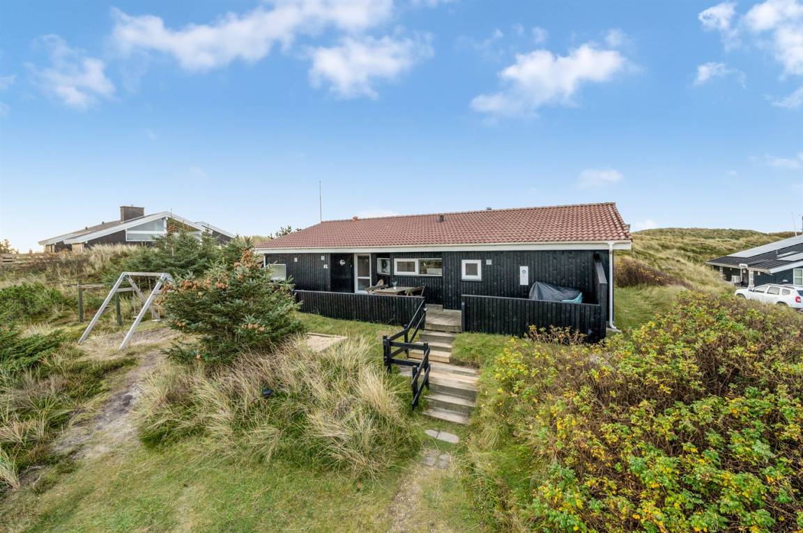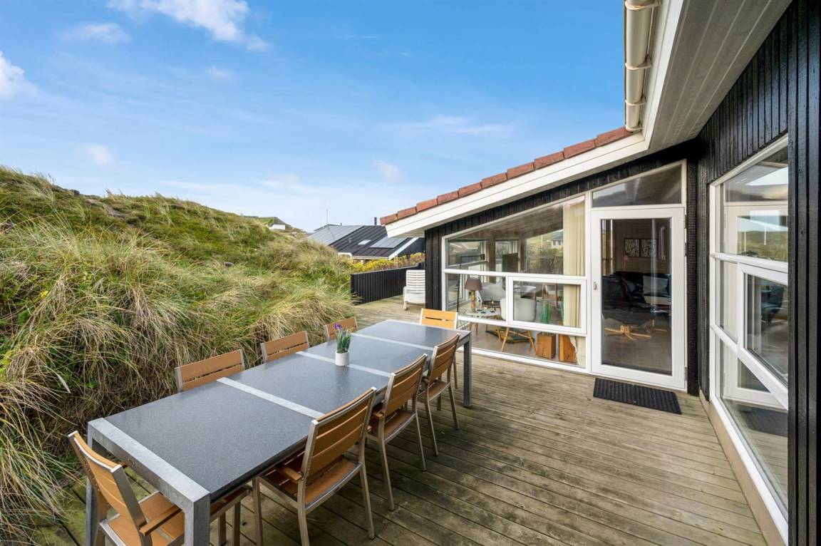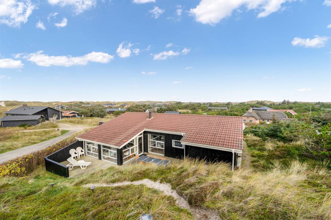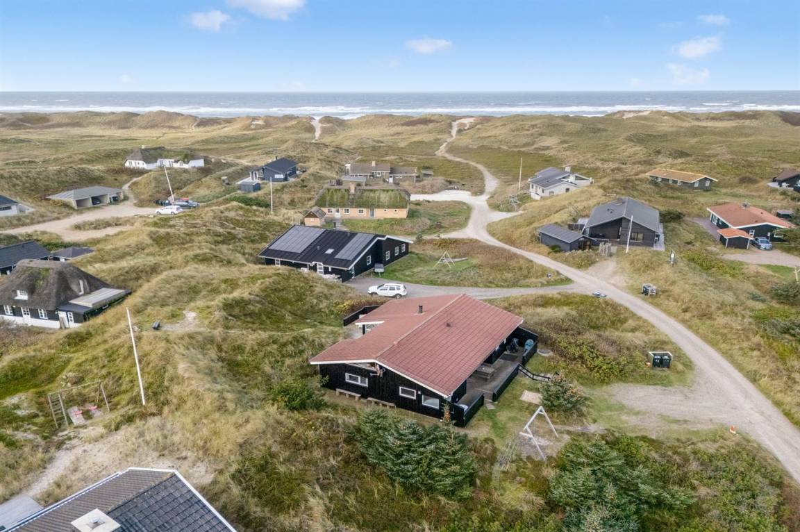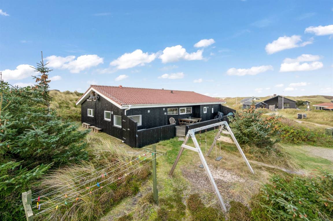 Schönes Ferienhaus aus Holz, 1993, auf einem hügeligen Dünengrundstück gelegen, nur 250 m vom Strand entfernt. Meeresblick vom höchsten Punkt des Grundstücks. Zum Haus gehören 2 schöne Terrasse mit gutem Windschutz und Gartenmöbeln. Teils Teppichböden und teils Holzböden. Das Haus ist besonders gut eingerichtet, mit u.a. 2 Badezimmern. Im großen Badezimmer gibt es 2-Pers. Whirlpool, Duschnische und Fußbodenheizung. Von hier direkter Zutritt zur Sauna. Extra Badezimmer mit Duschnische und Fußbodenheizung. Die Küchenabteilung ist mit Geschirrspüler, Tiefkühlgerät, Mikrowelle, Warmluftofen und Herd mit Ceran-Feld ausgestattet. Im gemütlichen Wohnzimmer finden Sie Kaminofen, Stereoanlage mit CD-Spieler sowie 55" TV mit digitalem Satellitenanschluss, DVD-Spieler und vintage Spielkonsole Super Nintendo. An weiterer Ausstattung können kostenlose, kabellose Internetverbindung (eigener Computer muss mitgebracht werden), Radio, Waschmaschine, Wäschetrockner, 2 Kinderbetten und Kinderhochstuhl erwähnt werden. 4 schöne Schlafzimmer mit gutem Schrankplatz. Ferner hat das Haus 2 offene Obergeschosse, das eine mit 2 Schlafplätzen und Meeresblick sowie 32" TV mit Chromecast und vintage Spielkonsole Nintendo - hier können es sich die etwas größeren Kinder so richtig gemütlich machen (Schaumgummimatratzen - nicht aus dem Grundriß ersichtlich). Sandkasten und Schaukel. Das Haus liegt in einem ruhigen und naturschönen Gebiet mit guten Aktivitätsmöglichkeiten - nur wenige min. Fahrt vom Badeort Søndervig entfernt.